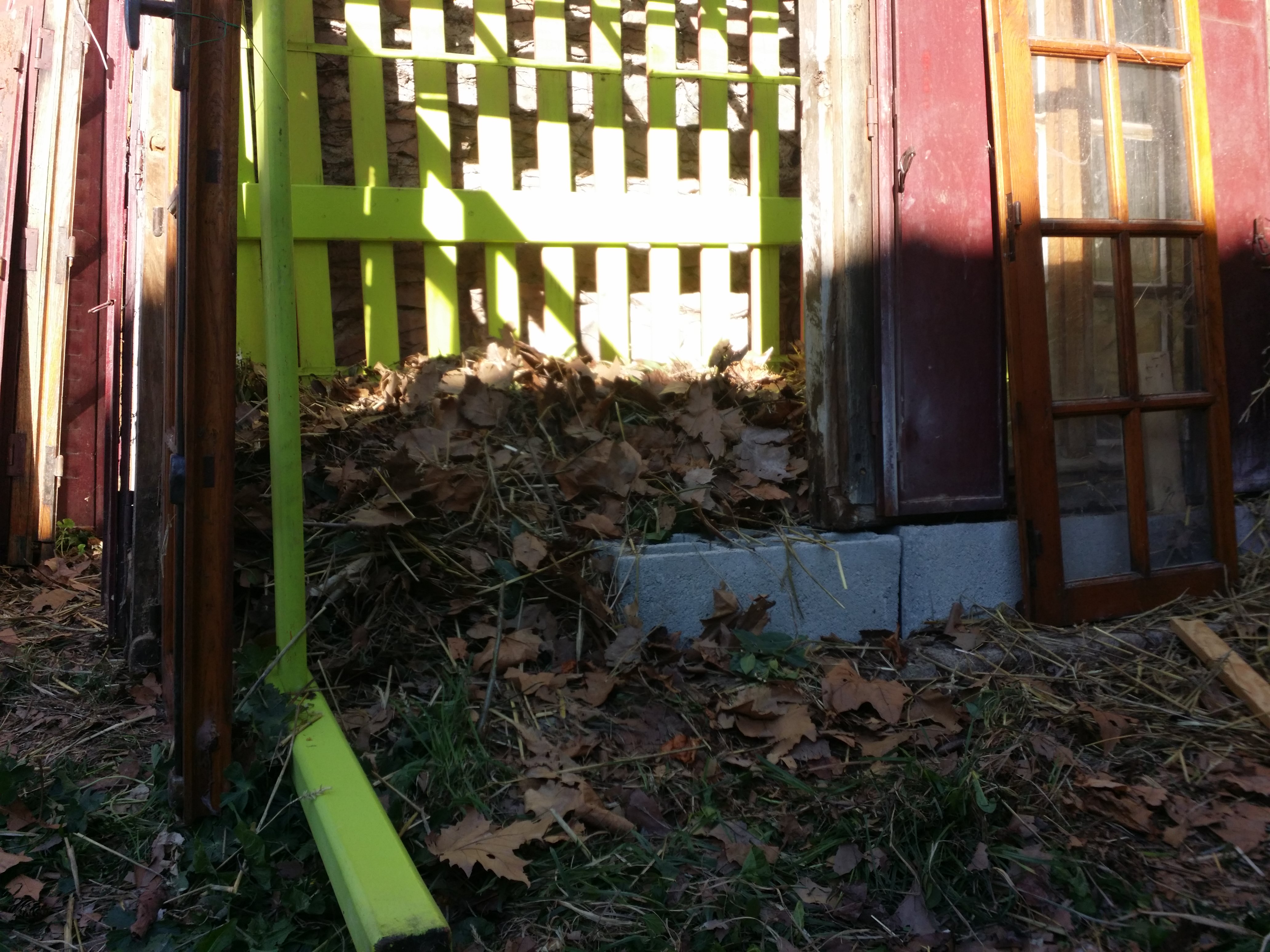 On l'a remplie de déchets verts frais (des feuilles d'un arbre qu'il a fallu couper) et de déchets verts secs (les feuilles mortes qu'il a fallu virer pour placer la serre), dans une tentative de créer une couche chauffante (normalement, imbibé d'eau, ça commence à composter fort et ça chauffe). Comme on n'a pas eu envie de se lever la nuit pour vérifier, et qu'il fait chaud le jour, on sait pas trop si ça marche un peu ou pas du tout ; mais qu'importe, il y fait chaud, c'est ce qui compte !