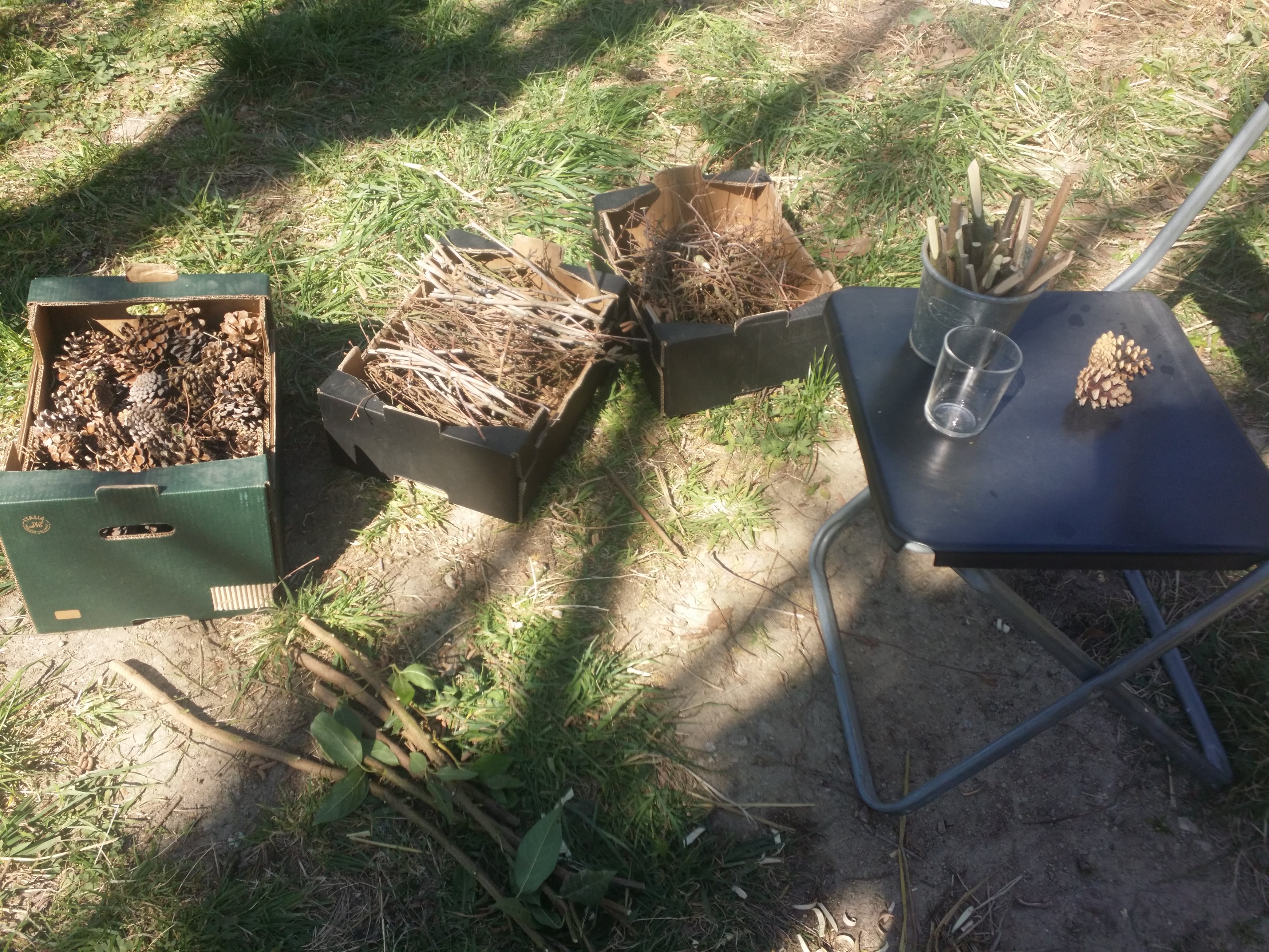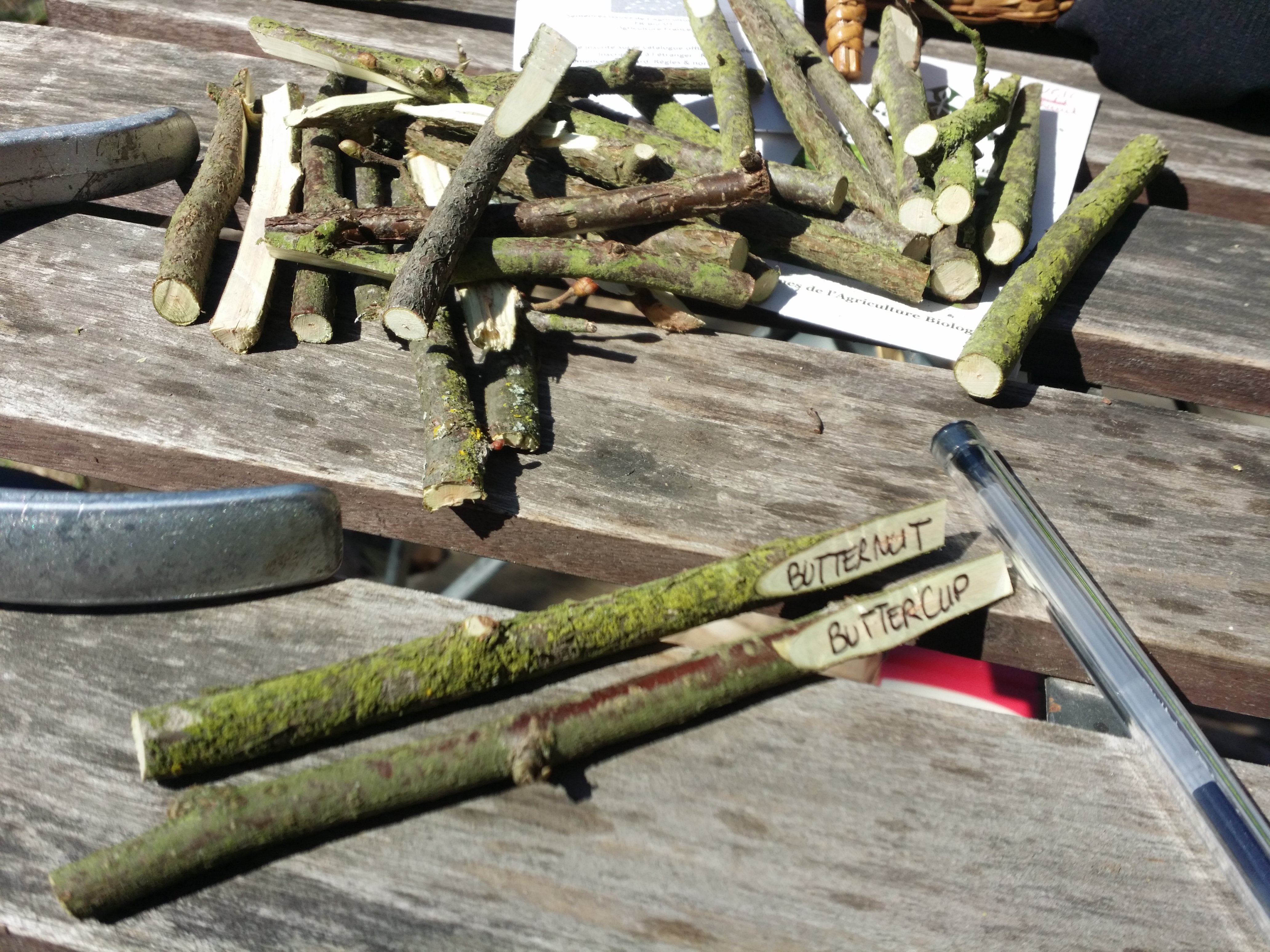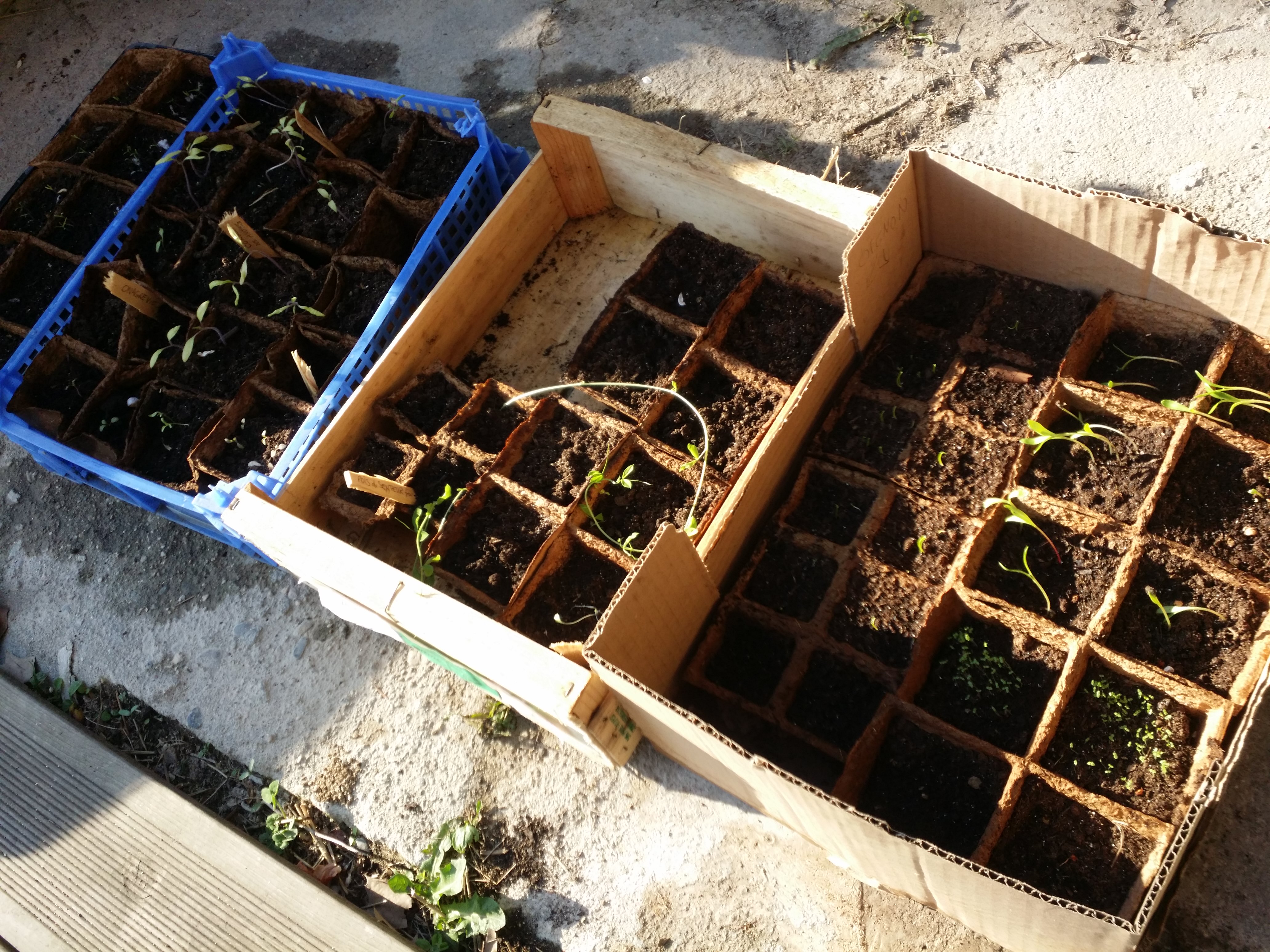 Du coup, la plupart des semis sont partis dedans, ce qui fait vachement plus de place autour des porte-fenêtres de la maison ! Et comme on a refait des semis, et qu'on n'a plus de cagettes pour faire des étiquettes, il a fallu trouver un plan B : des bouts de branches partiellement écorcés, pour pouvoir y écrire au stylo bille.