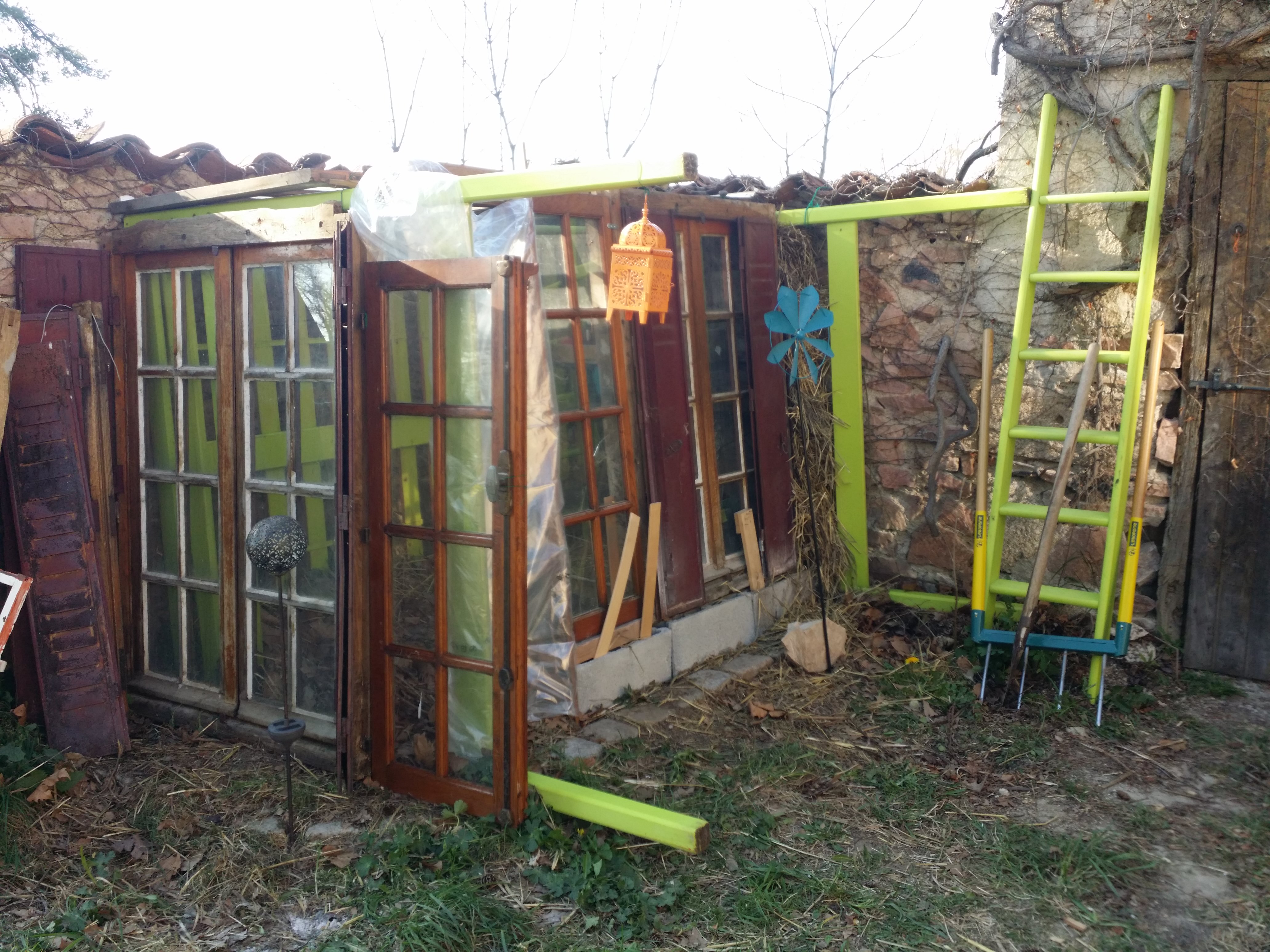 Du coup... Y'a des trous qui naissent et des trucs qui poussent. Pas que du végétal ! On commence par le Grand Oeuvre du Confinement, j'ai nommé la Serre Avec Ce Qu'on A Sous La Main ! (Attention, mes derniers neurones se sont sacrifiés dans l'opération : apprécie).