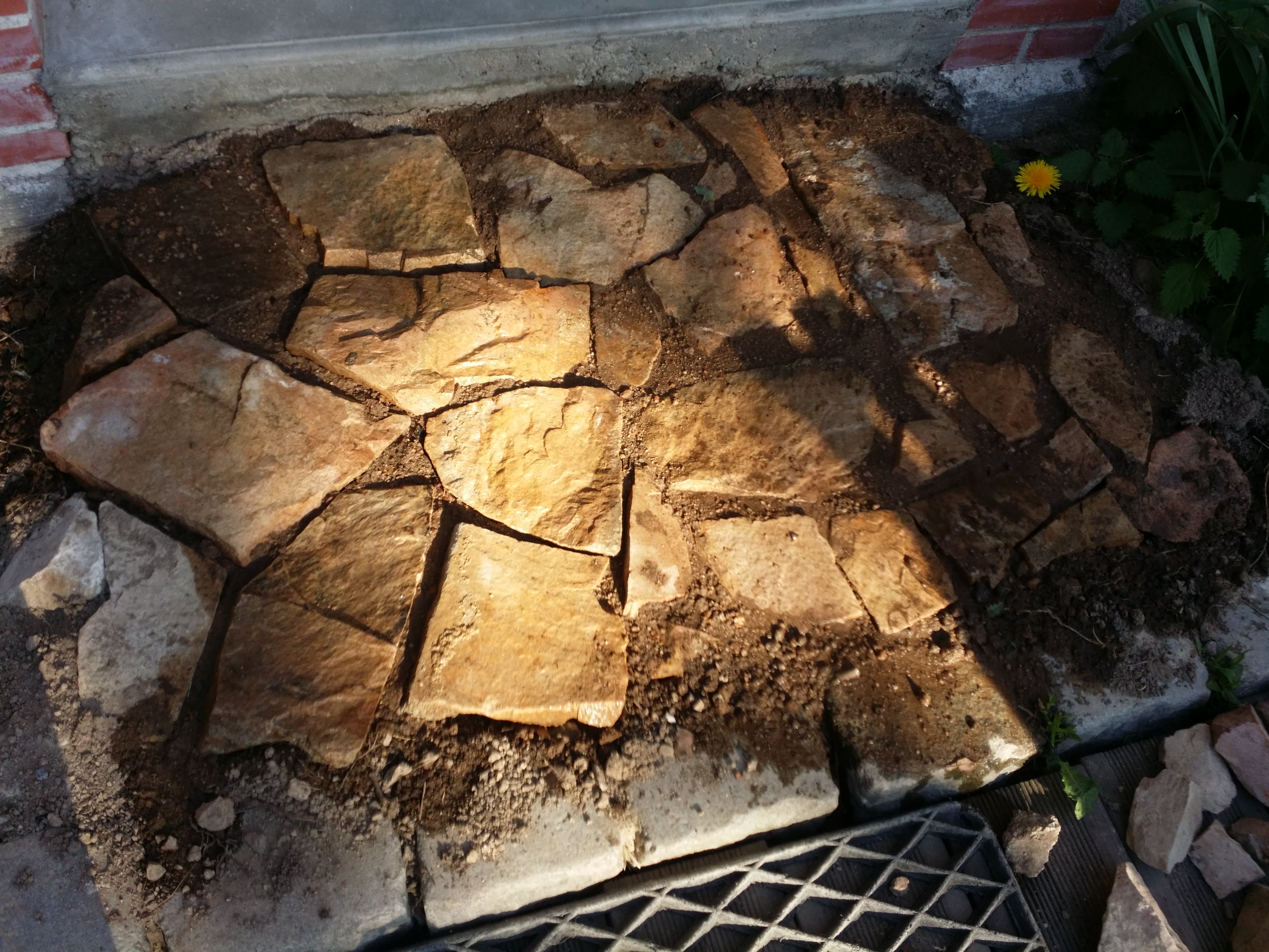 ... Et puisqu'on a commencé à jouer avec le tas de cailloux, on a remplacé la palette-marche-d'entrée par des pierres, et puis c'était bien mais pas parfait, alors on a recommencé et c'est mieux (mais ça bouge encore, alors faudra se renseigner sur comment solidifier sans sceller, mais ça sera pour quand les neurones seront revenus de vacances).