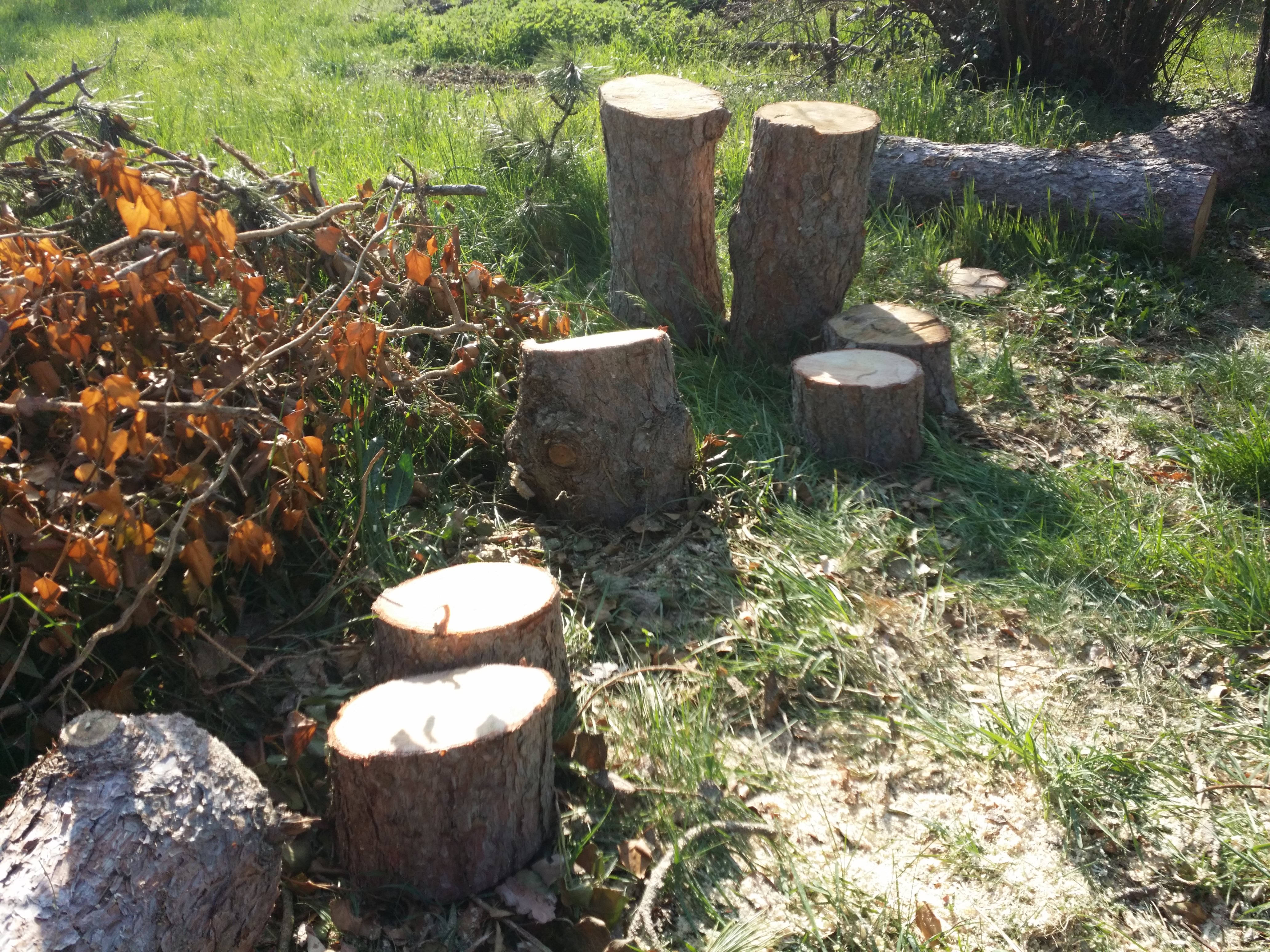 Puisqu'on a du acheter une tronçonneuse pour pouvoir se chauffer, on s'amuse un peu avec en recoupant le grand arbre coupé il y a quelques mois ; tout ça va devenir, à voir, des sièges et bancs de jardin, pas japonais...