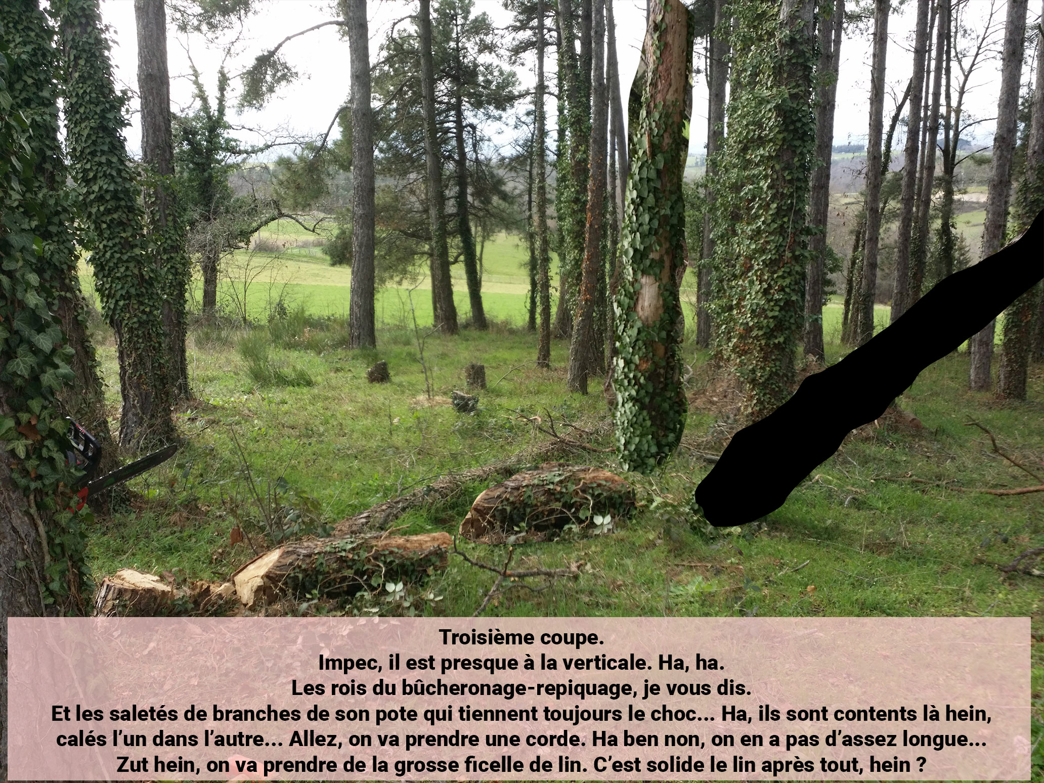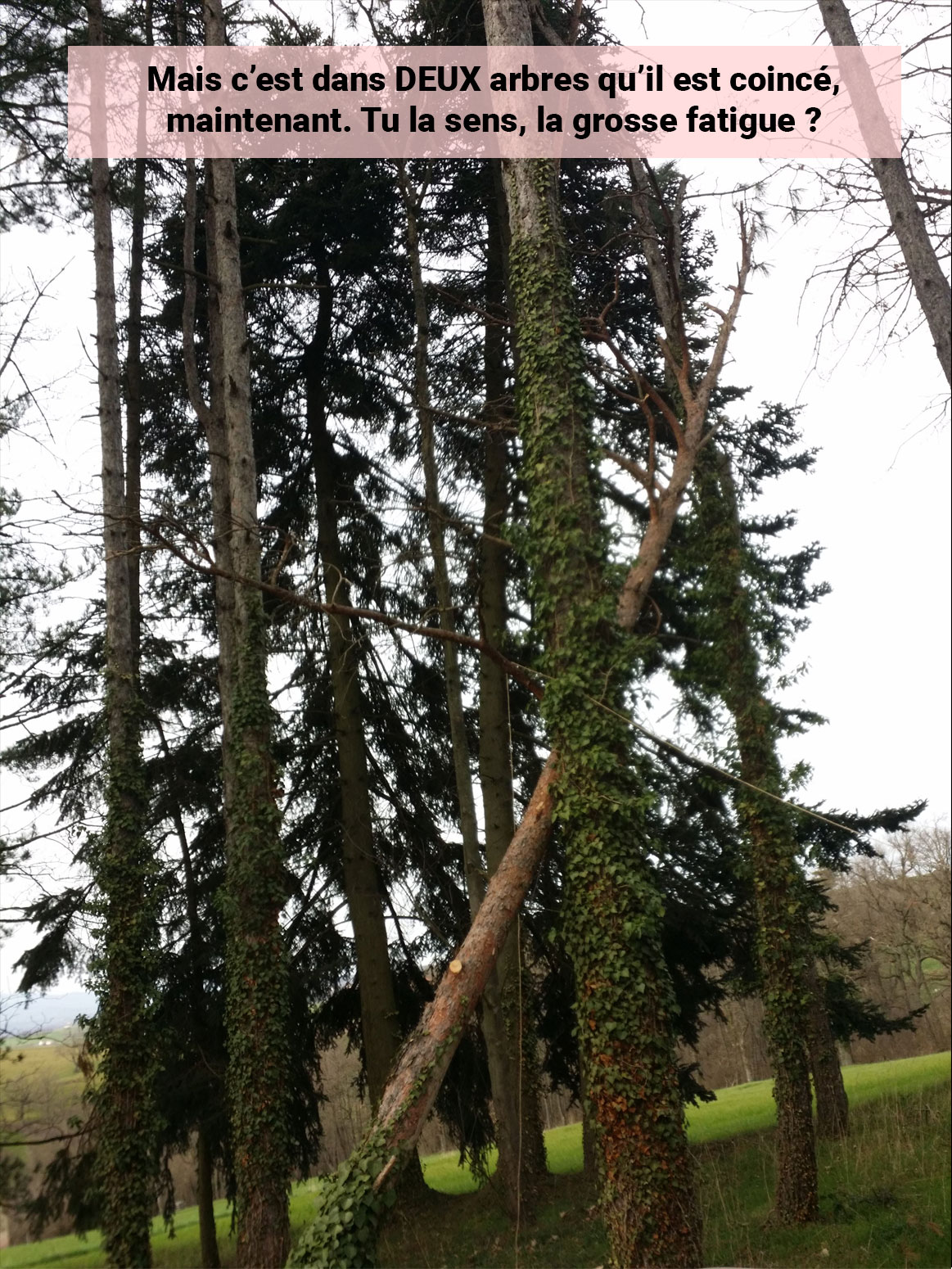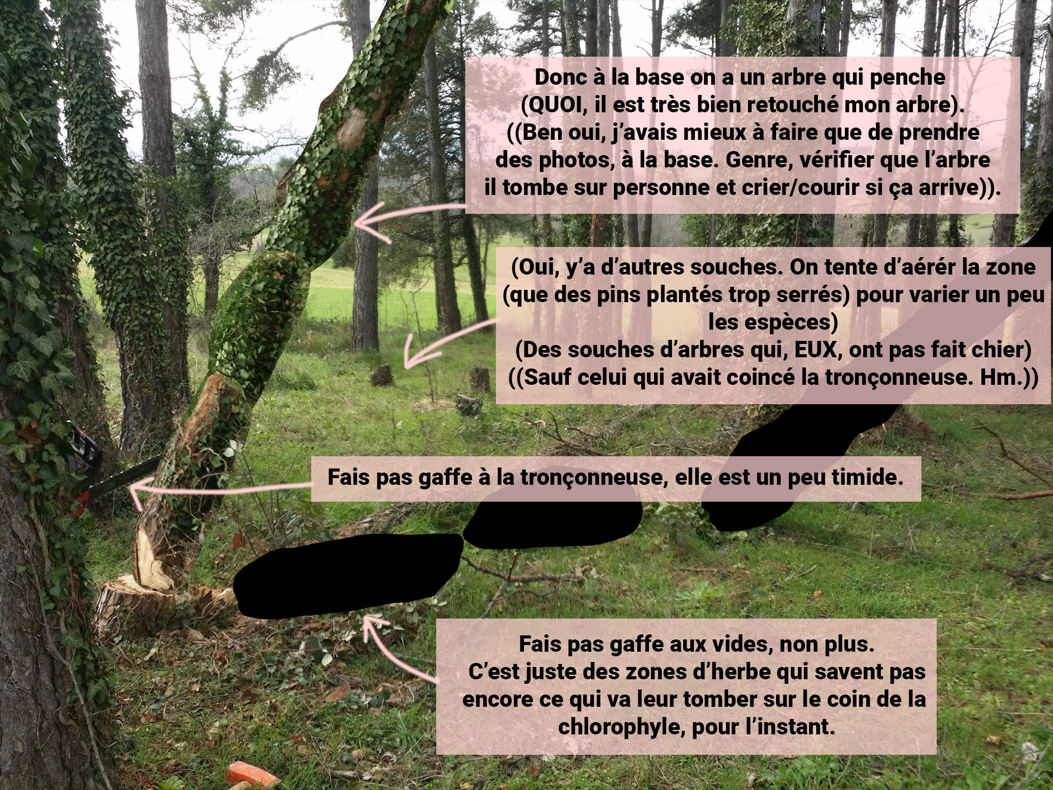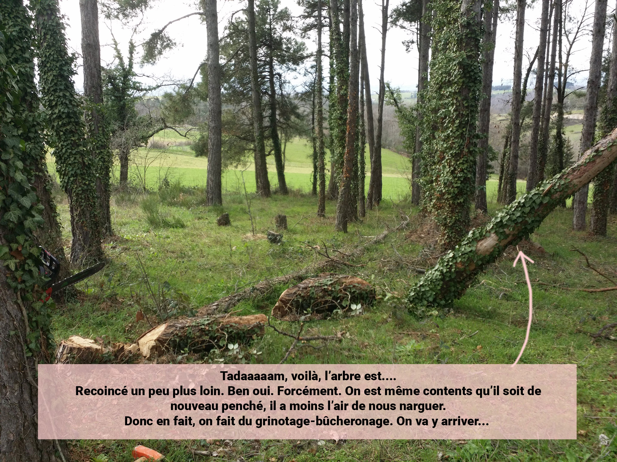 Allez, et pour finir, je vais te raconter l'histoire du pin (pourtant déjà à demi-déraciné) qui récalcitre, parce que quand même, il est annoncé dans le titre... Et pour la peine j'ai même fait des photomontages de fou, avec des légendes et tout. Ouais. Hop, roman-photo. (Ce qu'on ferait pas pour s'occuper, quand on est cloué au canapé... )