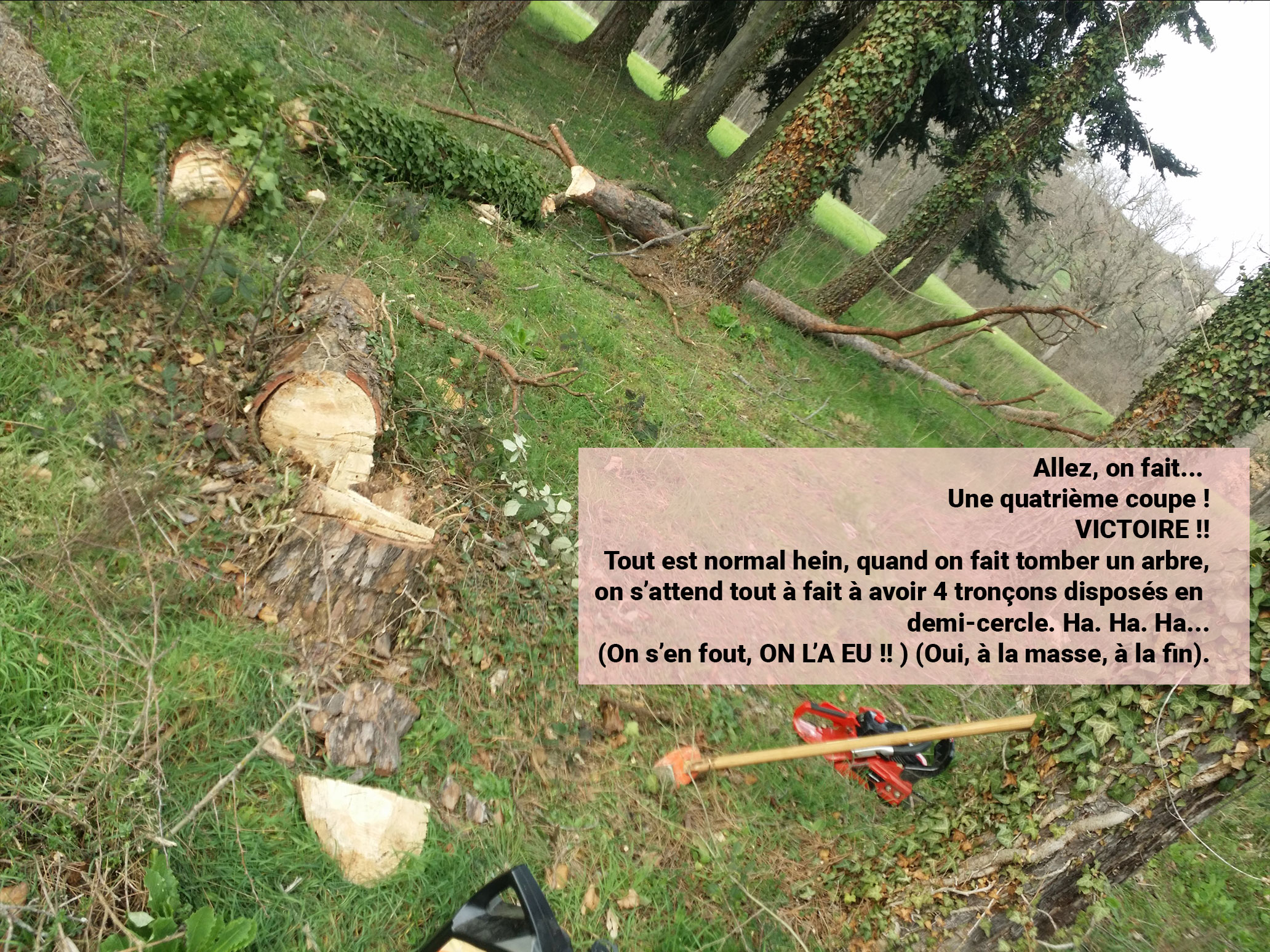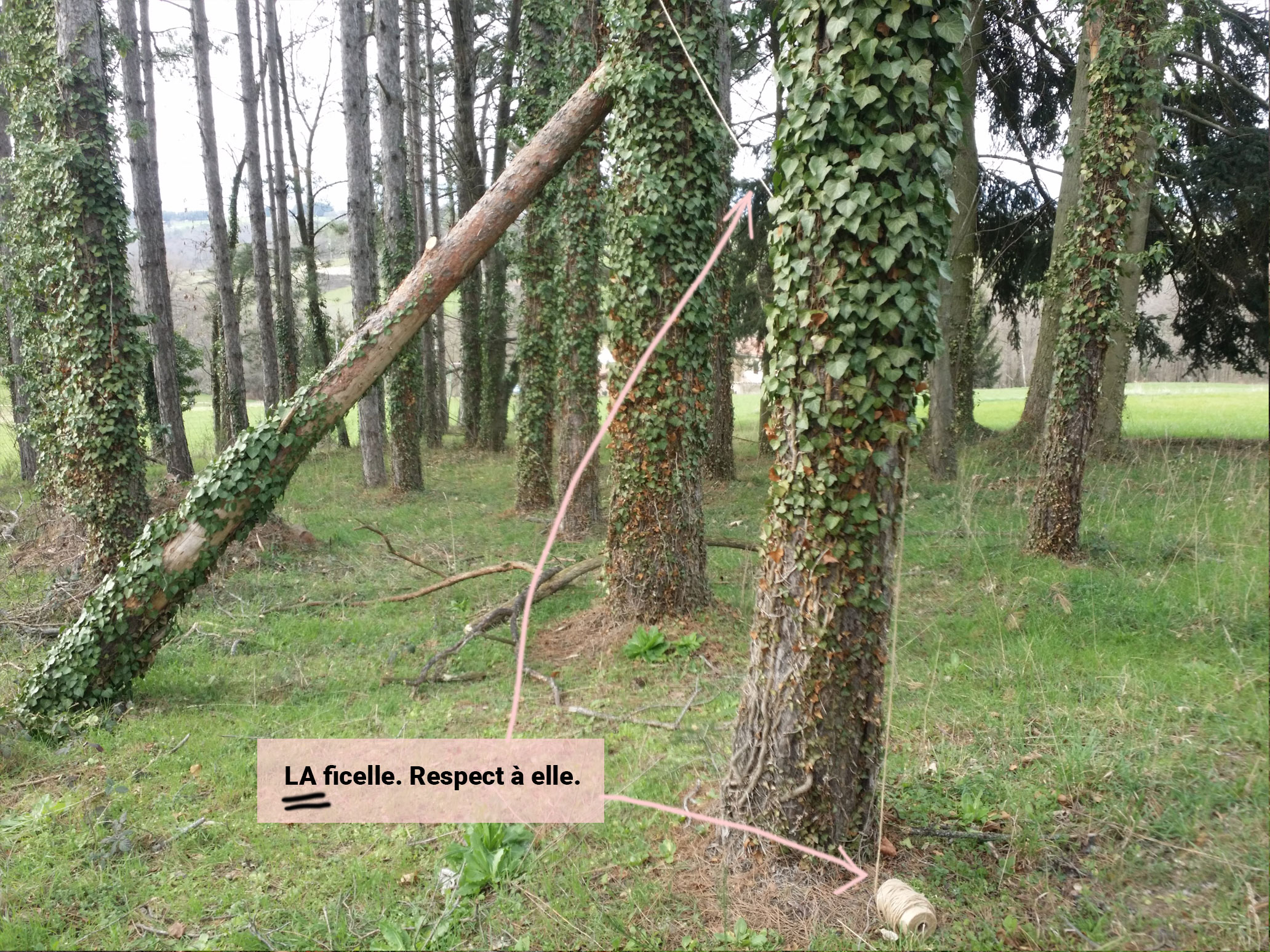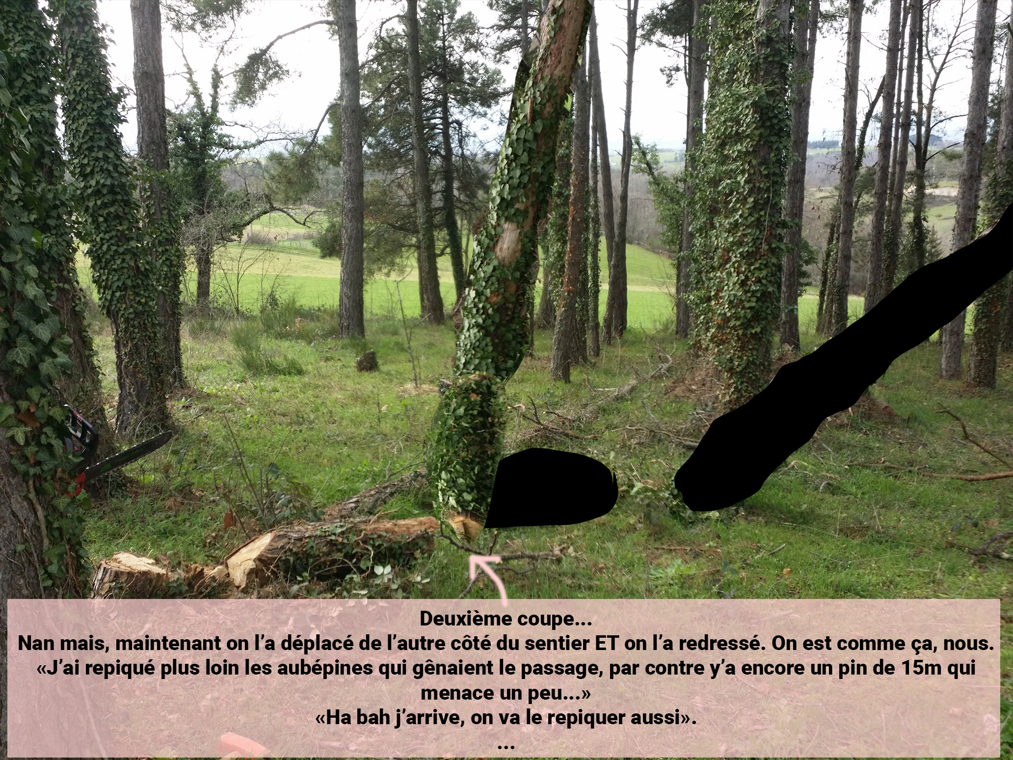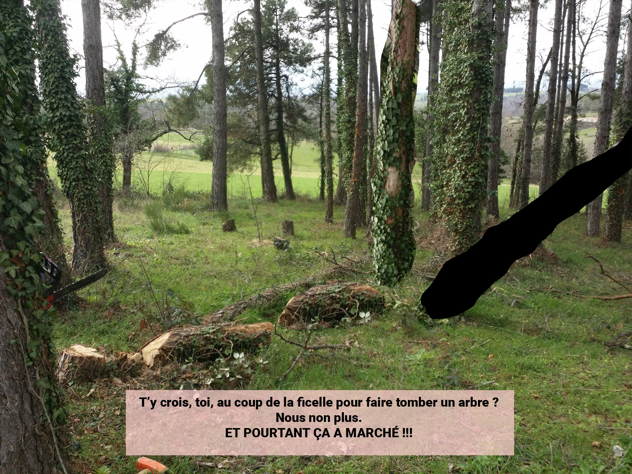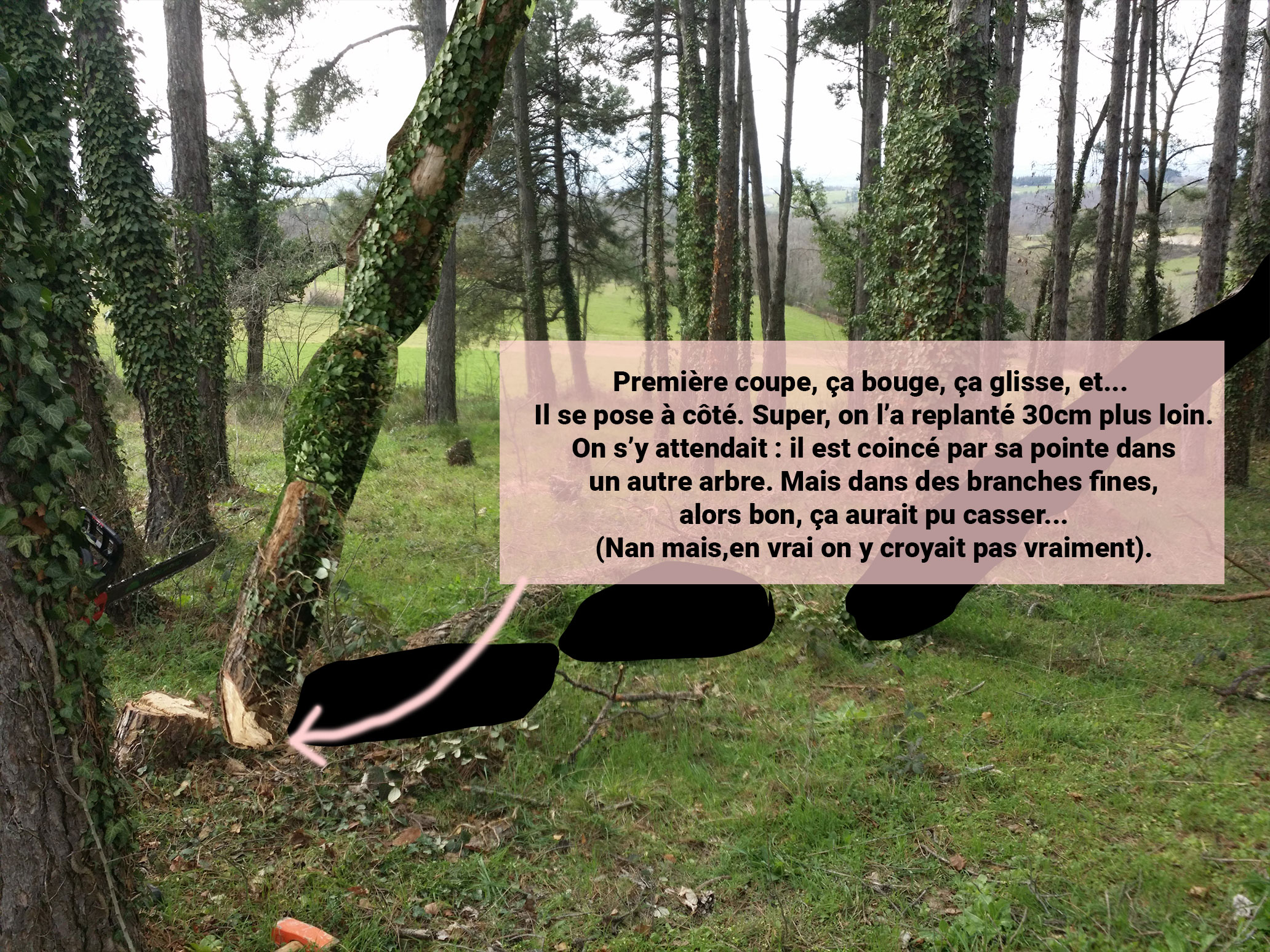 Allez, et pour finir, je vais te raconter l'histoire du pin (pourtant déjà à demi-déraciné) qui récalcitre, parce que quand même, il est annoncé dans le titre... Et pour la peine j'ai même fait des photomontages de fou, avec des légendes et tout. Ouais. Hop, roman-photo. (Ce qu'on ferait pas pour s'occuper, quand on est cloué au canapé... )