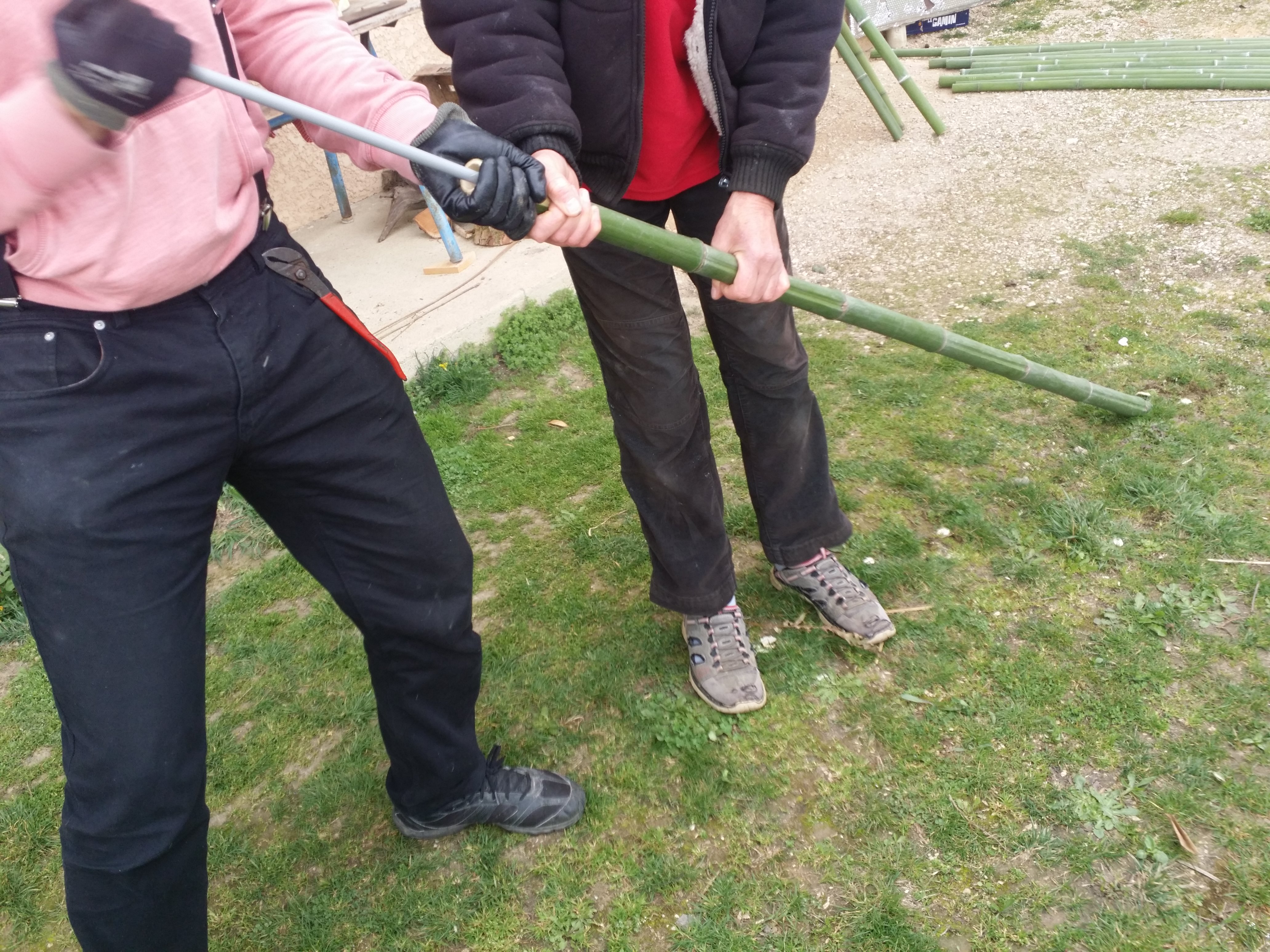 Une fois rapatriés, les bambous doivent encore être percés : en séchant, ils peuvent se fendre ; pour réduire ce risque, on peut percer les cloisons qui se trouvent à chaque nœud, pour avoir un seul long tube où l'air circule (à priori c'est une histoire de meilleure ventilation). C'est pas évident, il faut être à deux par bambou, l'un.e qui tient et l'autre qui perce, avec une longue tige (ici des tubes en métal) sur lesquelles on tape au marteau (ou bien qu'on bourrine à la main, selon les préférences de chacun... :p )