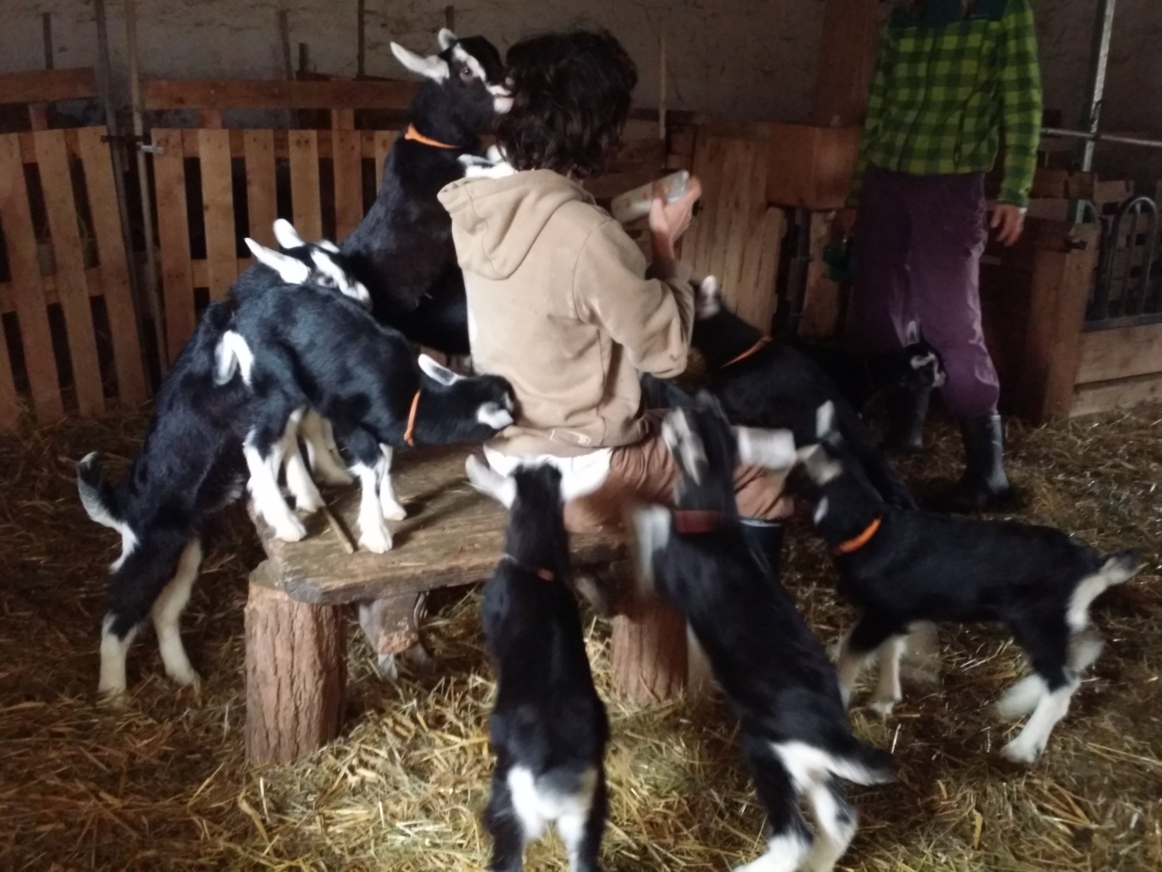 Avec mon indic-Violette, on a profité de la virée pour aller chercher un peu de fumier de chèvres à côté (bio-locale-tout-ça bien sûr), et on est tombées à l'heure du biberon des chevreaux et chevrettes, du coup on a accepté la proposition de traîner par là ; bon, moi j'ai pas tenté le biberon, déjà en restant debout, 14 petits bolides bêlants et qui tètent tout ce qui passe c'est folklo, alors assise... Ben, voilà ce que ça donne :D