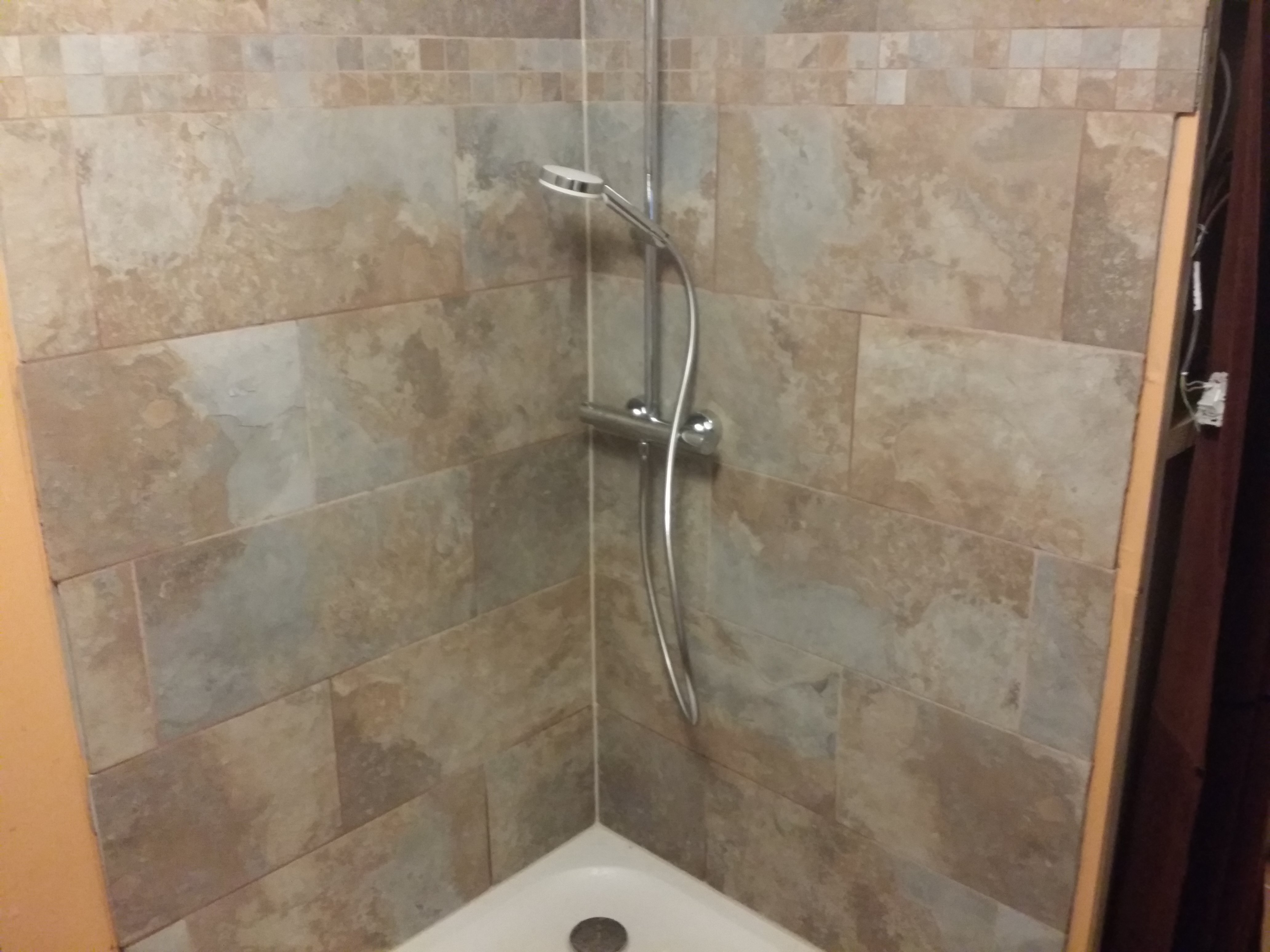 Donc, bon, nos plombiers sont venus (pas totalement à l'improviste cette fois) poser les tant attendus lave-mains, évier de coin craft, et barre de douche. Donc, après avoir regardé une bonne semaine durant notre belle douche, toute prête à être utilisée mais sans robinet-pomme de douche, tu imagines notre joie au moment de pouvoir enfin l'utiliser. Un an sans pouvoir se doucher debout, elle est là, elle est belle... Et elle veut nous tuer. Si-si. En général, une douche, on aime bien ça genre, tiède-clair à chaud, non ? Ben la notre avait deux modes : glacé (plus précisément, à température extérieure au nord de la maison), ou brûlant (plus précisément 60°, la température du chauffe-eau).