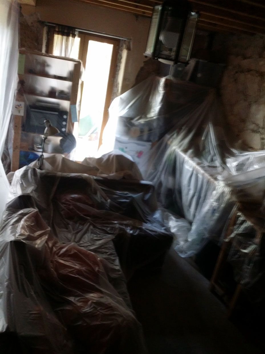 Heureusement on avait bien protégé la demi pièce parce qu’on continue à y vivre. Hé oui, on décroûte les restants de vieux enduits ciment qu’on avait pas eu le temps de finir avant d’aménager, dans notre salon-cuisine…