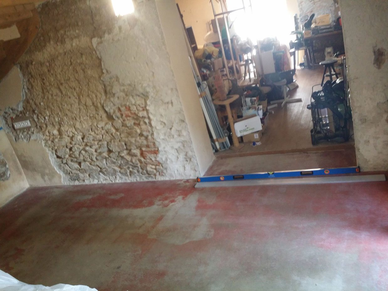 On a laissé des petits morceaux sous l’escalier encore, parce que là bas on soupçonne que ça sera un chantier à part entière, s’il faut réparer le mur qui se mange l’humidité qui arrive par chez le voisin… Bref, on fera l’année prochaine un sas-plastique juste sous l’escalier, et on s’occupera des murs et du sol de ce coin là en une seule fois.