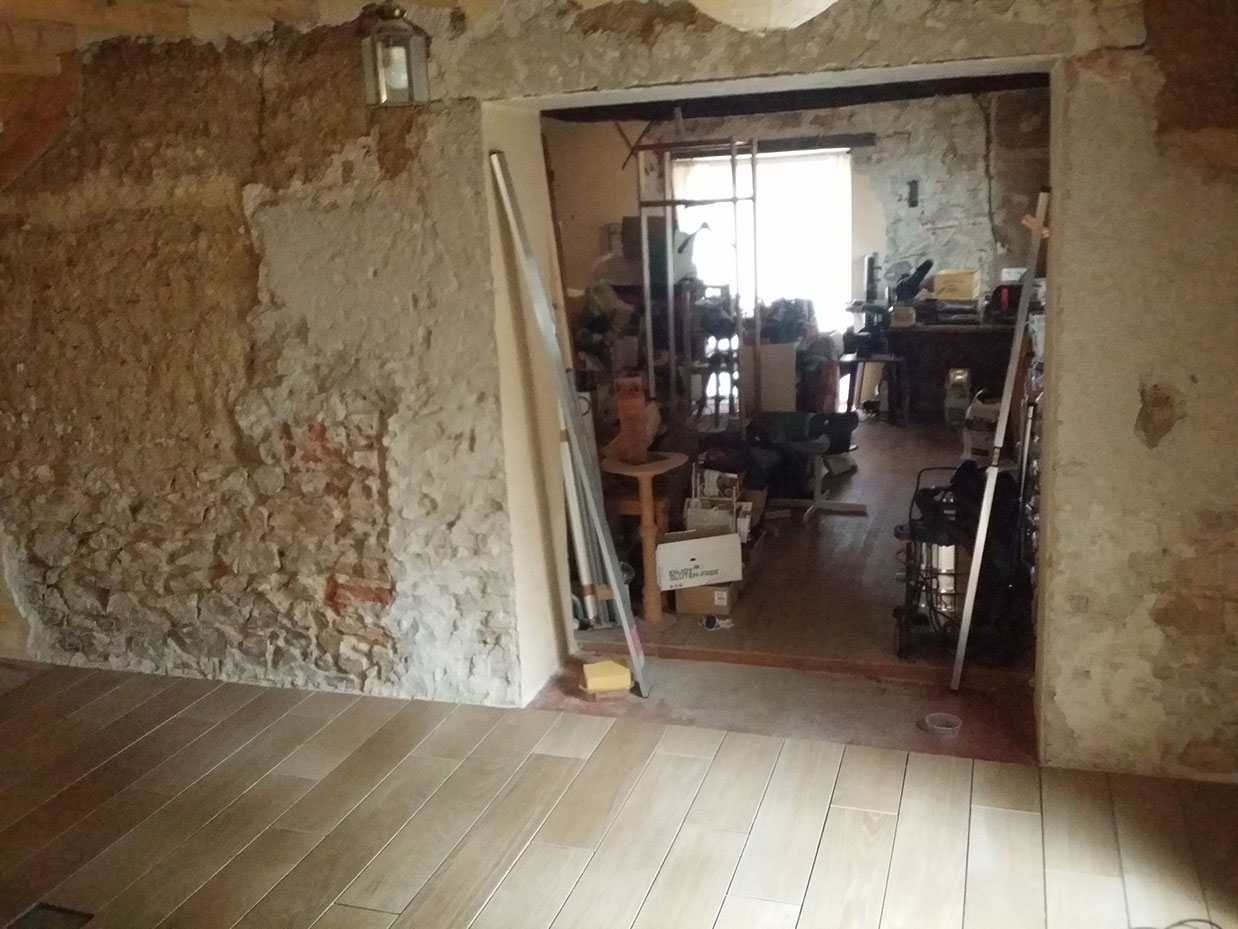 Allez, une photo « avant » où on voit en plus le mur bien décroûté (saut la partie à gauche sous l’escalier ; faut suivre, un peu, là!!) ; et puis la pièce derrière qui a rien compris à pourquoi elle s’est fait totalement bourrer de plein de trucs d’un seul coup…