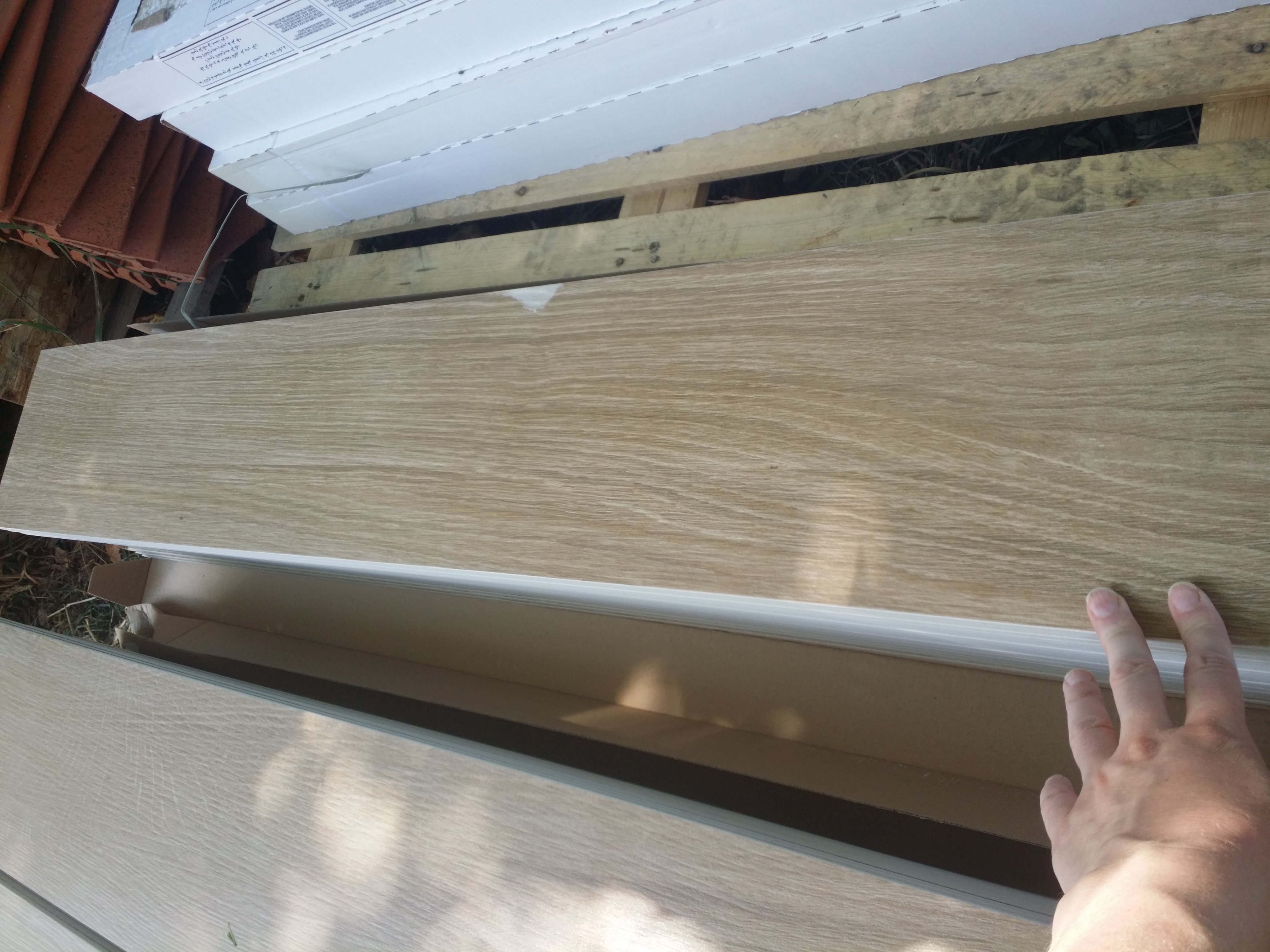 Bon, on a pris un truc vachement facile à poser, des lames de 20x120cm… Hahaha. Pour 30m². Je pourrais dire « j’en ai déjà les genoux qui pleurent rien qu’à y penser» mais en vrai j’en ai déjà fait six heures hier donc c’est plutôt très, très concret, les pleurs de genoux. Enfin plutôt, de cuisses, parce que des grands morceaux comme ça, tu peux pas les déplacer en restant à genoux (enfin moi je peux pas sans perdre mes disques intervertébraux déjà pas en grande forme) ; du coup je squatte et je canarde. Donc c’est mes cuisses, qui pleurent. Les genoux se fichent bien de leurs tronche d’ailleurs.