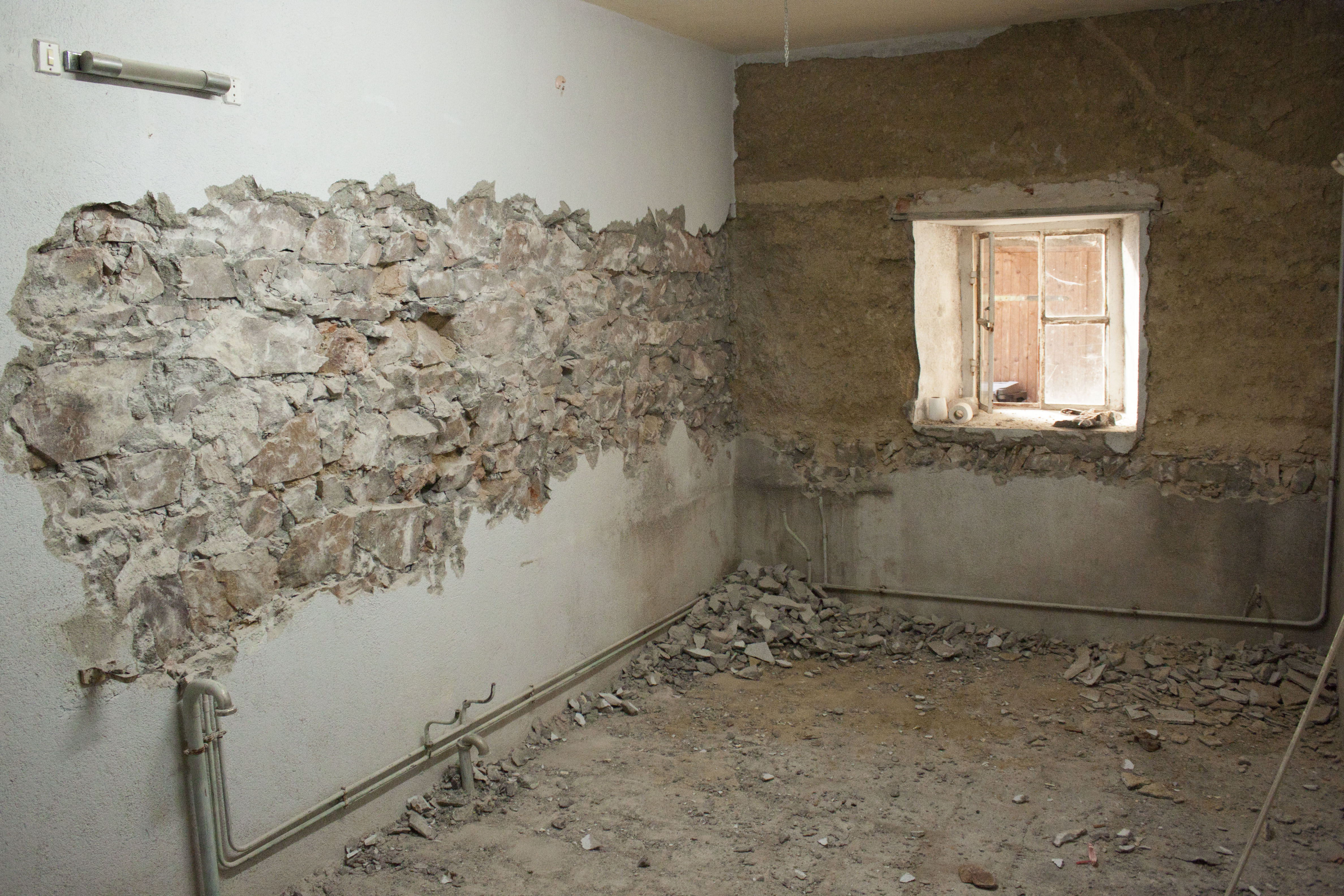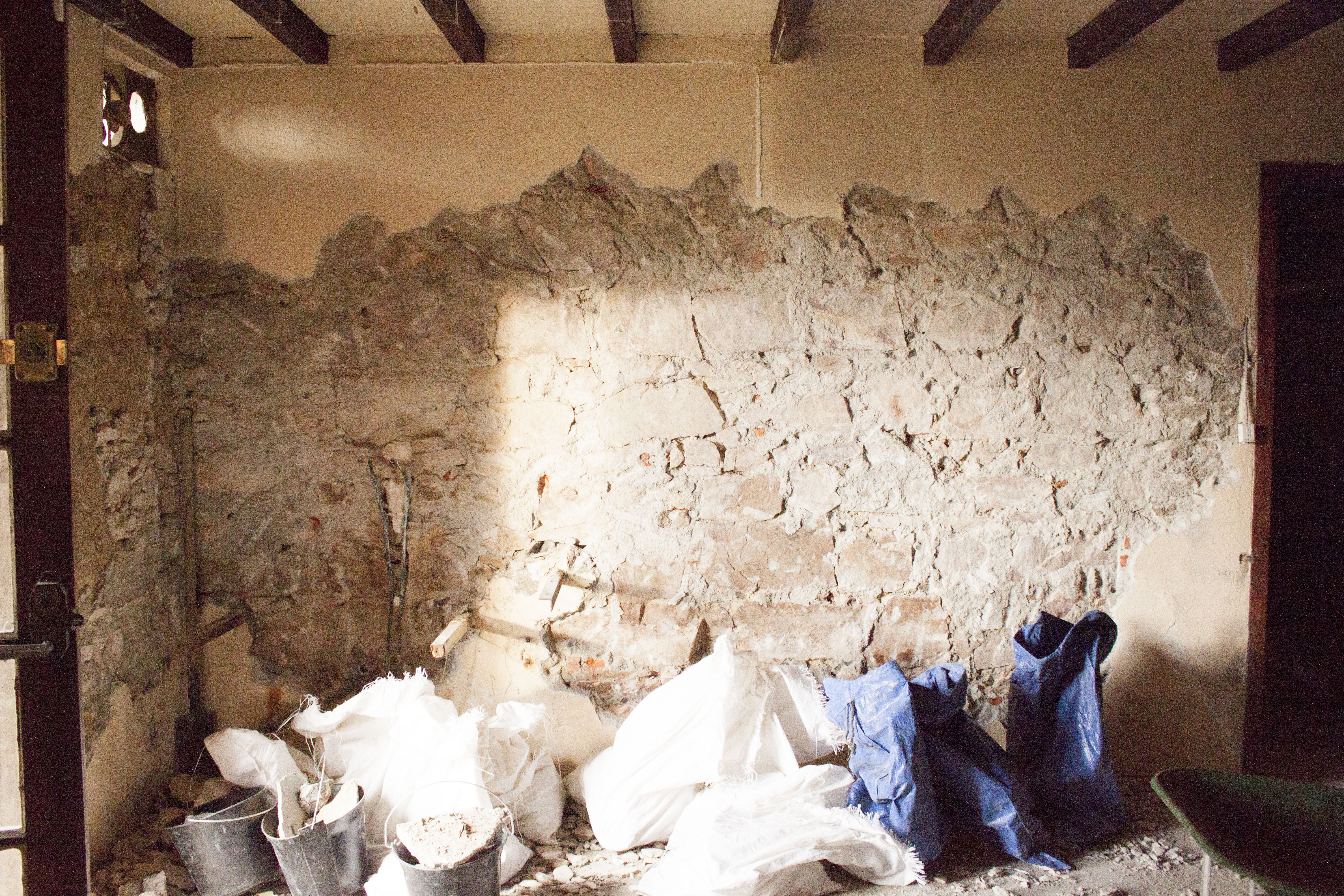 Le même mur en pierres sur son autre face (futur coin cuisine), tout aussi pénible, et qui génère là aussi une quantité indécente de gravats...