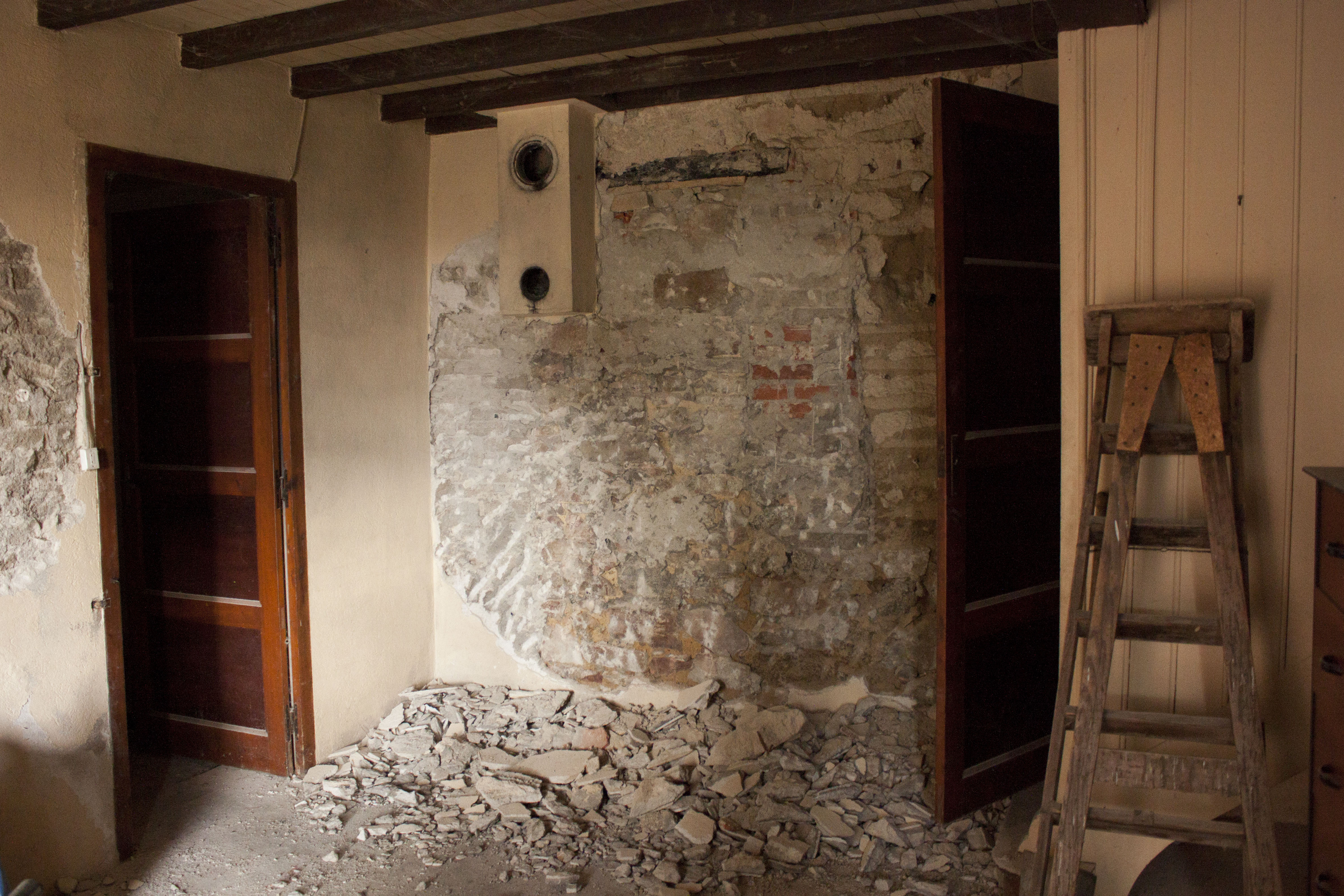 Un autre bout de mur incohérent (pierre puis brique puis pisé) prêt à recevoir le poêle après travaux sur le conduit :