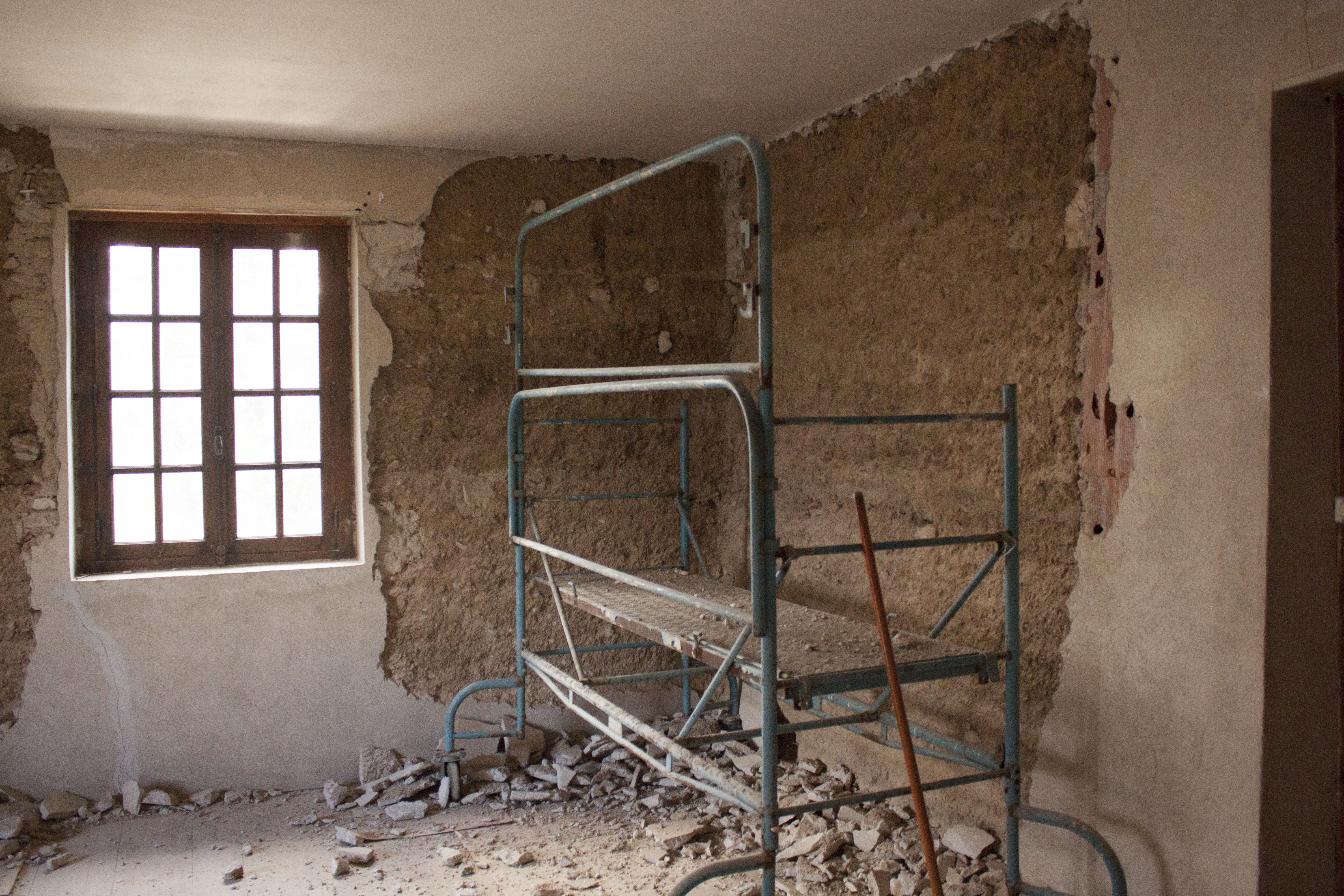Une pièce complète "facile", à l'étage, sera bientôt finie grâce au petit échafaudage ; c'est par contre une logistique certaine pour pouvoir le déplacer (haut de mur 1 fini, déplacer la bête vers le mur 2 en face, ramasser les gravats mur 1, pour y ramener la bête pour l'autre angle pendant qu'on pelte le mur 2... Et ainsi de suite).