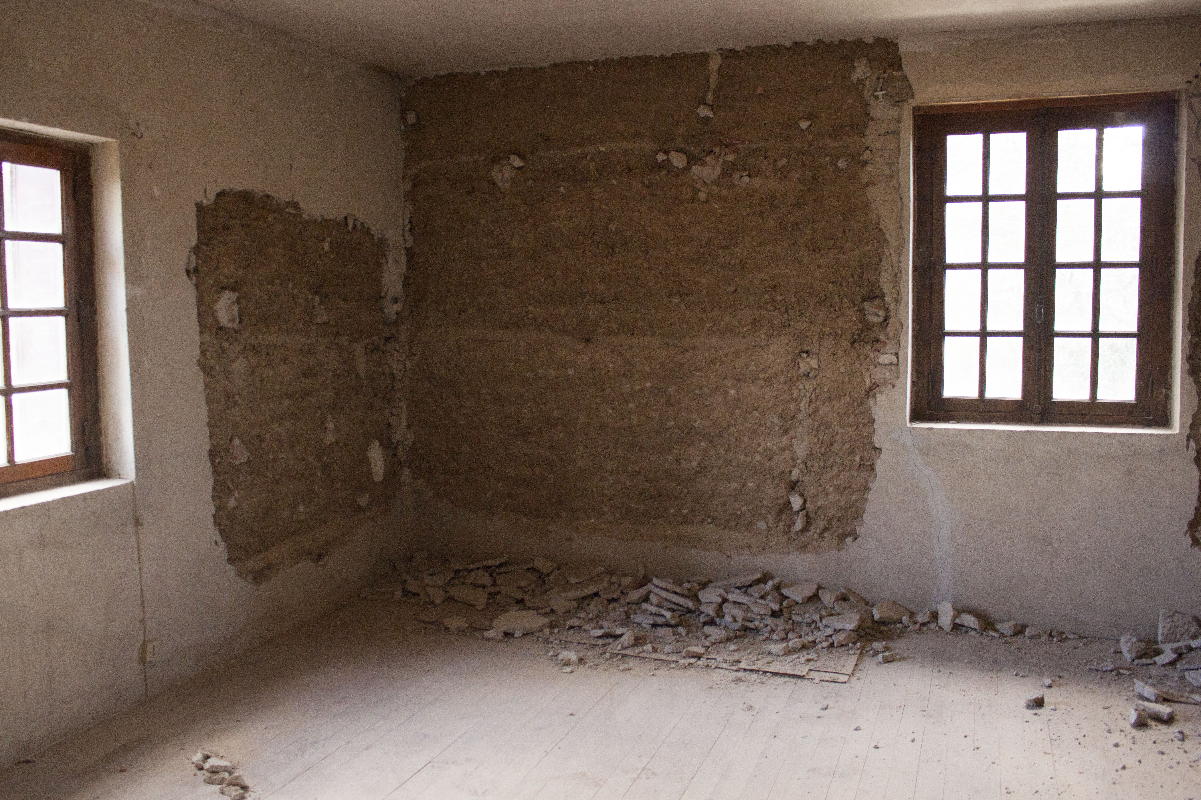 Salle de bains presque prête pour futurs travaux de plomberie (un mur en pisé pas chiant, un autre en pierre, hm... intéressant.)