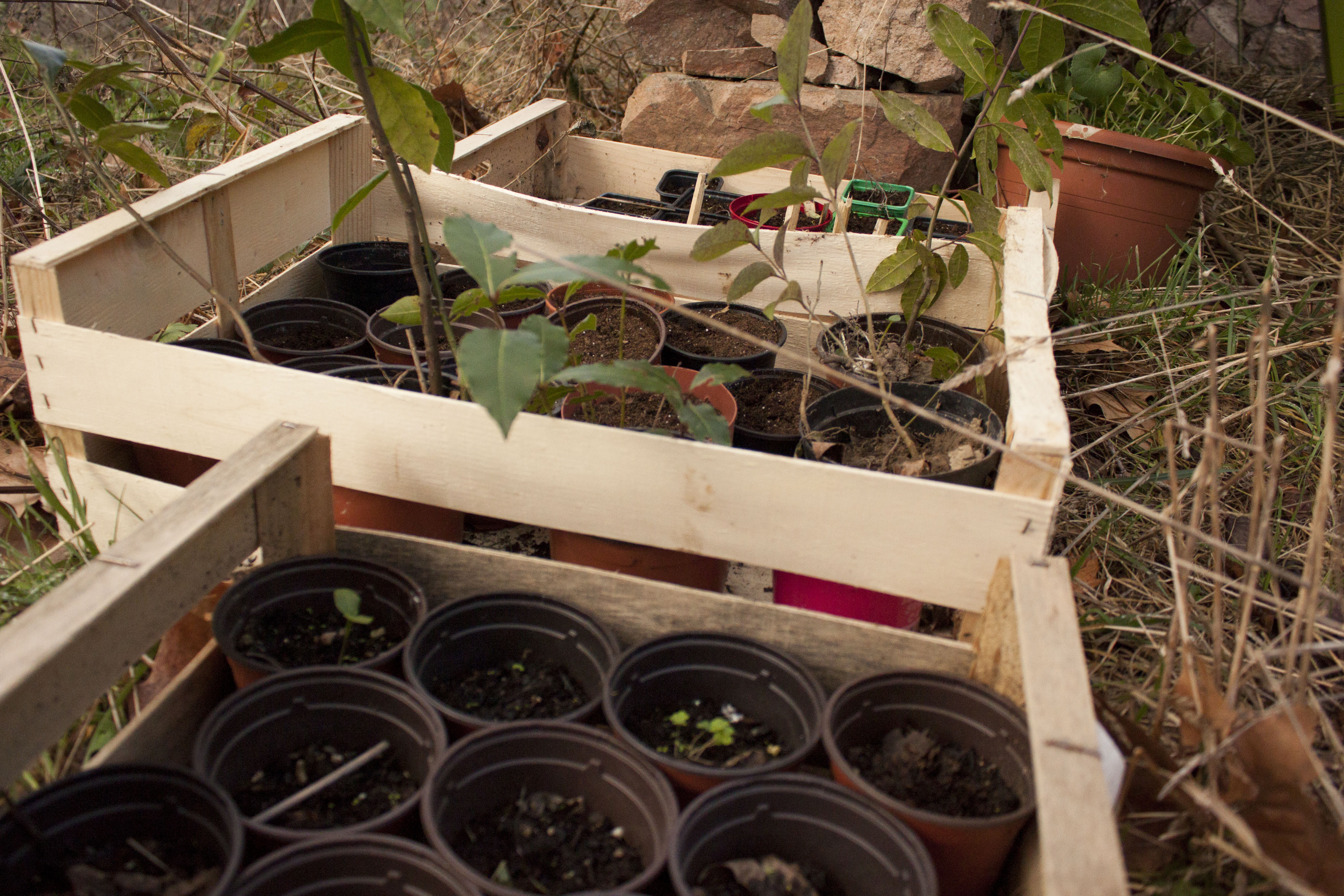 Installation quelques mètres plus près de la maison (tant mieux !), juste à côté des petites mâches qui poussent tranquillement. Dans le détail, pour le moment, on a, directement posées sur l'herbe après un coup de grelinette :
