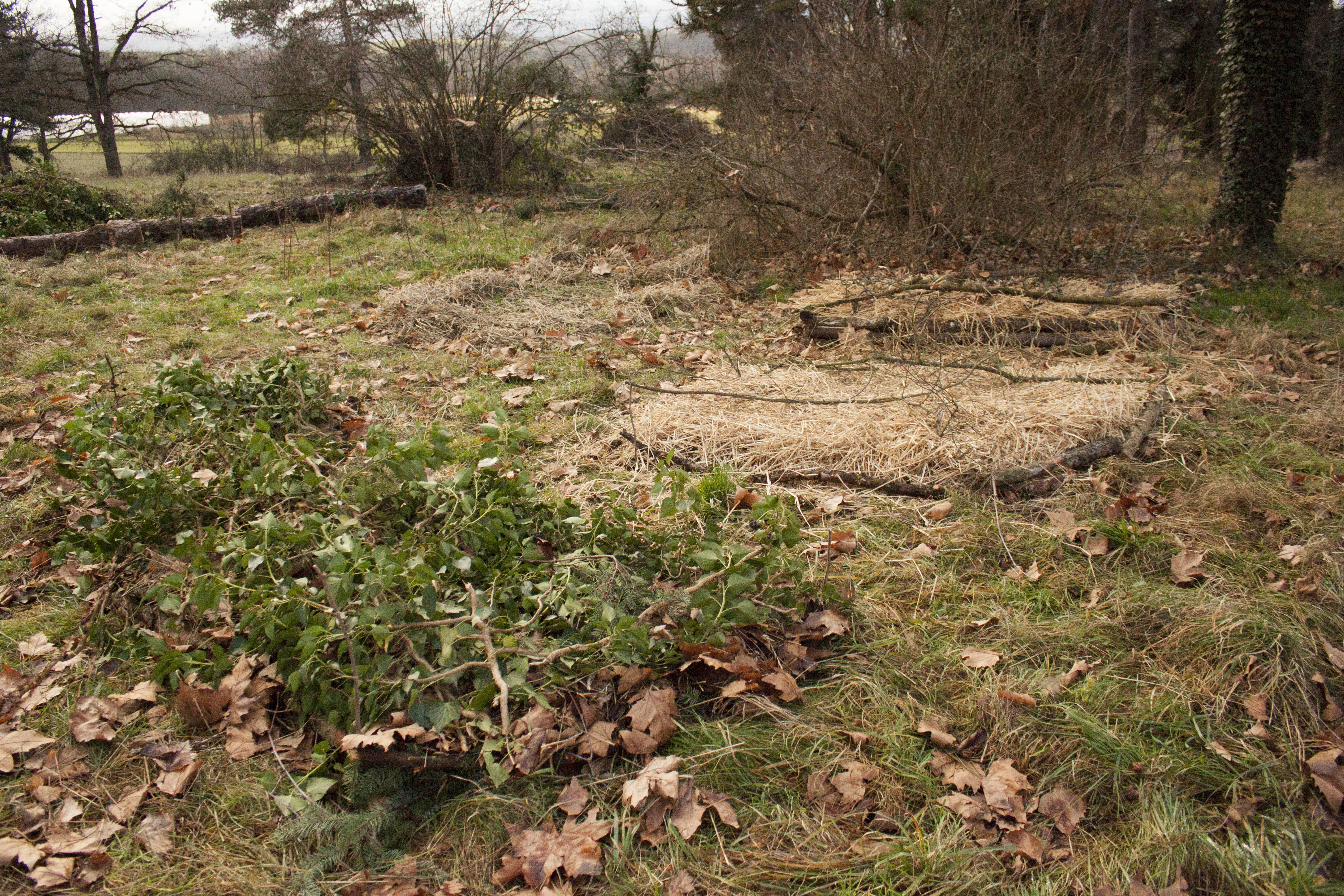 Le tout entouré de branches pour les retrouver et éviter que ça ne s'étale trop, et recouvert de branchettes pour empêcher les paillages de s'envoler. Rendez-vous dans quelques mois pour les plantations là dedans !