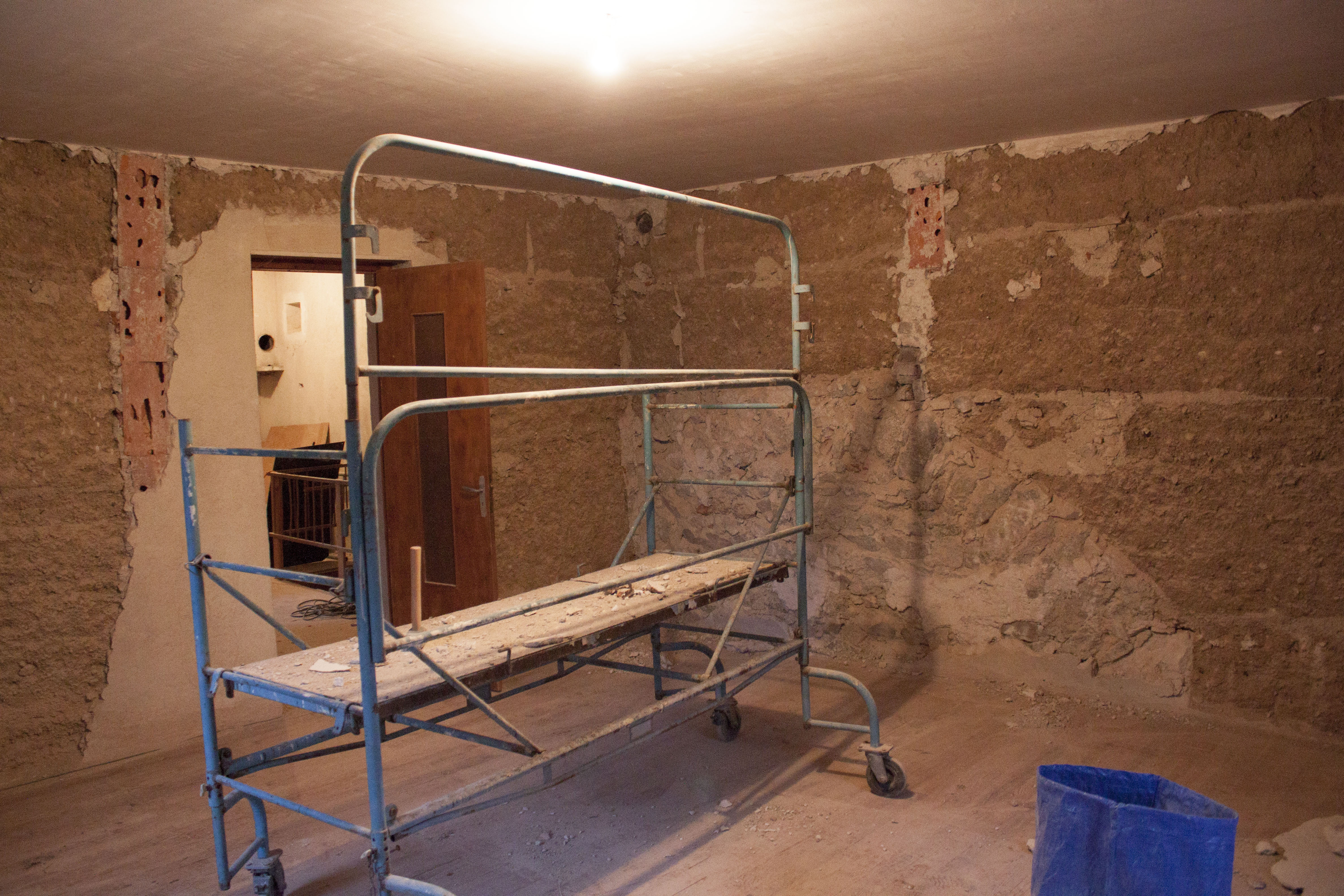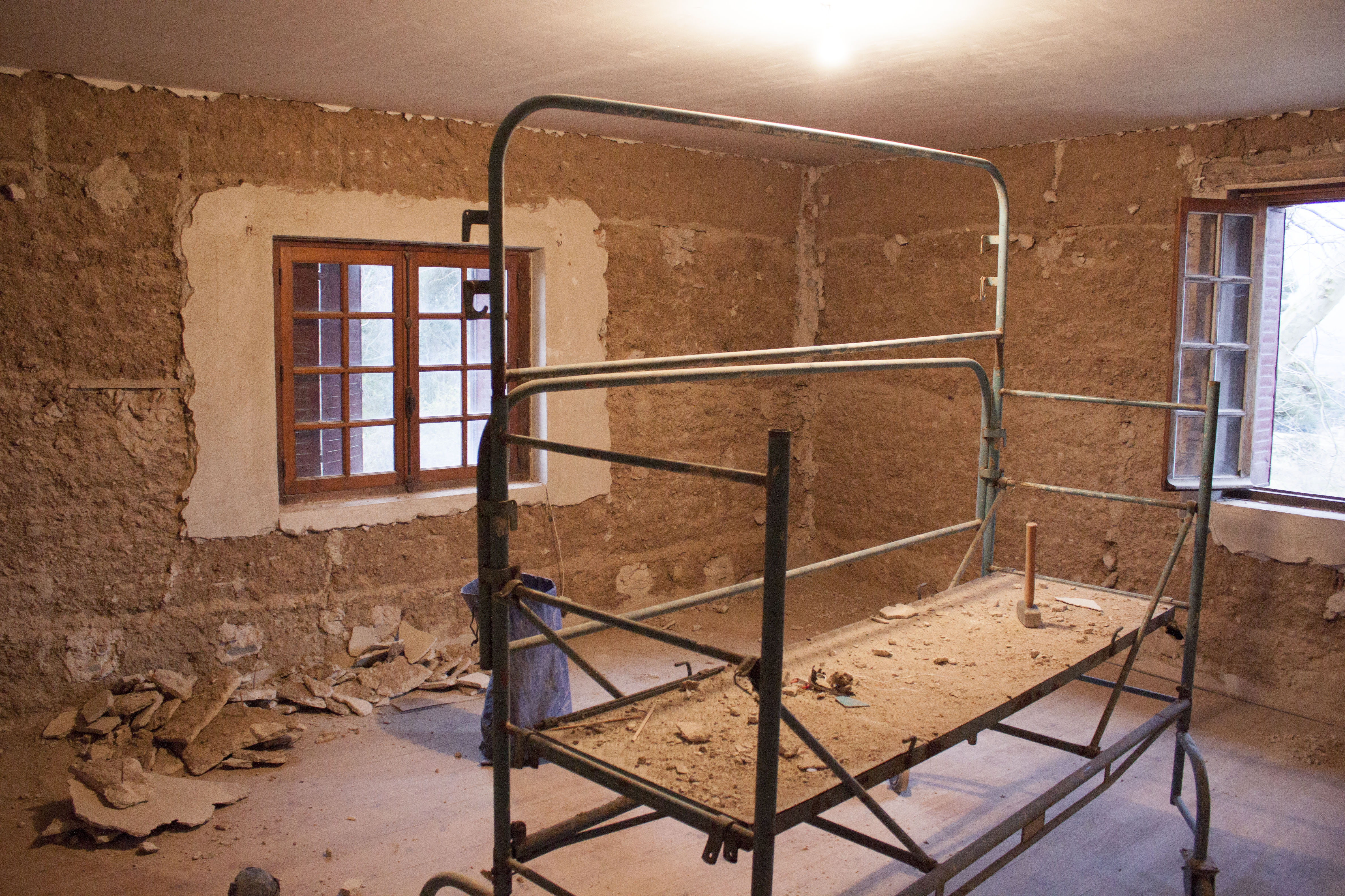 En ce qui concerne les murs, le futur atelier est totalement dégagé ; la semaine prochaine je fais une photo propre, sans échafaudage et sol balayé. Une pièce toute finie, une !!