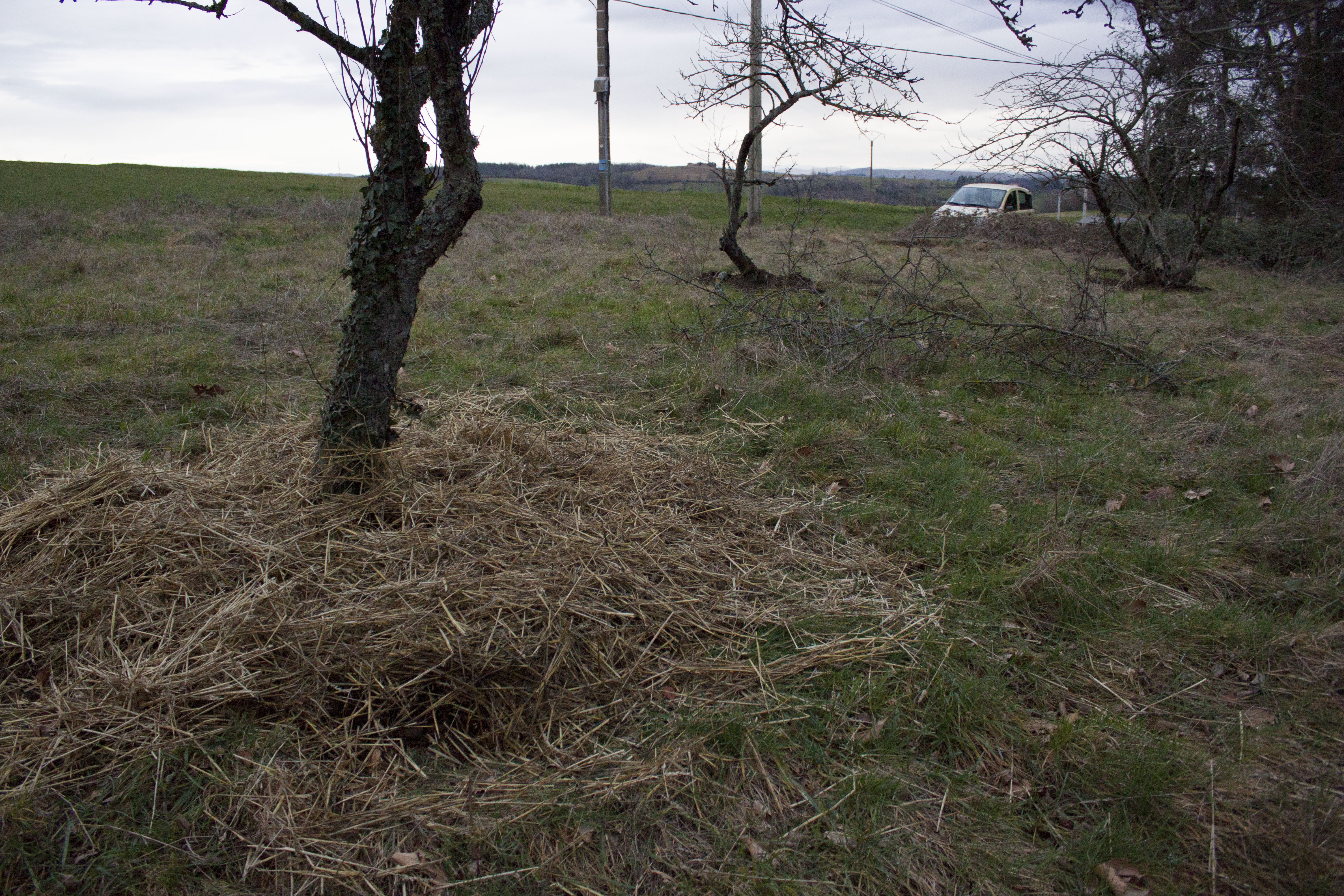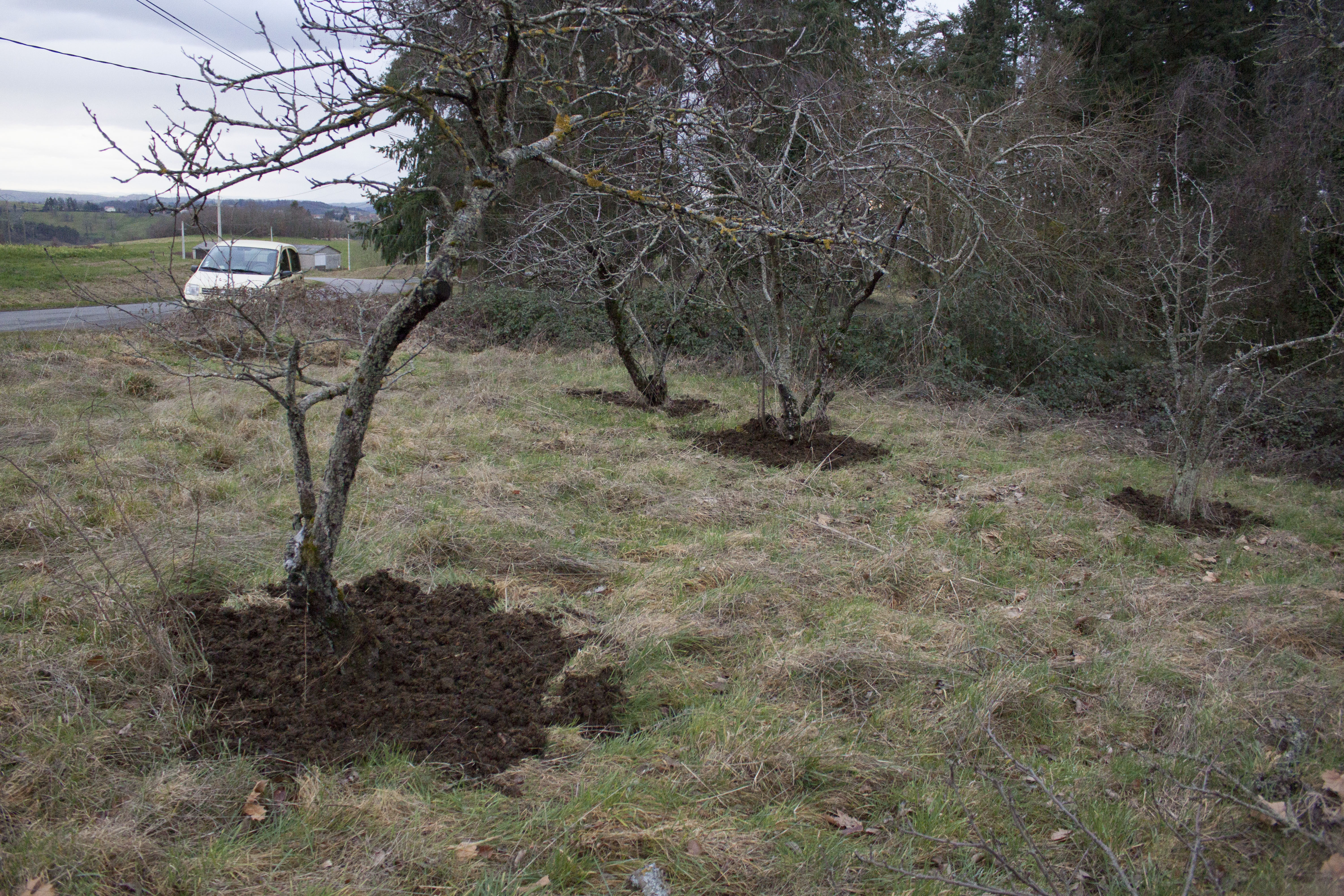 Et puis tout de même, je sais que tu l'attends avec impatience, le crottin ! Il attendait sagement en tas (oui, encore un autre) depuis qu'on l'avait ramené, et il était fort peu judicieusement sur le trajet que va bientôt prendre une mini-pelleteuse. Je te laisse visualiser la chose : tas de fumier, minipelle... Bref, on a donc re-priorisé l'étalage de fumier au pied des vieux fruitiers, dans l'espoir de ranimer un peu la terre à leur pied et de leur donner une nouvelle jeunesse ; il ne manquera plus que de finir de couvrir de paille, la semaine prochaine, pour que tout ça travaille tranquillement jusqu'au printemps...