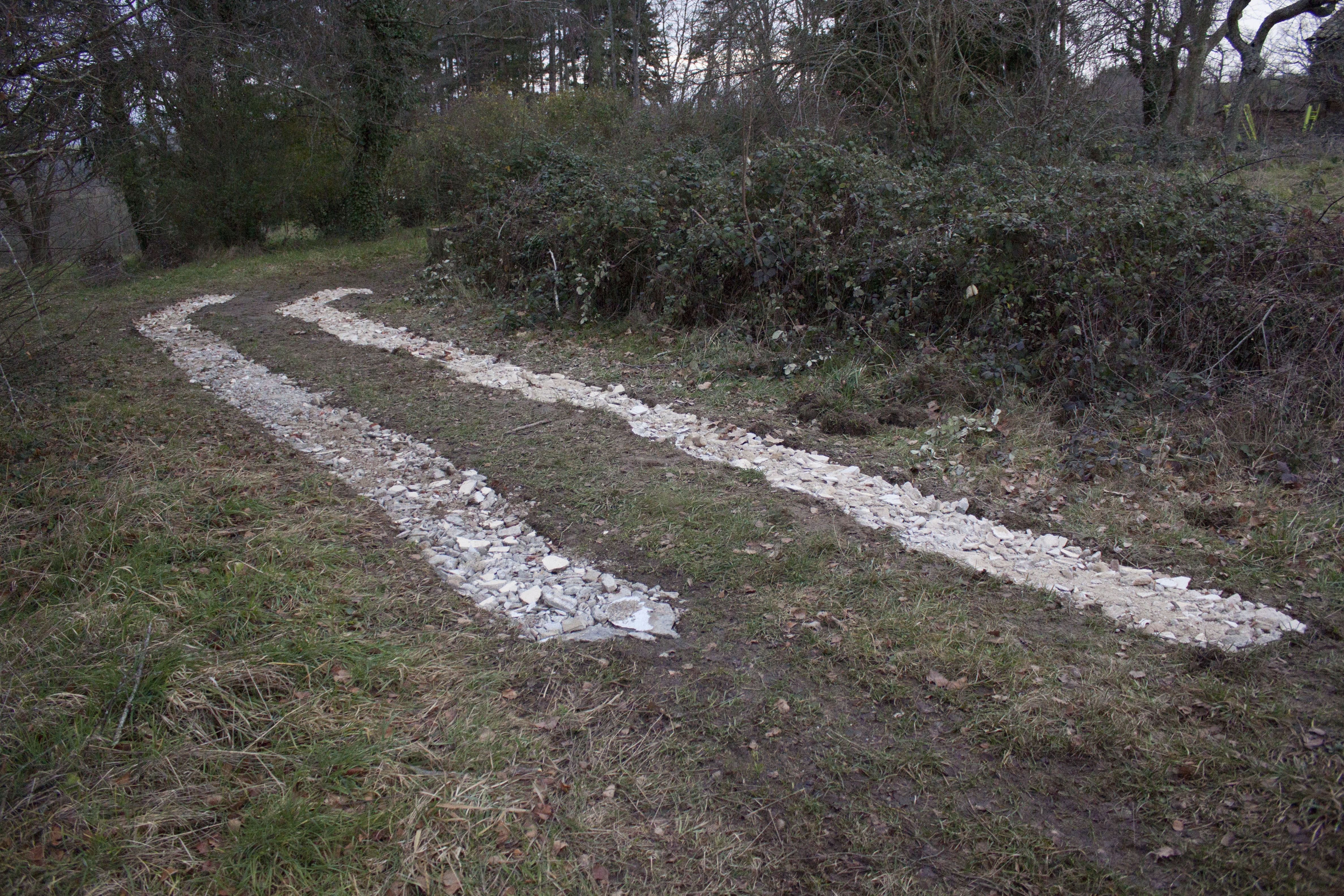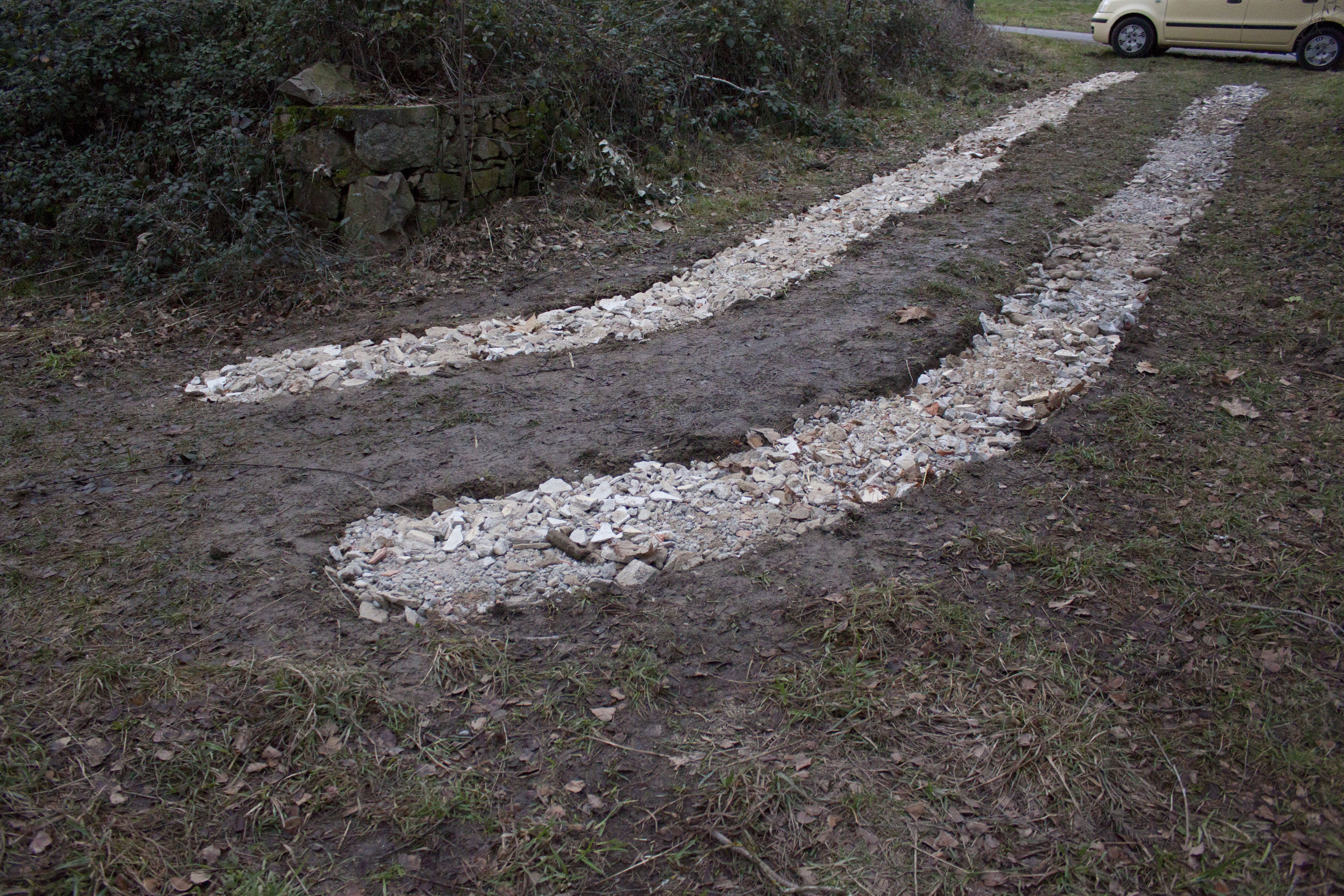 Et quand au second tas de gravats, celui qui a disparu... Il s'est fait manger par deux paires de bras inarrêtables (non, pas les nôtres, faut suivre, un peu !), pour finir de remplir la deuxième bande d'allée qu'ils avaient précédemment creusée ; nous voilà donc avec un chemin d'accès de nouveau praticable ! Et si le jour du creusement on aurait presque pu se demander si tous ces efforts en valaient la peine, le lendemain il avait plu dans la nuit et l'état de la terre alentour donnait une réponse sans appel : zouip ! Ça glisse et ça patine (même pour les bottes), autour de l'allée.