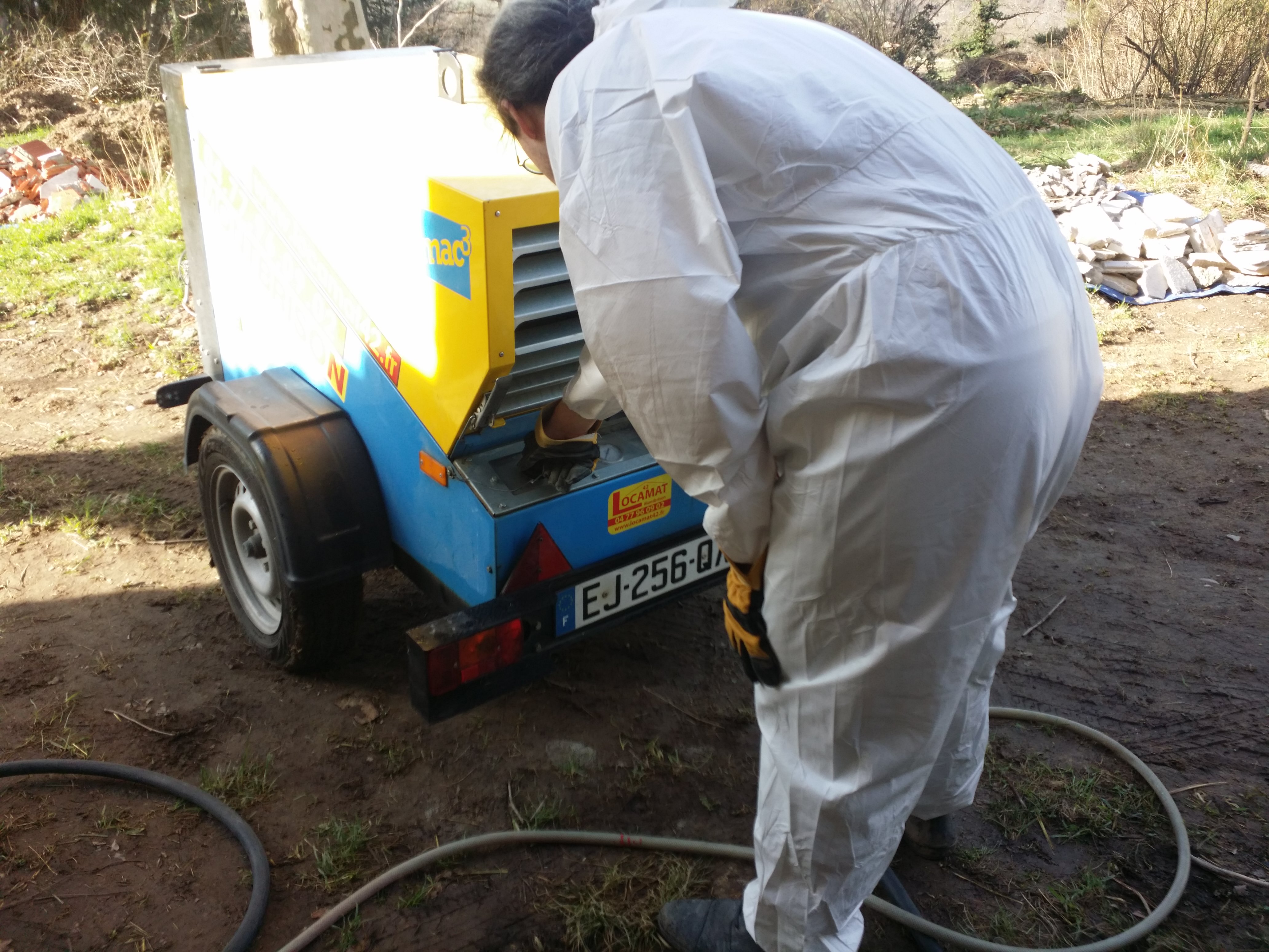 On raccorde tous les tuyaux (au prix d'une sacré lutte parfois...), on enfile nos super combis en papier, le gros compresseur démarre (c'est parti pour le bruit en continu !)...