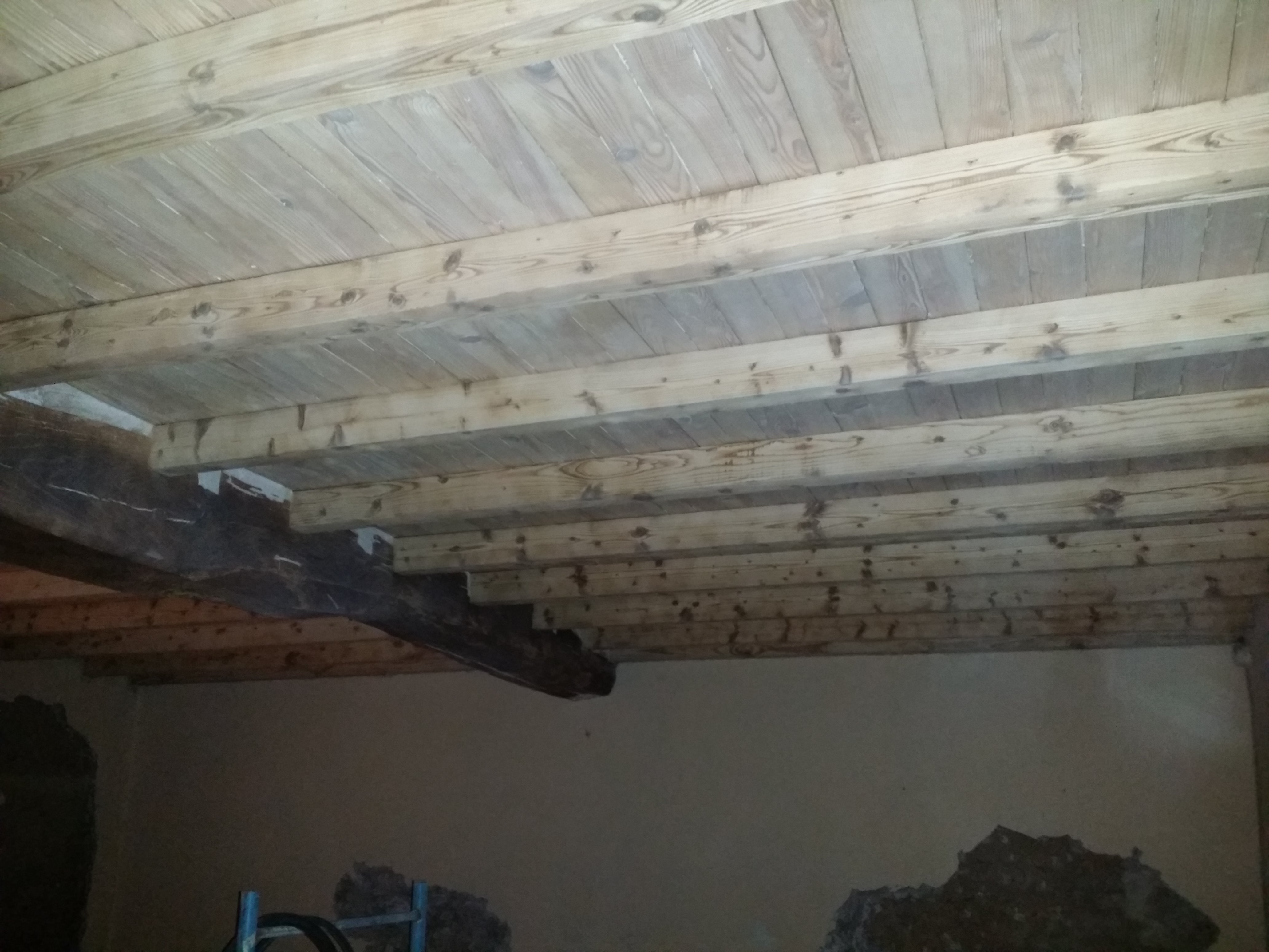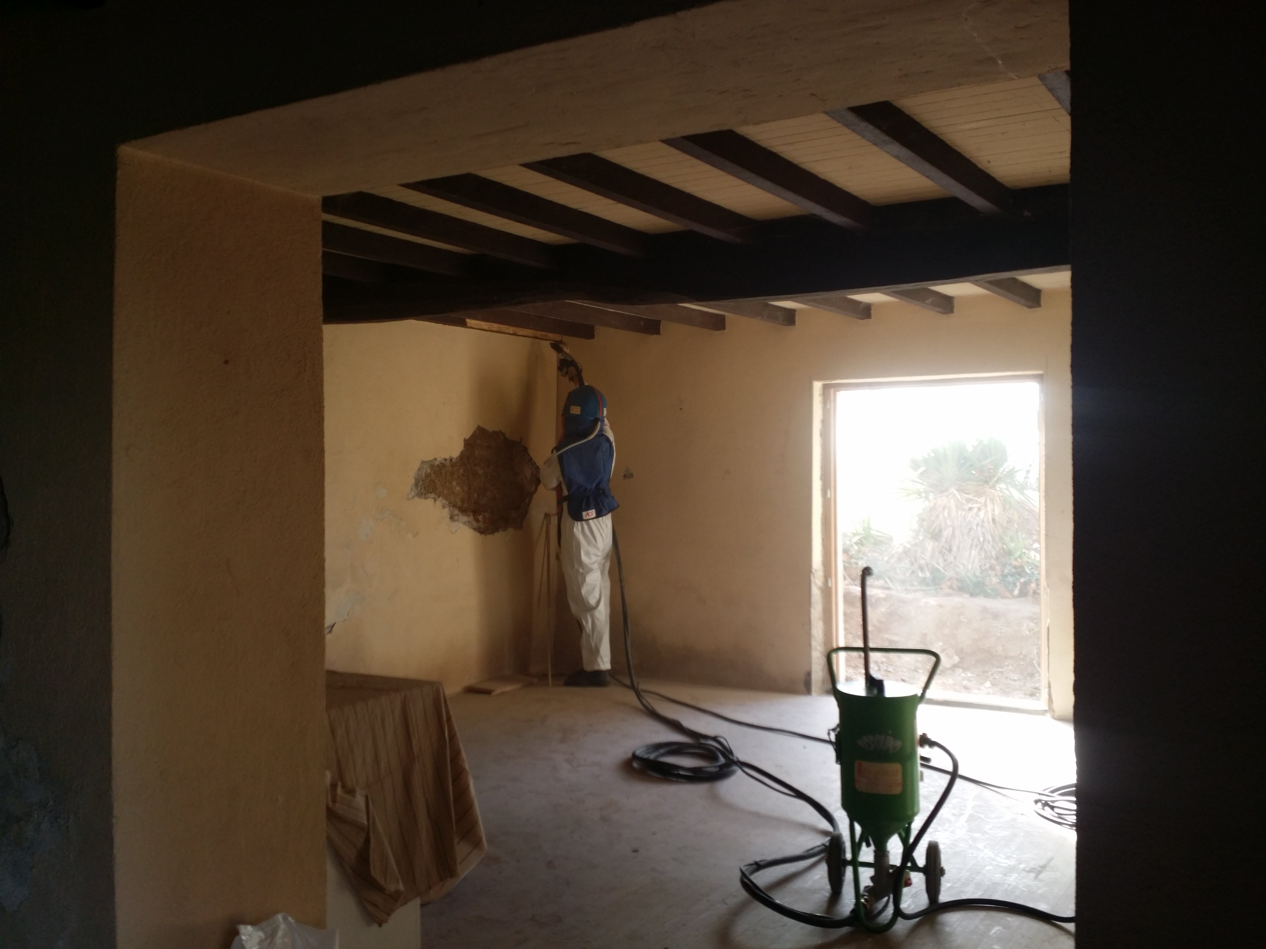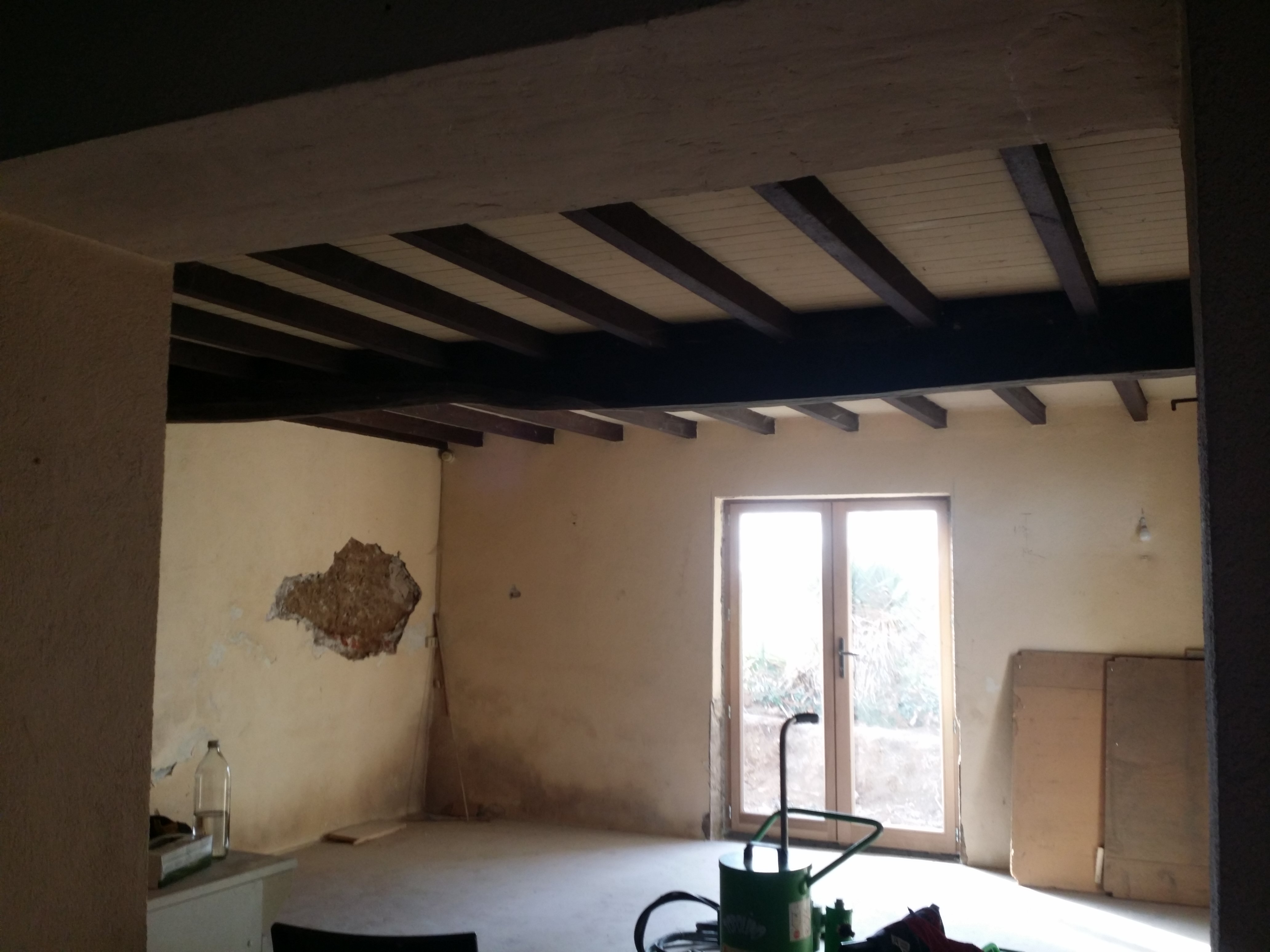 Déménagement dans 3 semaines (oui, les premiers temps seront en mode camping, mais au moins on sera sur place pour faire ce qui manque ; et surtout : on a trop hâte). Donc, on a pris 4 jours de congé pour faire des choses qui doivent être faites en semaine (parce que location de sablage) ; notamment : le SABLAGE des plafonds en bois.