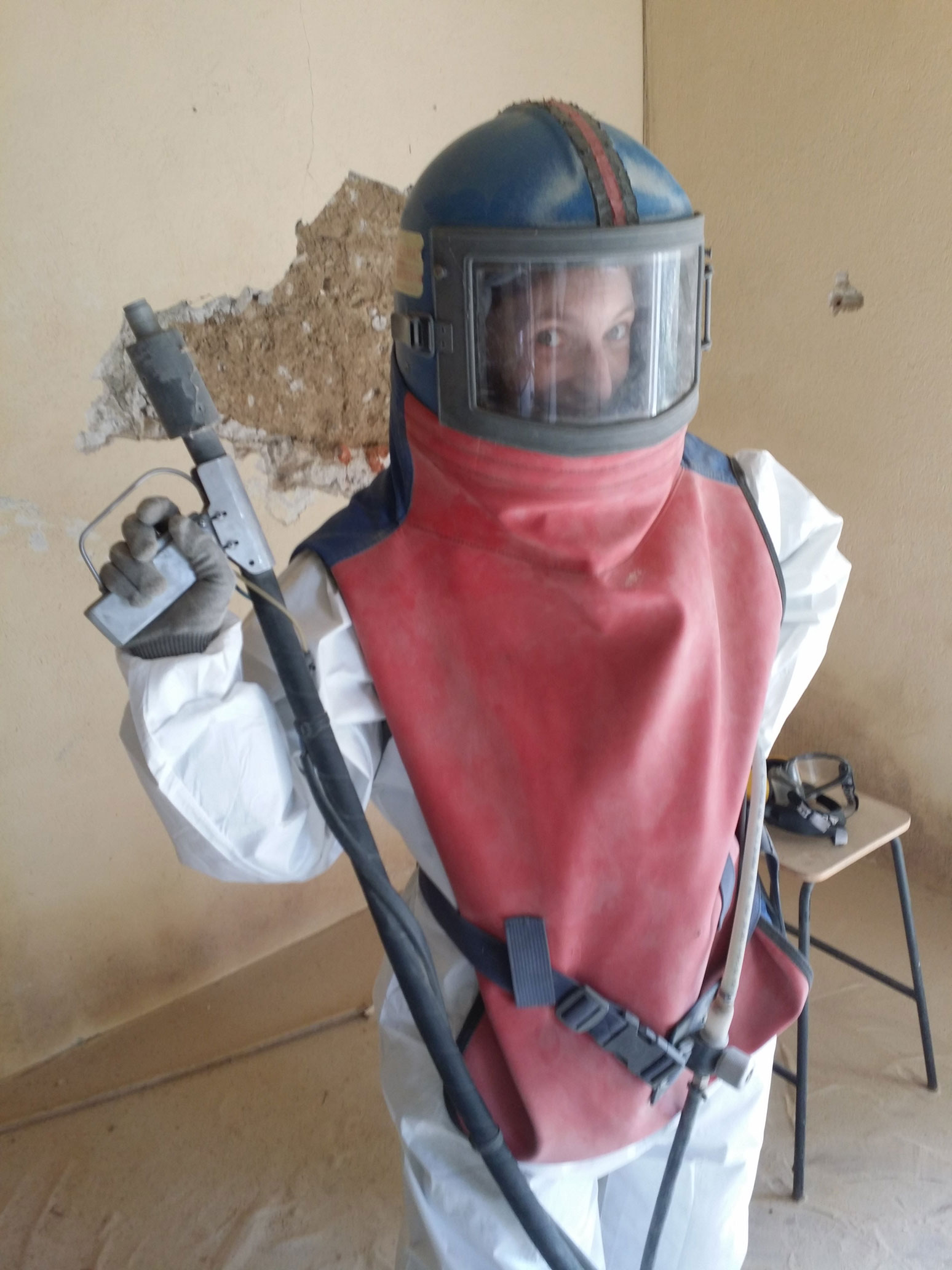 ... Et voilà venu le temps du look astronaute-décontamineur-Fallout ; gros casque insonorisé, relié au compresseur car un rideau d'air est soufflé entre le visage et la vitre, pour protéger des retours de sable propulsé et pour permettre de respirer dans l'air en mode tempête saharienne. C'est pas le truc le plus agréable du monde et c'est bruyant, mais c'est moins pire que ce qu'on craignait, et une fois la gâchette de la lance enclenchée, en comprend l'utilité du truc et on l'apprécie !