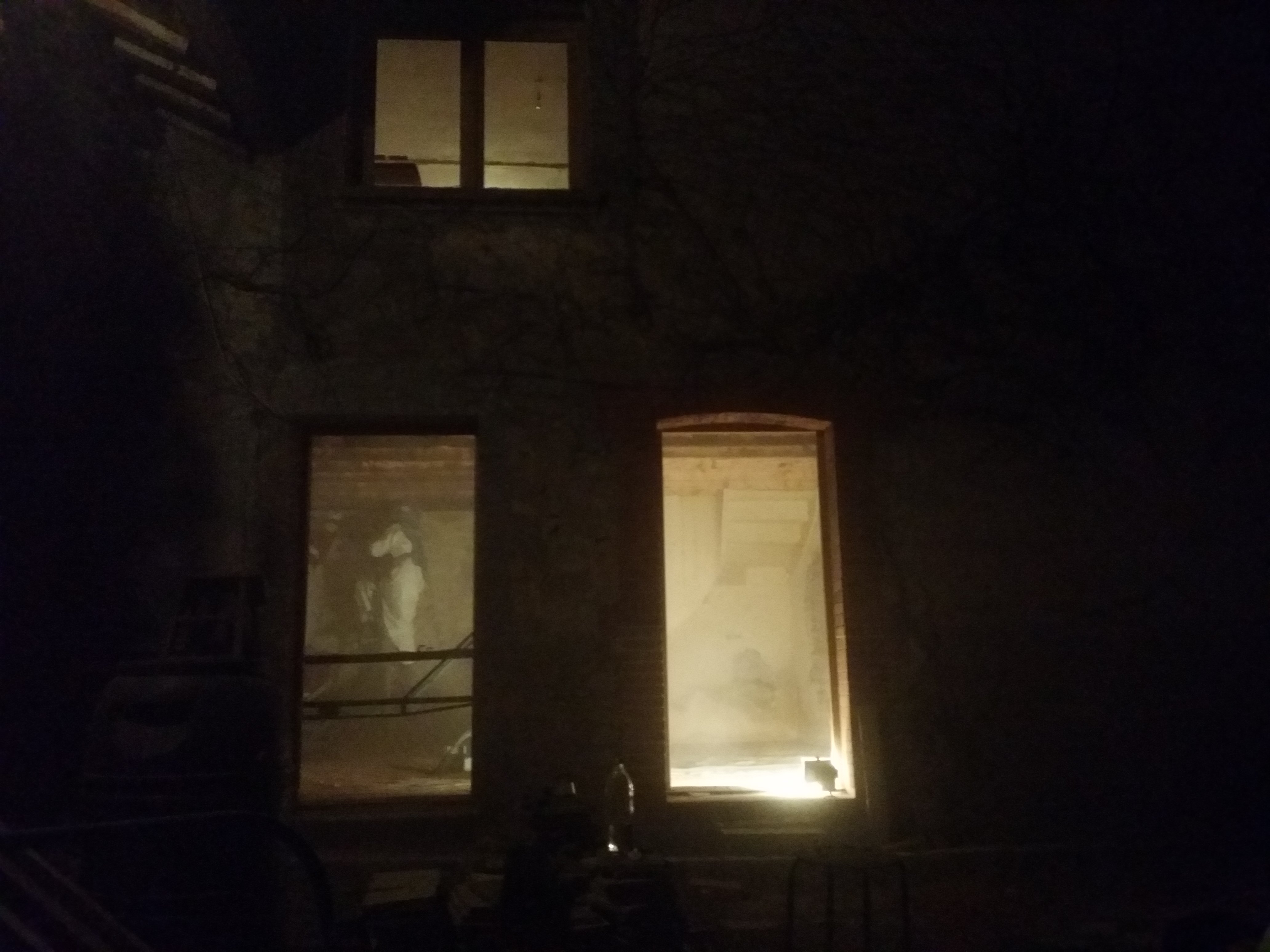 Fin avec la tombée du jour le vendredi (parce qu'il faut remettre les fenêtres dégondées, on peut pas laisser tout le matos non enfermé ; et hors de question de dormir sur place, le poêle est empaqueté pour être protégé donc ça va cailler, la nuit !).