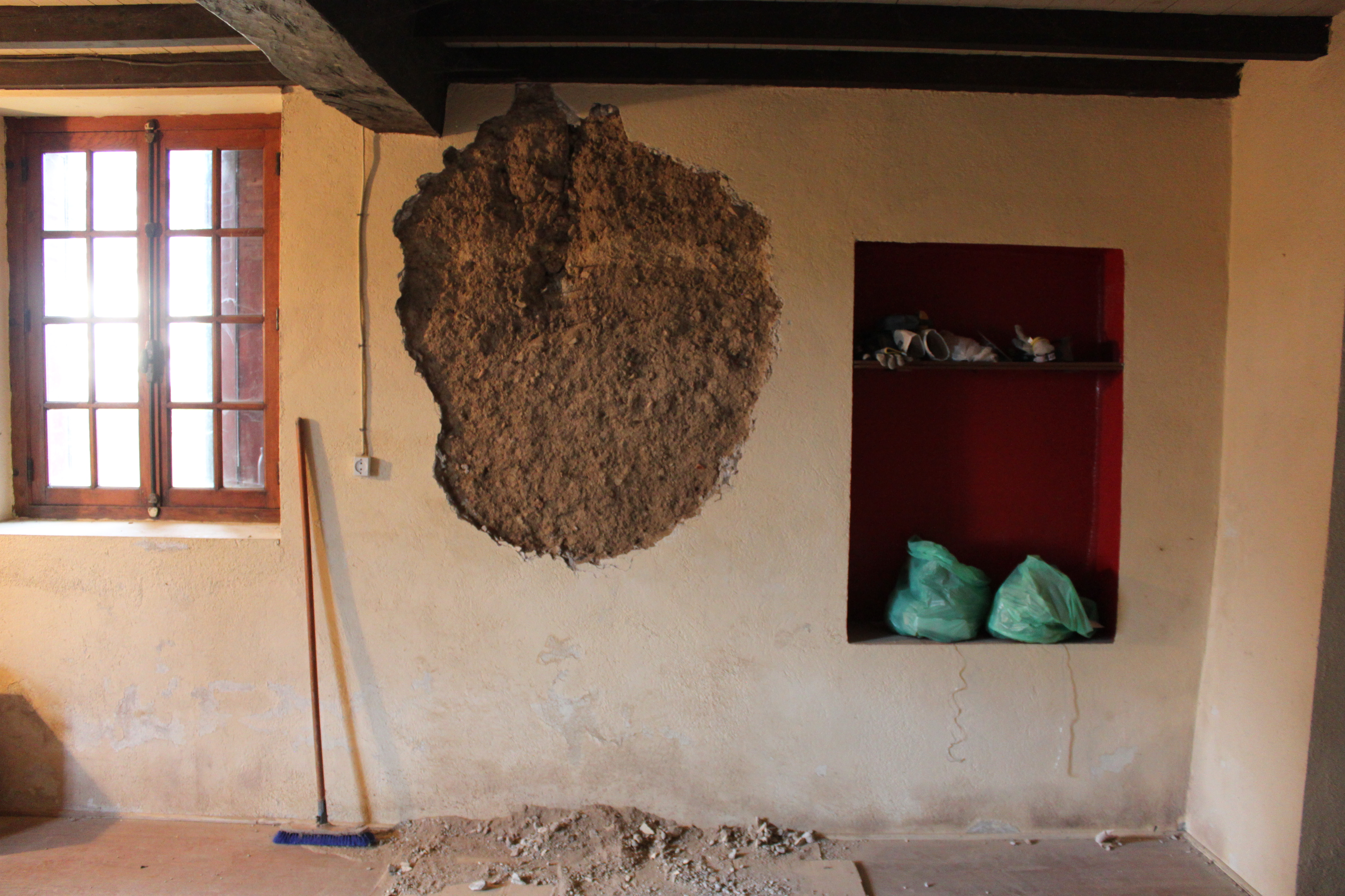 Bref, quatre petites heures de taff (parce qu'en plus le soir tombe vite, et qu'on a quand même 2h de trajet au total), qui ont commencé par un petit découragement sur le mur sois-disant-facile-qui-avait-bien-menti-le-con (facile sur 30cm ; le reste, va savoir... on est passés à autre chose ! ). Heureusement, un autre mur s'est avéré plus coopératif pour cette petite aprème fatiguée, avec sa terre bien sèche dessous ; c'est compréhensible, puisqu'il donne sur l'extérieur (qui a encore un bon enduit respirant, donc ce mur n'avait qu'un côté "bloqué"), mais ça fait plaisir quand même.