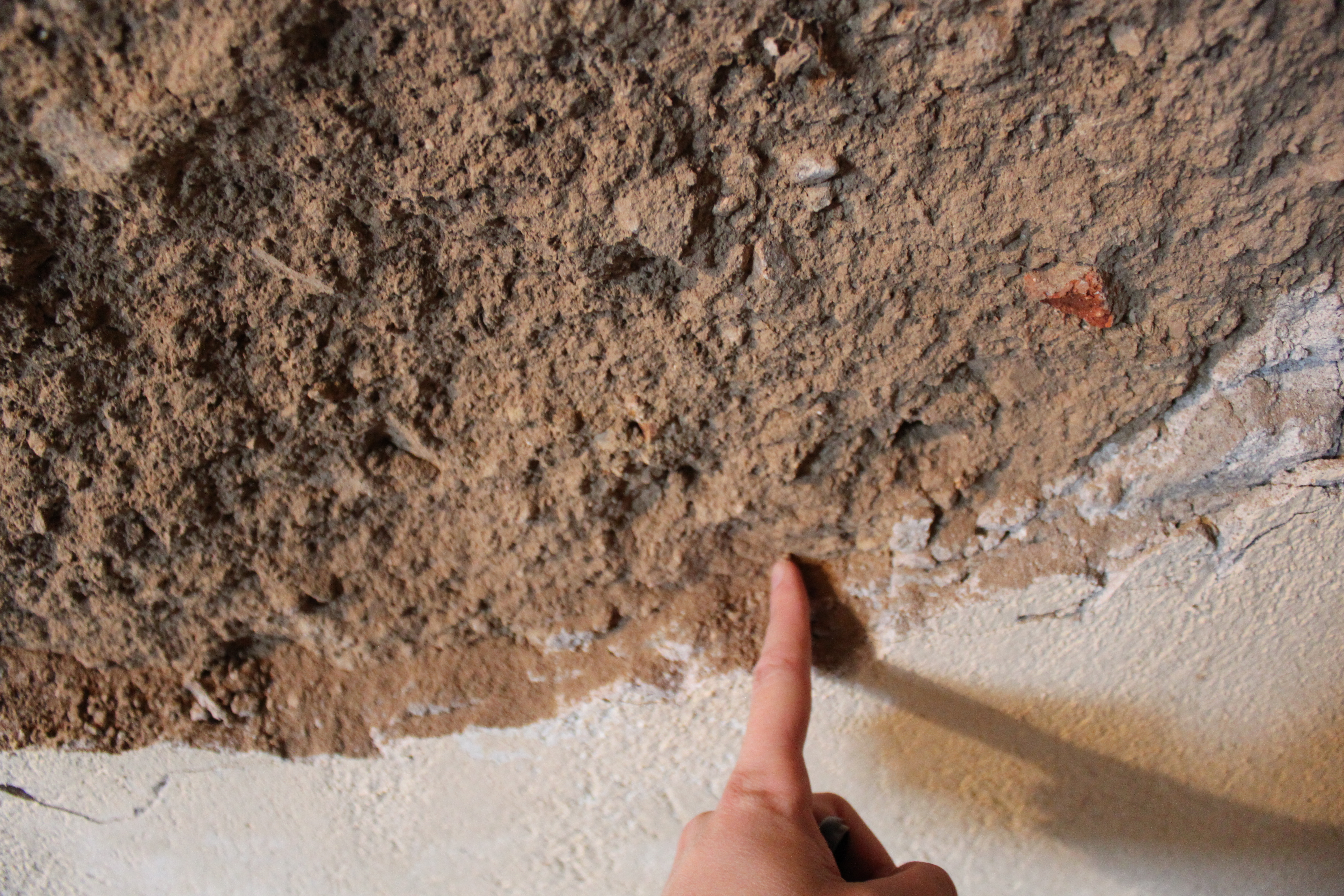 Allez, pour finir... Hében non, pas une photo de la vue avec le chêne, parce qu'il faisait moche et gris ; mais comme je sais que ça aussi ça t'aurait manqué, voilà une photo de mesure de l'épaisseur de l'enduit avec mon doigt. De rien.