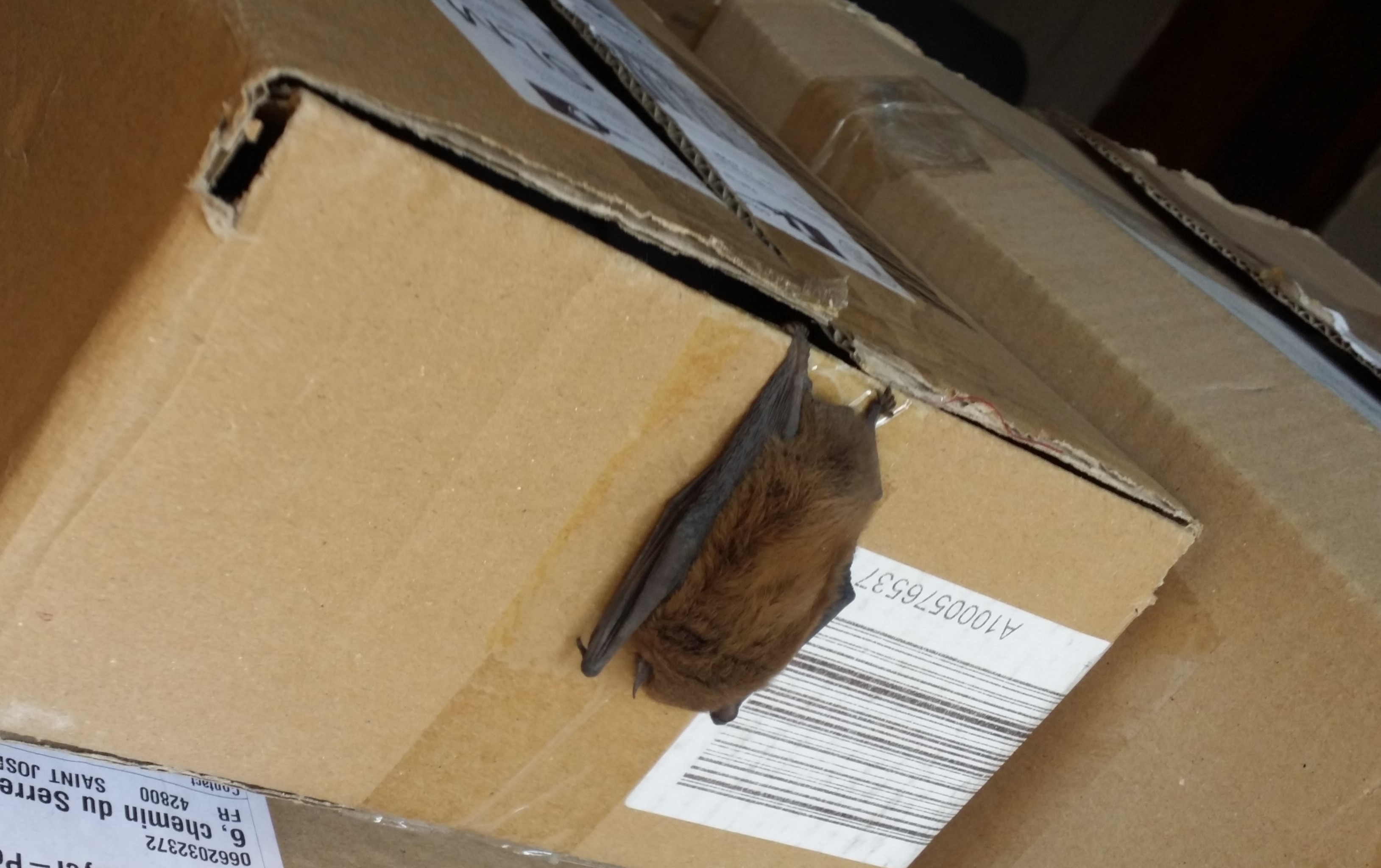 Au matin, recherches web, appel à une asso : on met la bestiole dans un carton, avec de l'eau et un chiffon pour qu'elle s'agrippe. Il faut la nourrir... hum, heureusement la question d'aller ou pas chercher des vers de farine en magasin ne se pose pas en ce moment (ouf), et on a justement une (grosse) araignée toute fraîchement décédée du matin (de cause non naturelle, mais heureusement pour notre chauve-souris, de manière mécanique et non chimique...). On trouve dans la journée quelques autres insectes morts de ci de là...