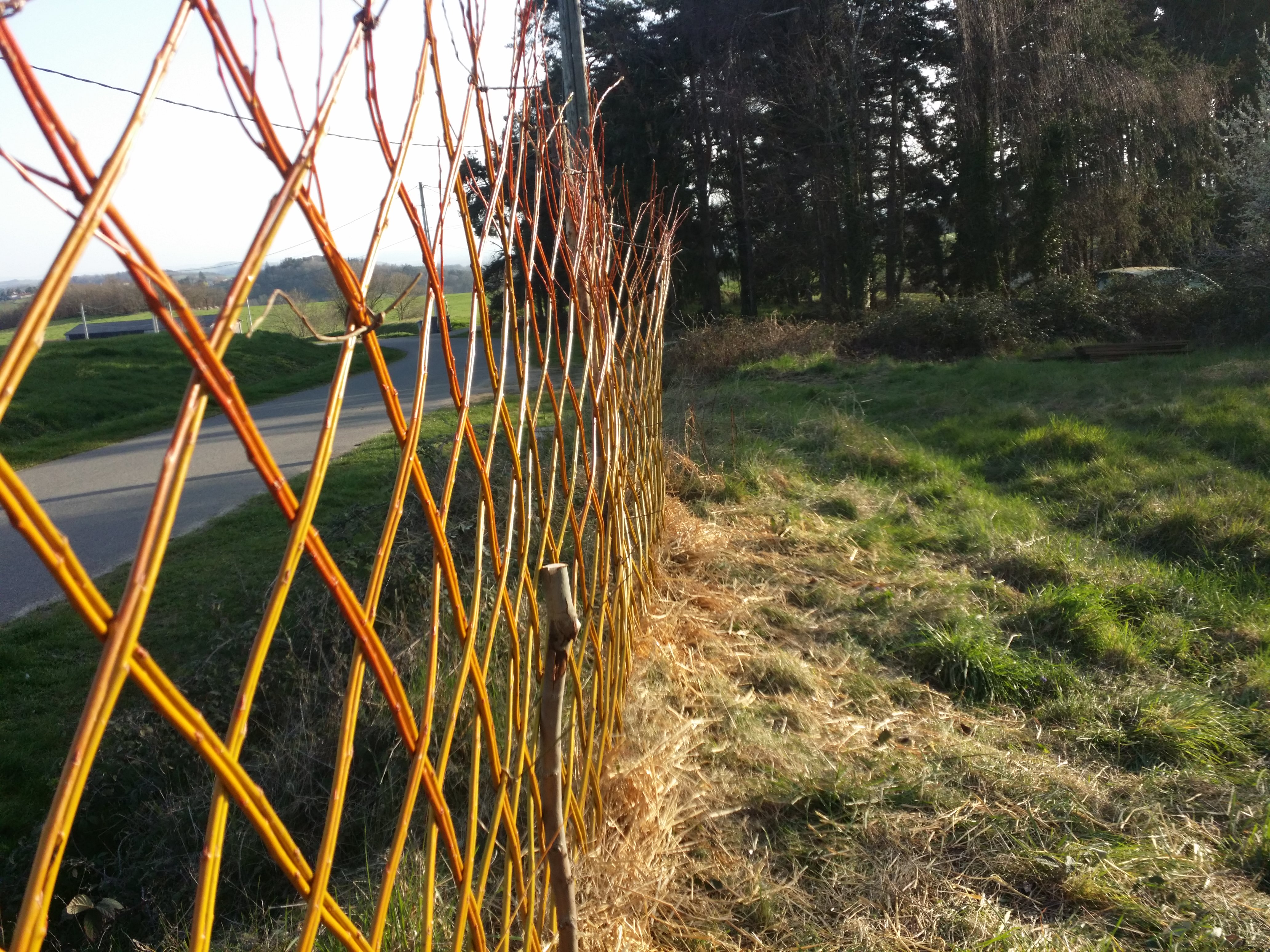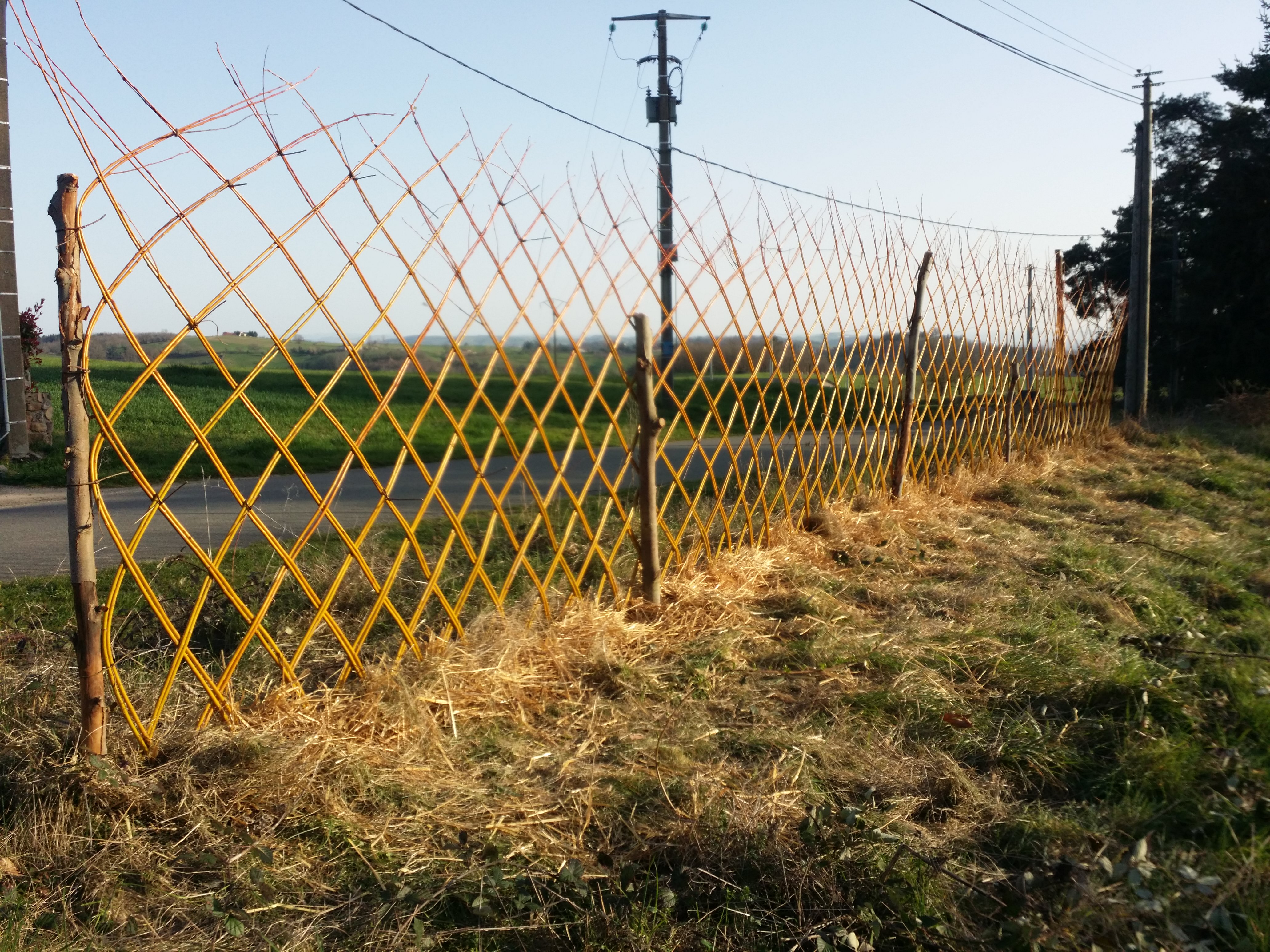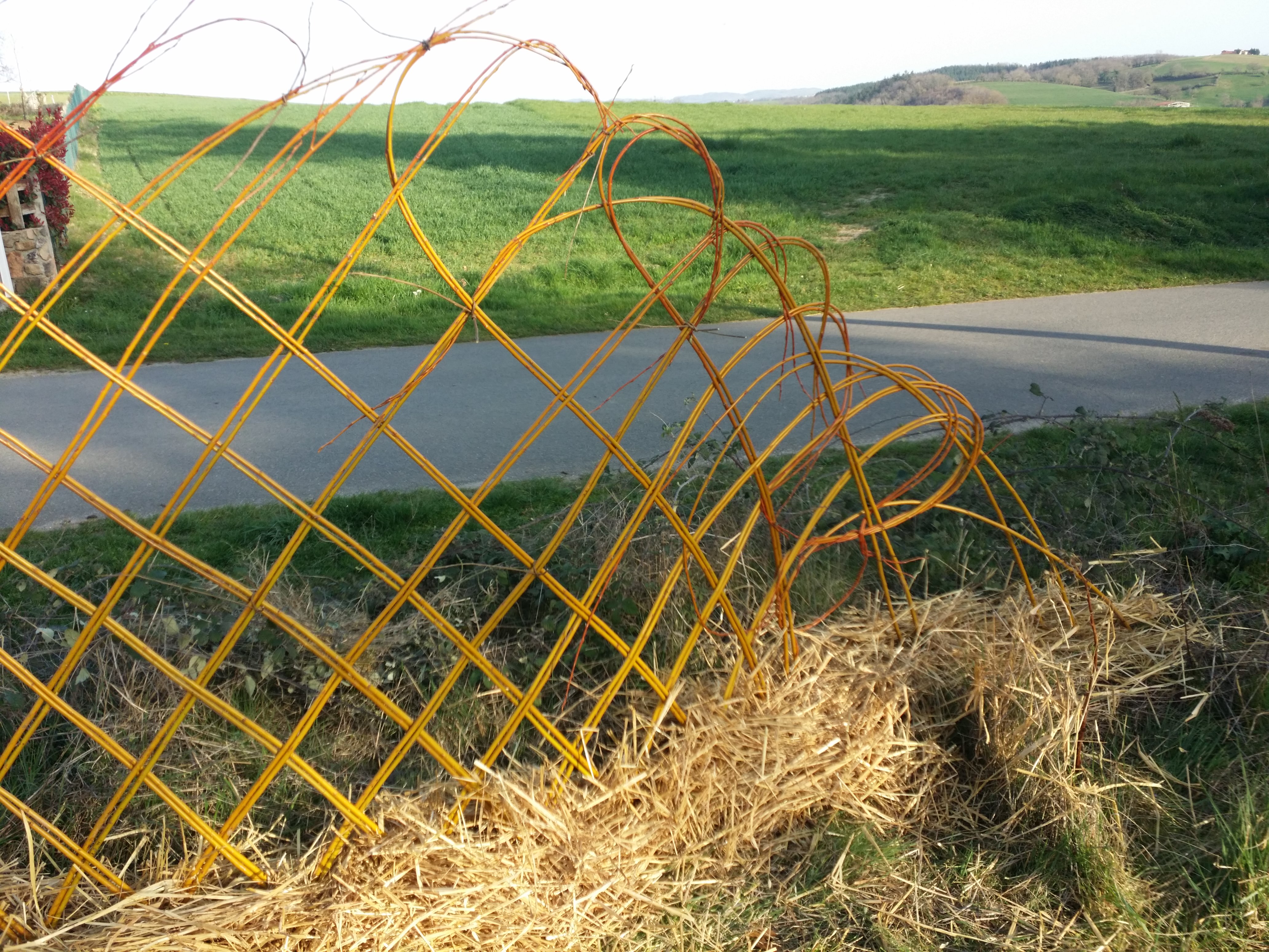 J'ai suivi il y a (très) peu de temps un stage de vannerie vivante avec Marion (vers Aix-les-Bains), dans l'idée de faire une partie des haies en osier tressé ; et acheté l'osier pour la faire, aussi, récupéré la veille du déménagement : il ne fallait donc plus traîner à la mettre en place ! Il aura fallu 5 heures environs, pour 13 mètres de haie d'un beau jaune lumineux, qui va bientôt si tout se passe bien, faire des feuilles, grossir, pousser, redonner des tiges pour refaire de l'osier vivant ailleurs... Bref, un bonheur !