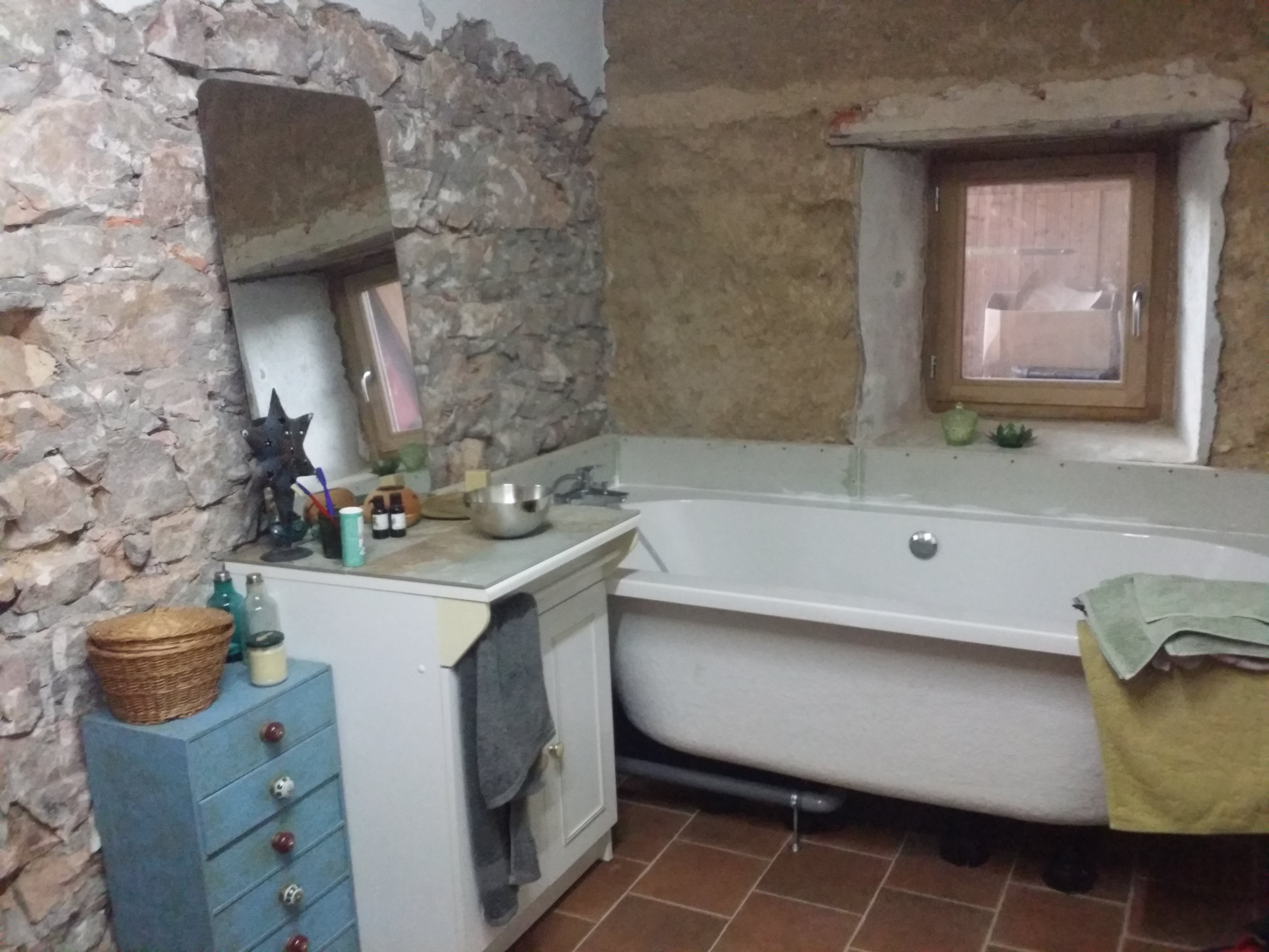 - et maintenant, de quoi nous doucher, en la personne d'une baignoire honteusement immense (entendre : qui permet à l'un d'y faire tenir son mètre quatre-vingt-douze, alors que l'autre devra peut-être y mettre une cale pour ne pas s'y noyer) qui nous permet de nous doucher ! (Et un meuble de vasque temporaire moche - on s'était pressés de le trouver sur leboncoin, mais la vasque venait... d'Italie. Pas grave, 2 carreaux de carrelage posés dessus, un miroir, un saladier pour faire cuvette à l'ancienne, et voilà !)
