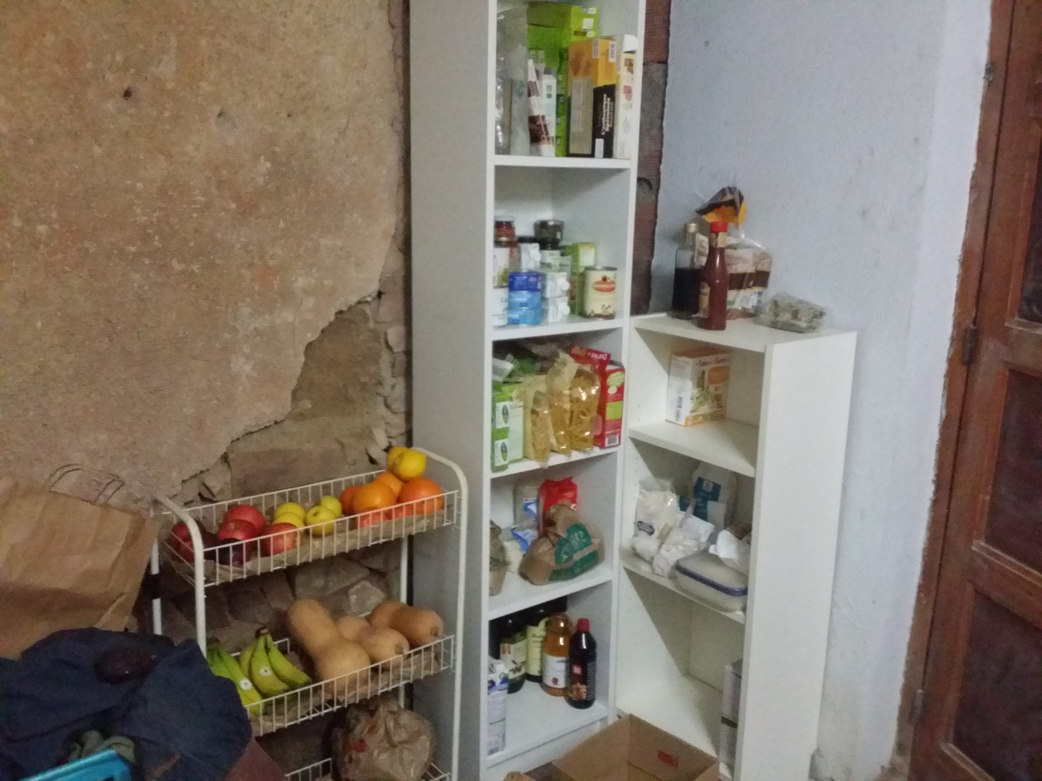 - pas de frigo (on devait en changer "peu après notre installation" : ça sera sans doute un peu plus long que prévu du coup), mais un appentis frais et pour le moment, le froid de la nuit