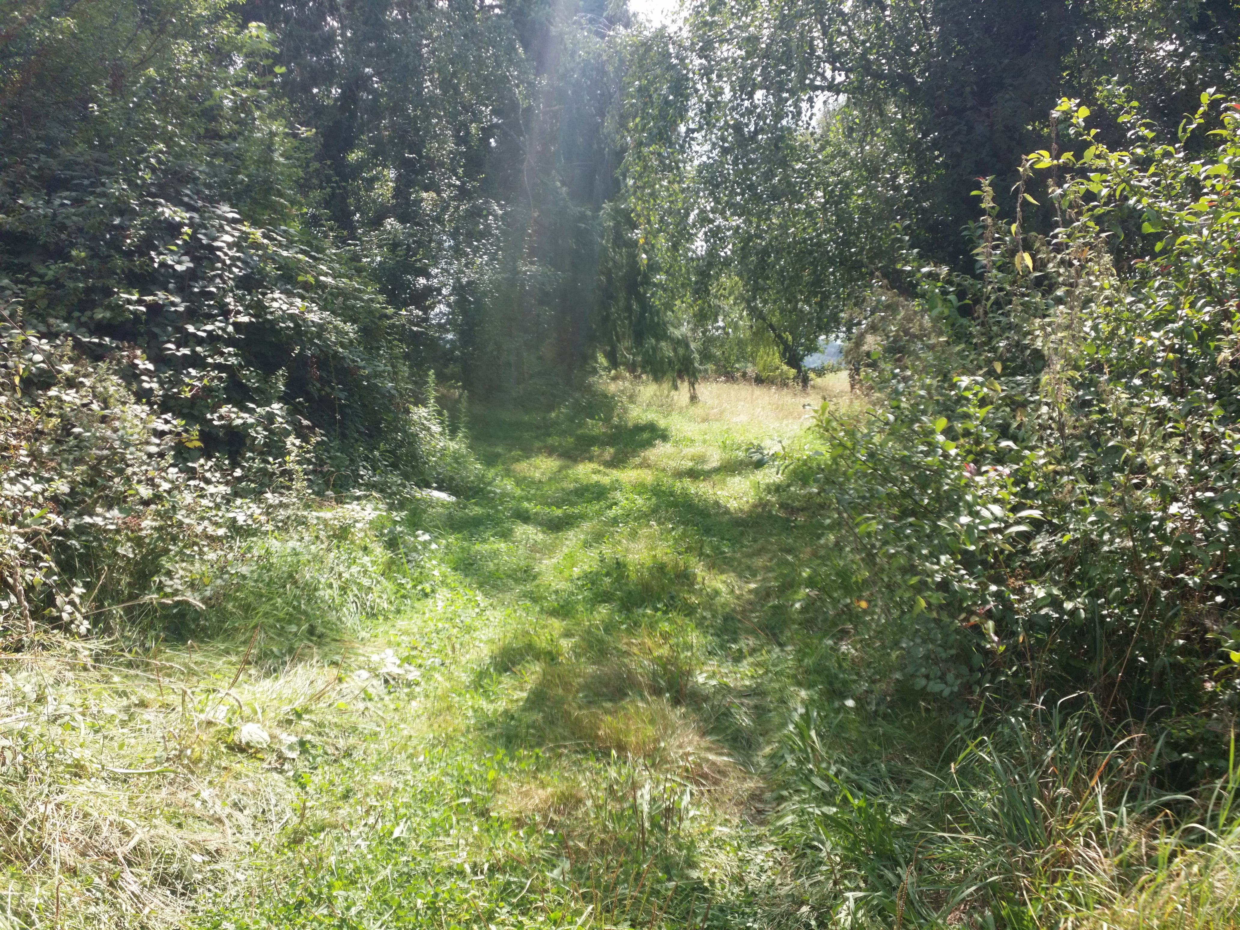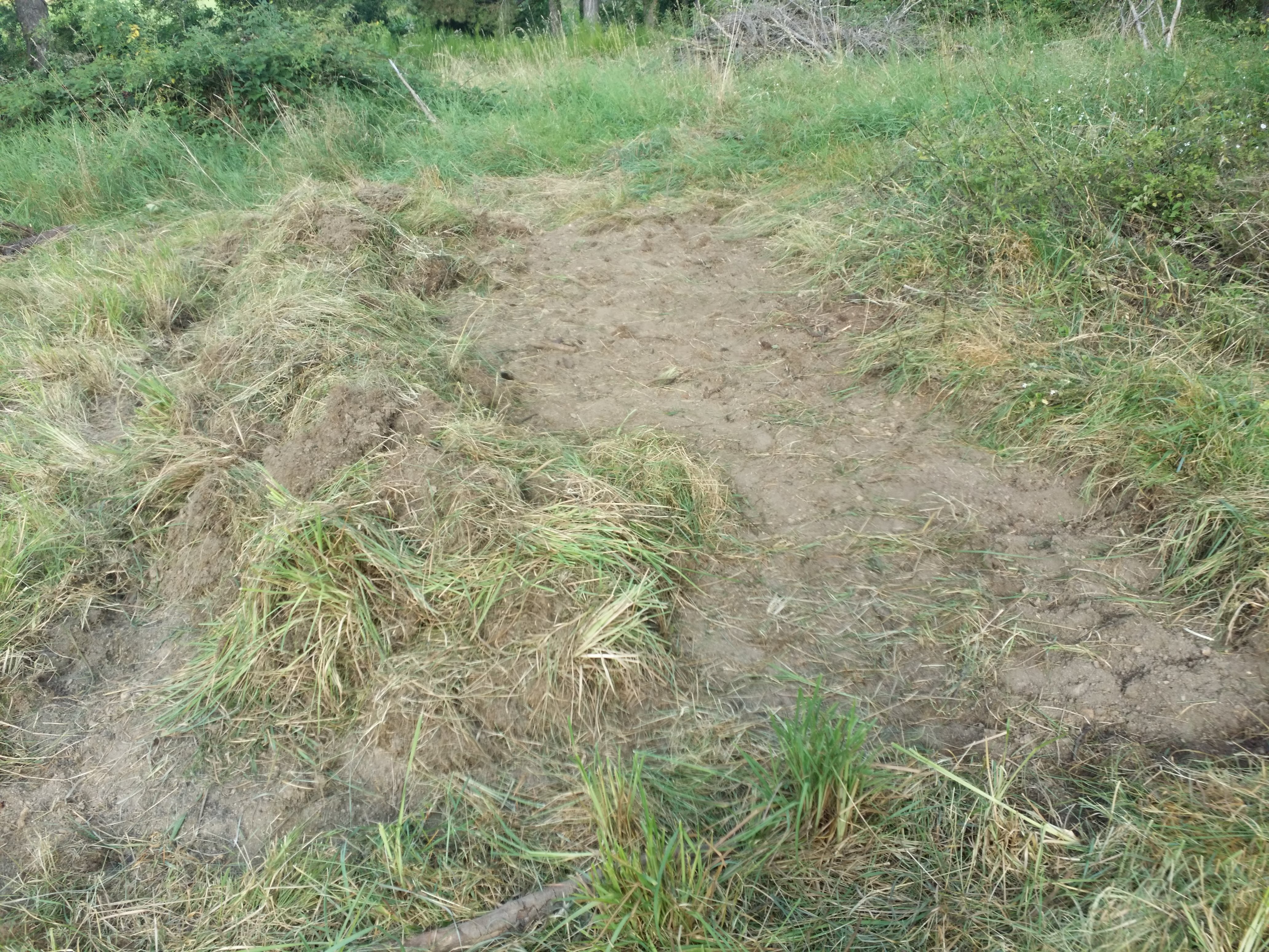 Heureusement, y'a eu de quoi passer mon énergie en trop (et c'était bien de faire appel aux muscles, parce que côté cerveau c'était tout fondu à force de réfléchir au meilleur emplacement et autres détails techniques) : déjà, il a fallu vaguement faucher la zone (et c'était haut, très haut, et plein de grateron collant à la lame !), puis retirer la "croûte" d'herbe + racines + terre.