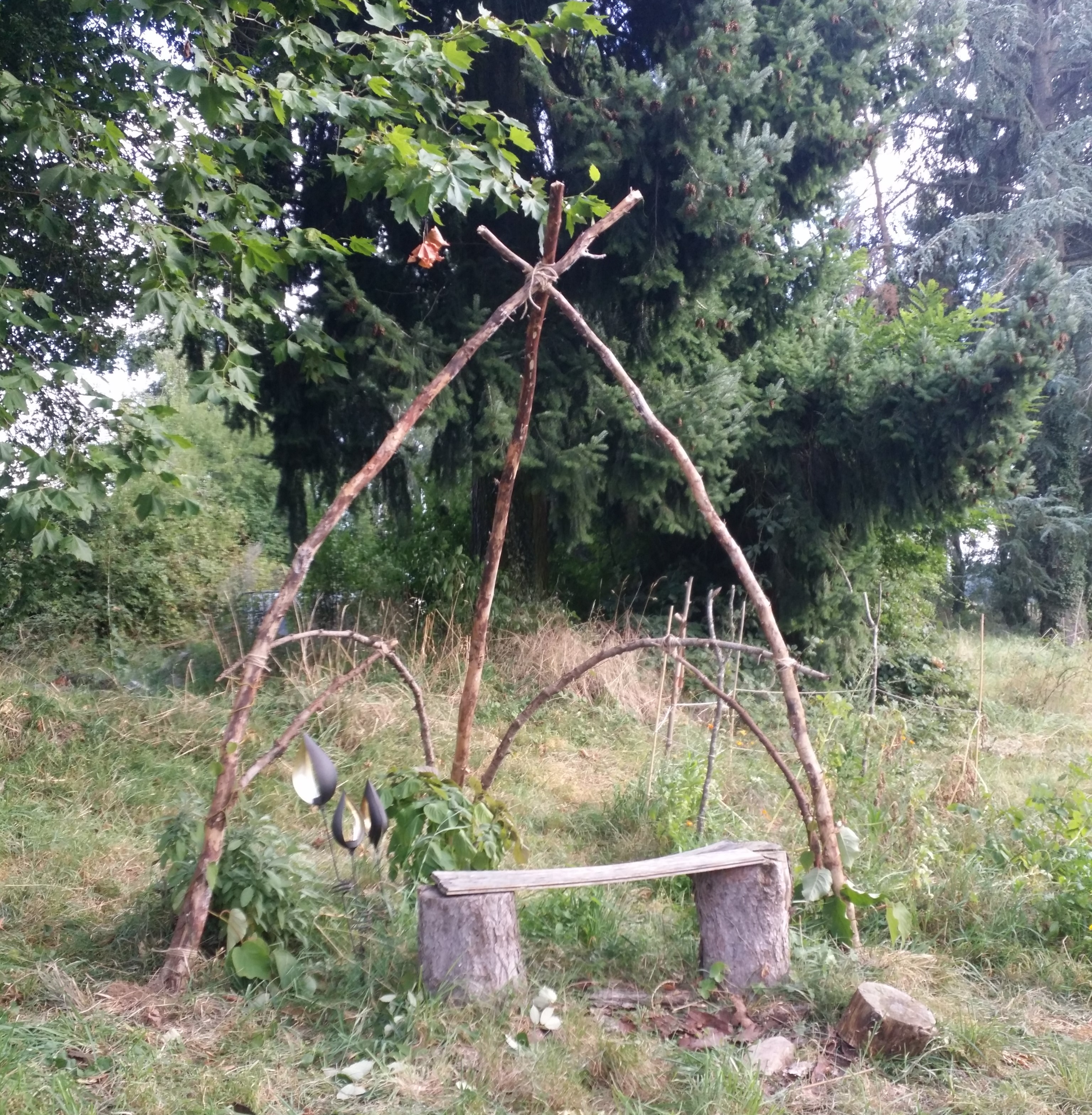 Bon et puis la serre était toujours pas là, alors j'ai passé ma frustration en construisant un genre de structure pour les kiwis (à renforcer pour quand ils commenceront à grandir, mais y'avait urgence pour qu'ils puissent grimper !)