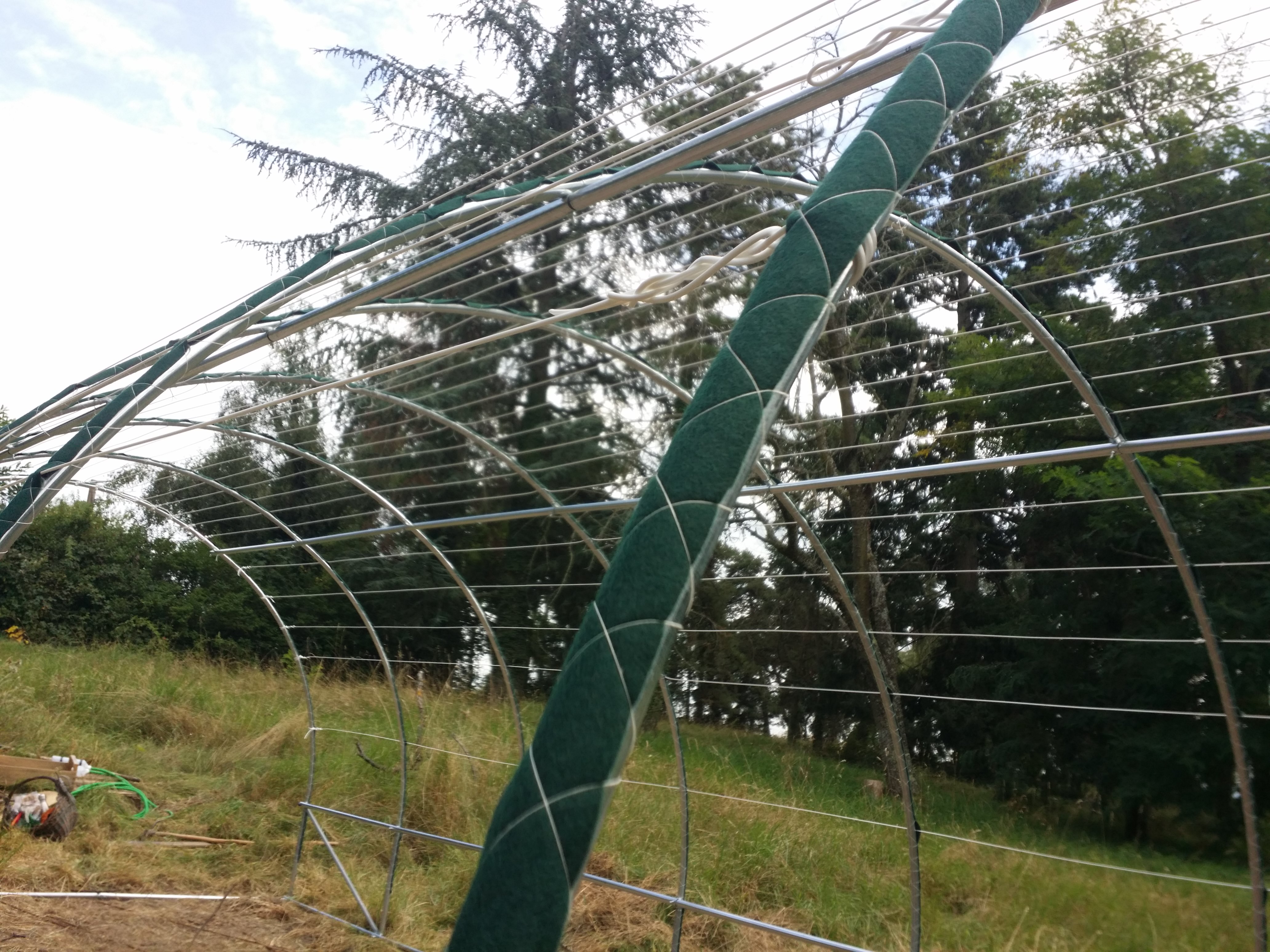 Bon, et comme avoir trop de temps pour faire des recherches et réfléchir c'est souvent dangereux, une étape s'est encore ajoutée : protéger les arceaux ; ou plutôt protéger la bâche du frottement et de la chaleur sur les arceaux. Alors, on aurait pu prendre la solution classique : un ruban isolant isolant adhésif, rapide à poser... Mais collé, donc. Et ça, c'est non ; pas du tout envie de poser un truc type scotch à la durée de vie inconnue sur une structure en métal qui pourrait durer bien plus longtemps. Tu vois le vieux scotch tout cuit, marron, à la fois friable et pêguant, que tu retrouves sur tes vieux papiers d'il y a 15ans ? Beûrk.
