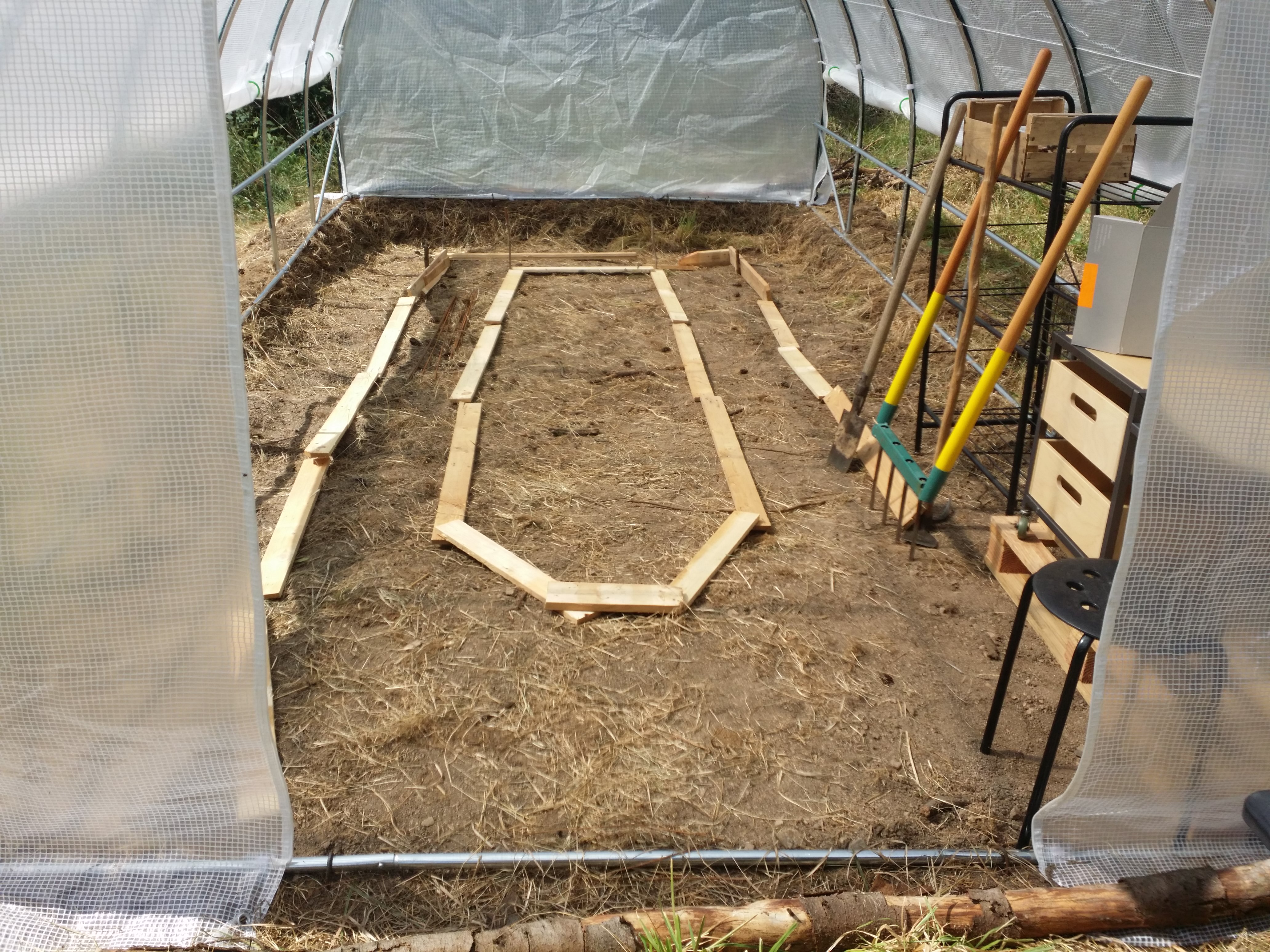 Et puis surtout, maintenant, il va falloir délimiter les allées en fixant à la verticale les 20m de planches amoureusement dépiautées (et décloutées) des restes de la caisse du poêle à bois (recyclaaaaaaage ! ), et pailler les allées, et préparer les zones de cultures !!