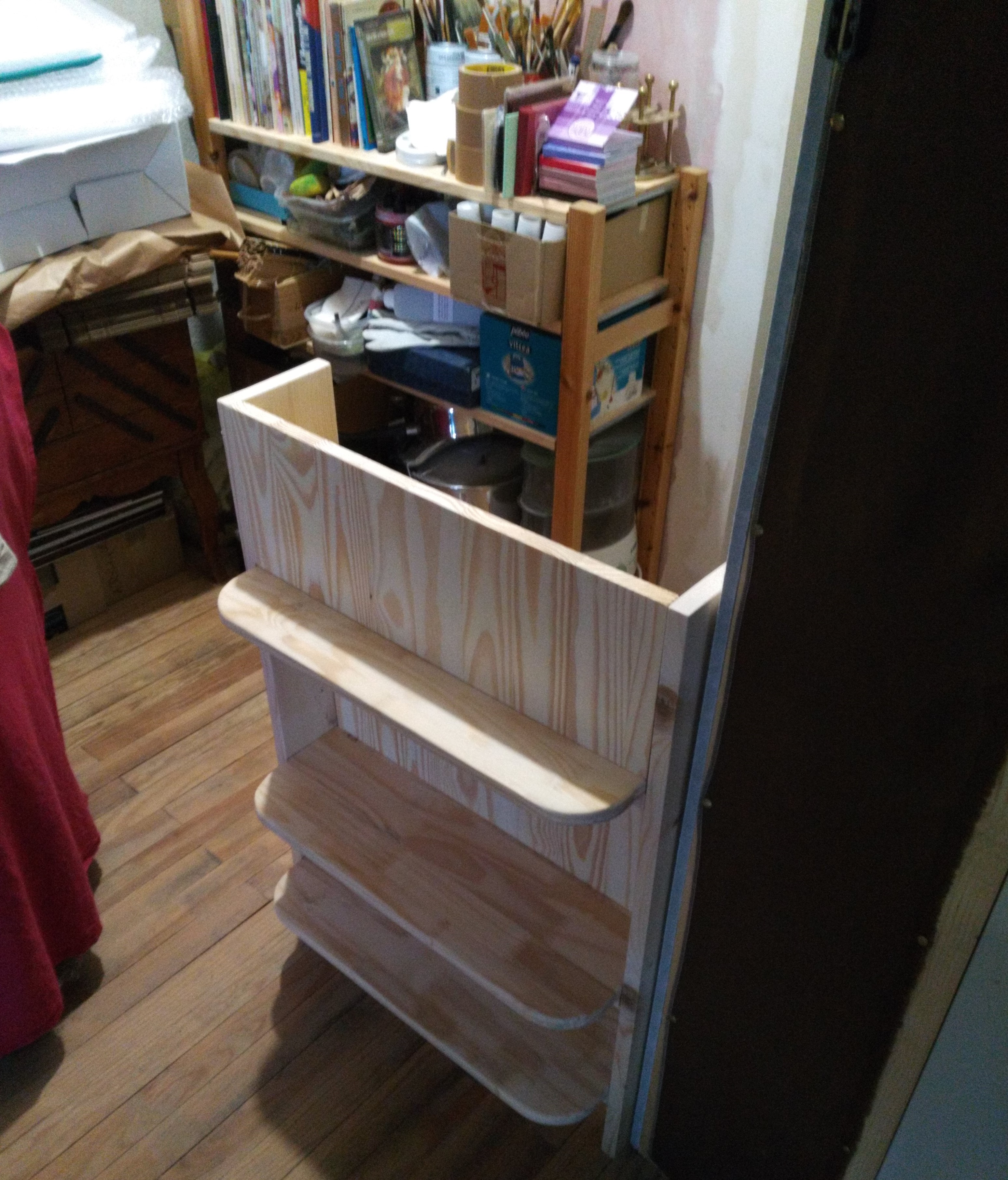 Enfin un meuble en bois non temporaire à fabriquer ; on a toujours qu'un outillage basique et une table de cuisine comme établi, mais on s'est appliqués ! (Surtout sur les arrondis :p ) (en arrière plan, une petite partie du bazar qui va devoir rentrer dans cet espace le jour où il sera totalement fini xD ) :