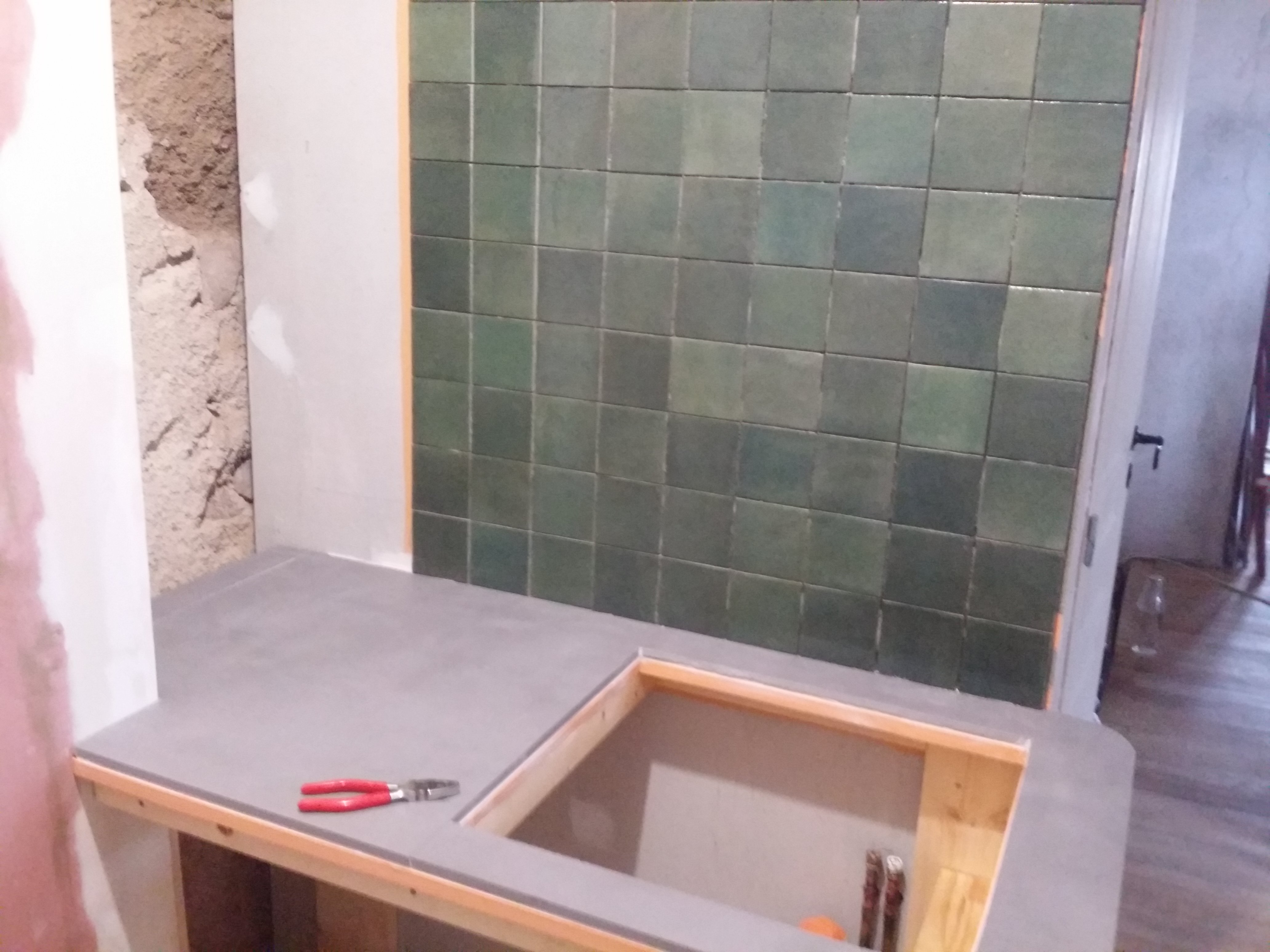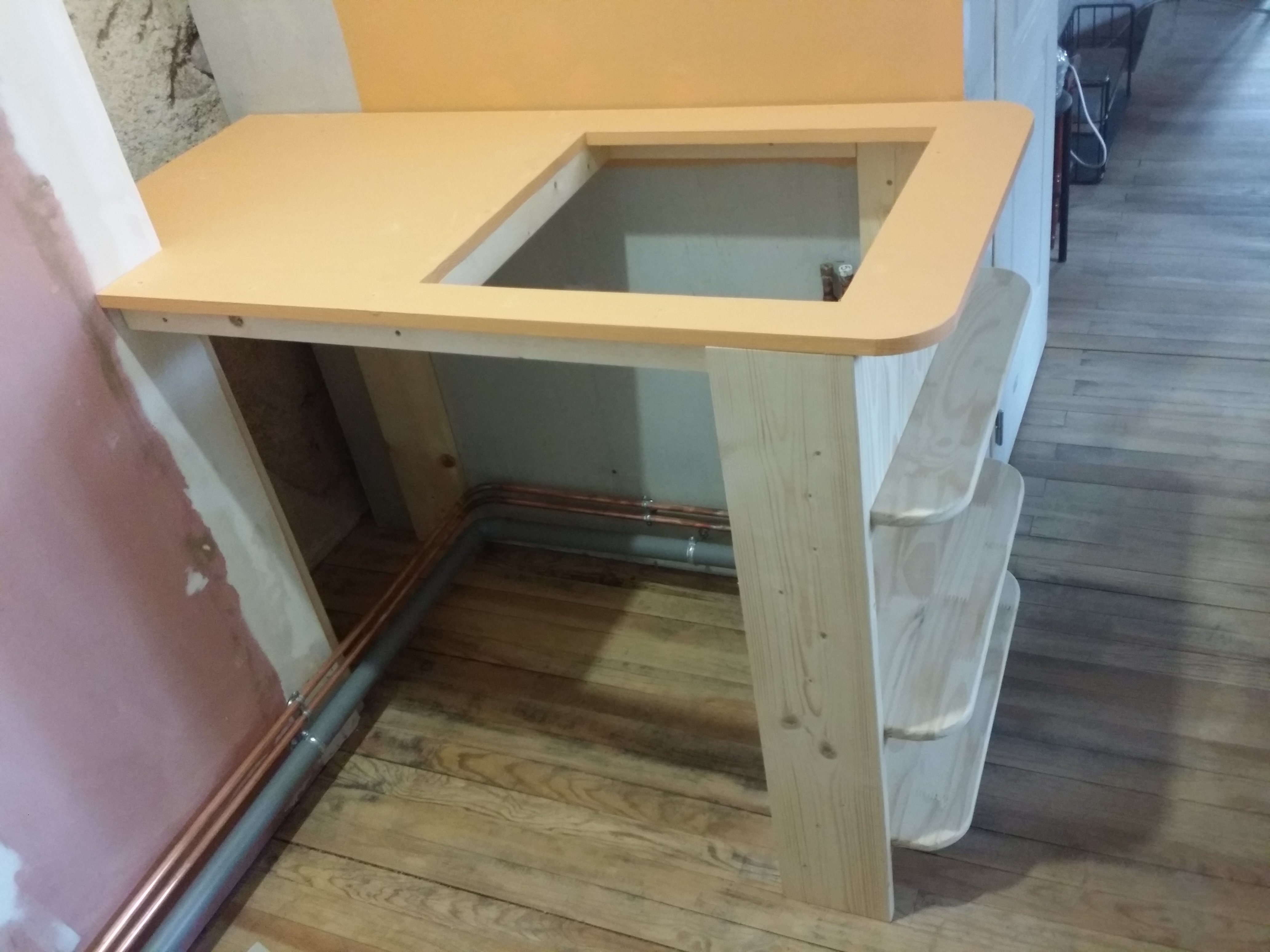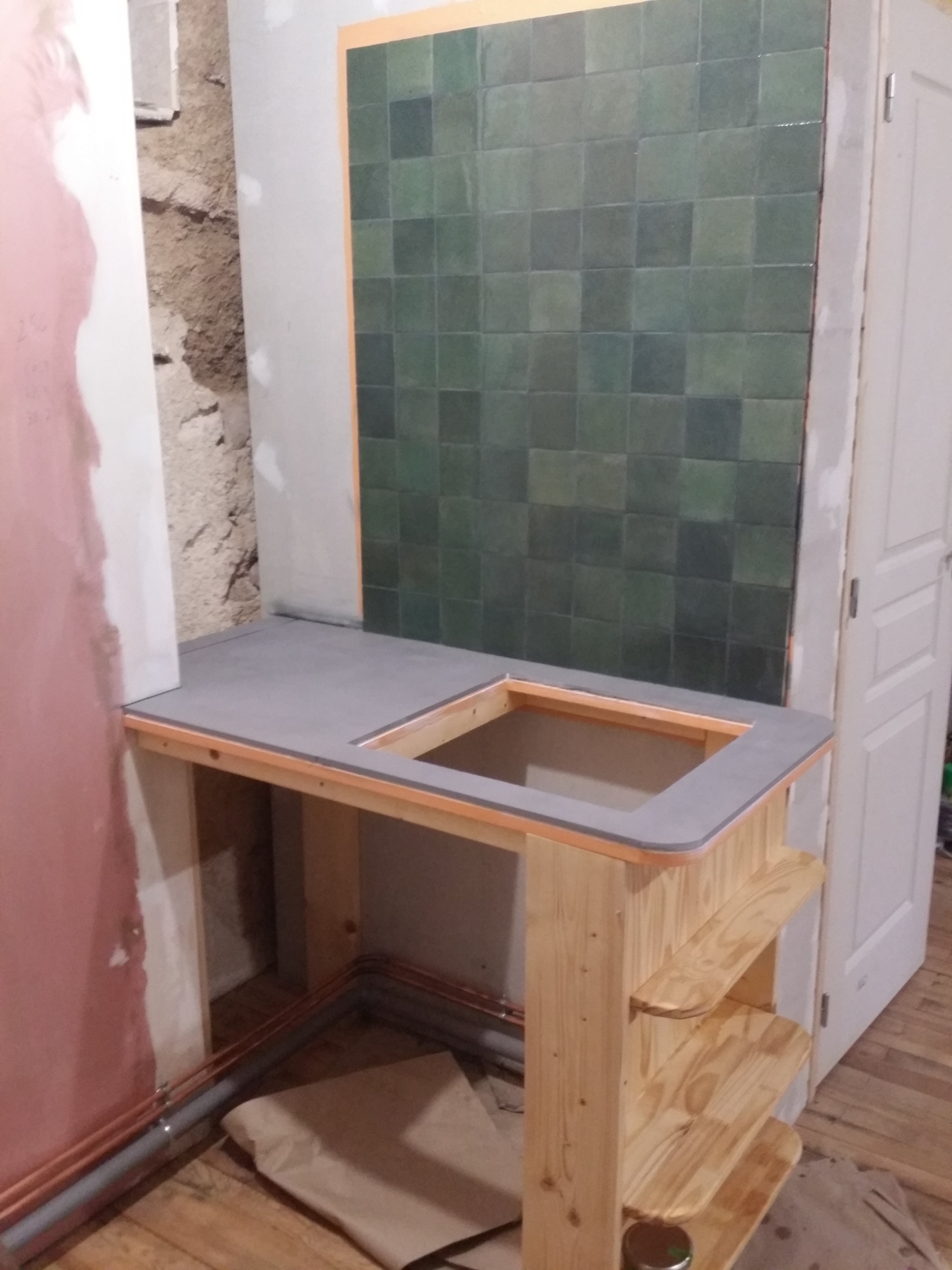 Première victoire, on vient de finir le plan de travail de l'étage, qui servira de point d'eau pour mon atelier (donc teintures, peinture, divers trucs salissants ET source de thé) et pour le coin "craft" personnel. Il fallait donc un truc solide, fonctionnel, calculé au cm près (à cause d'un coffrage de tuyau de poêle 3x plus gros que prévu), mais quand même joli... Allez, je te montre :