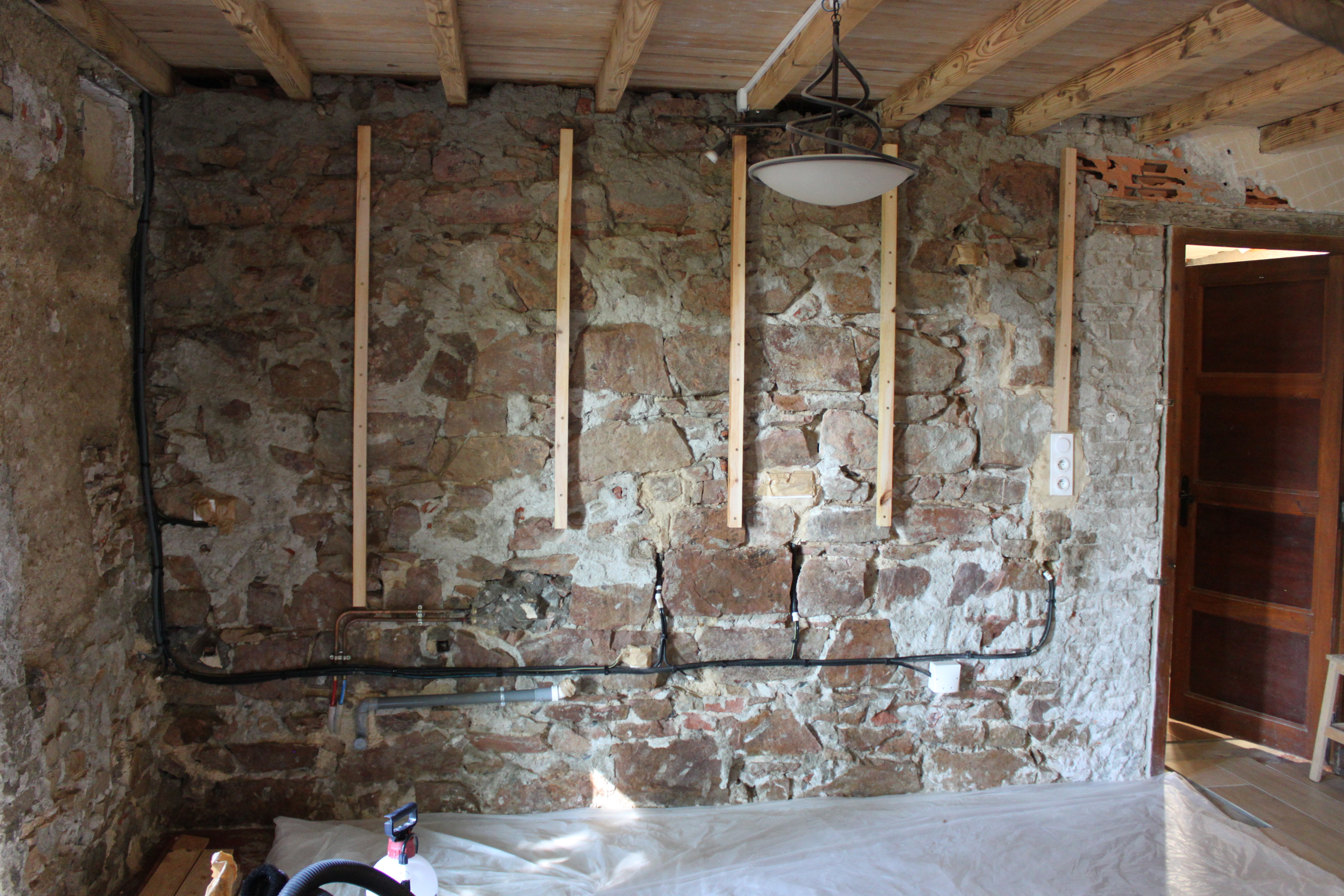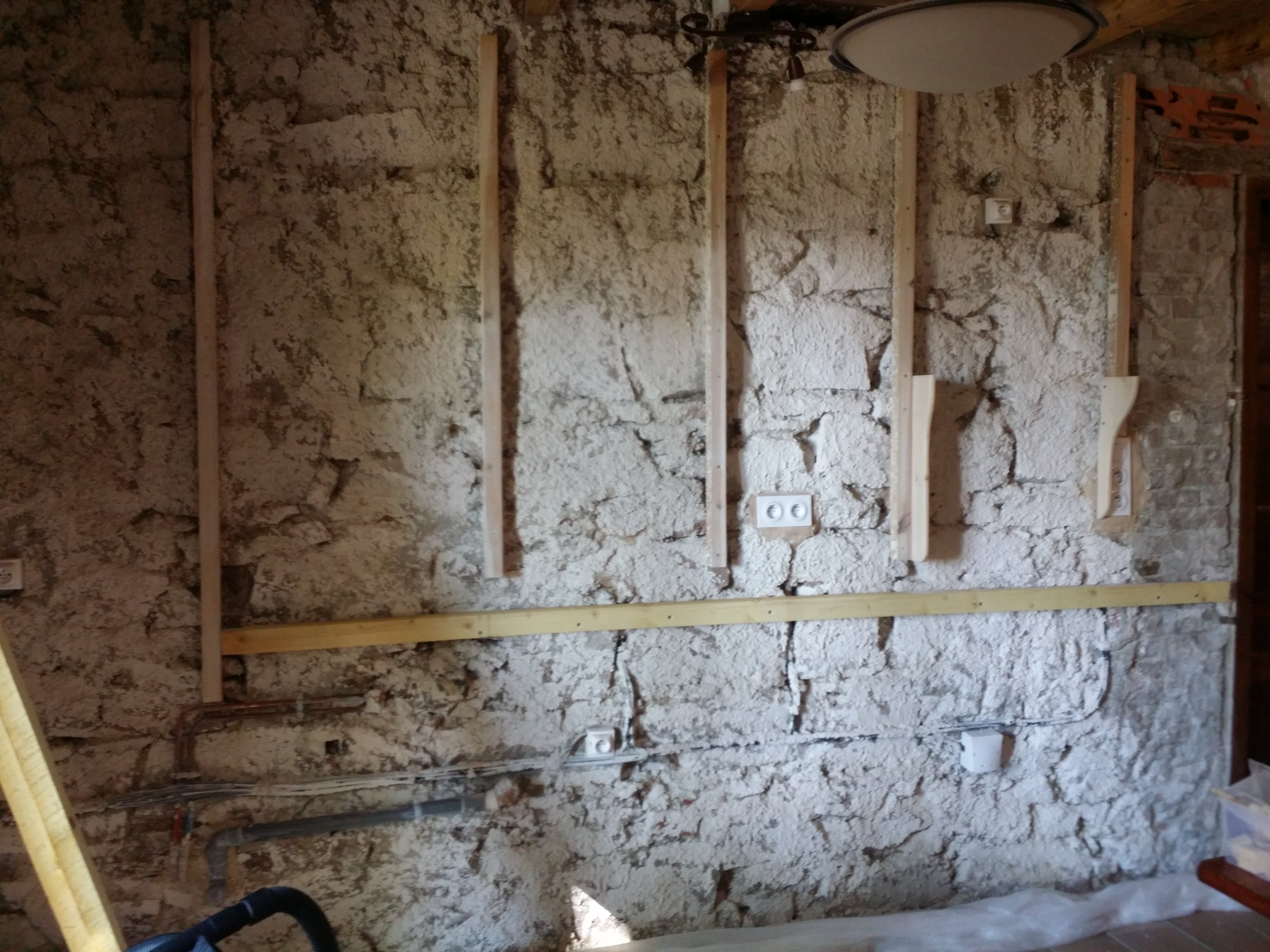 Bref, on reste sur le plan initial : on va visser des tasseaux au mur (en visant les pierres qui nous arrangent), on remplira d'enduit entre ces tasseaux, et ils nous serviront de support pour tout ce qu'on doit fixer au mur !