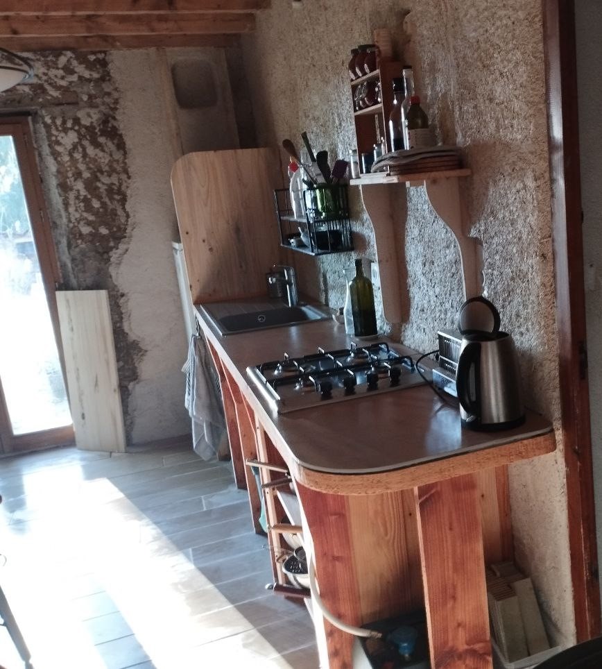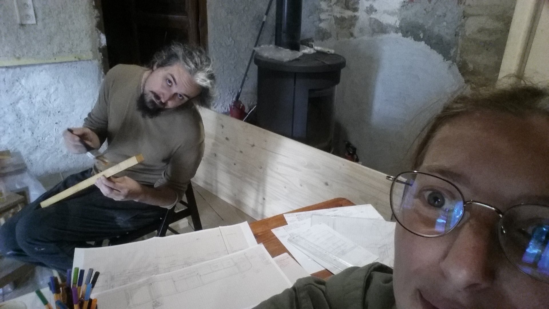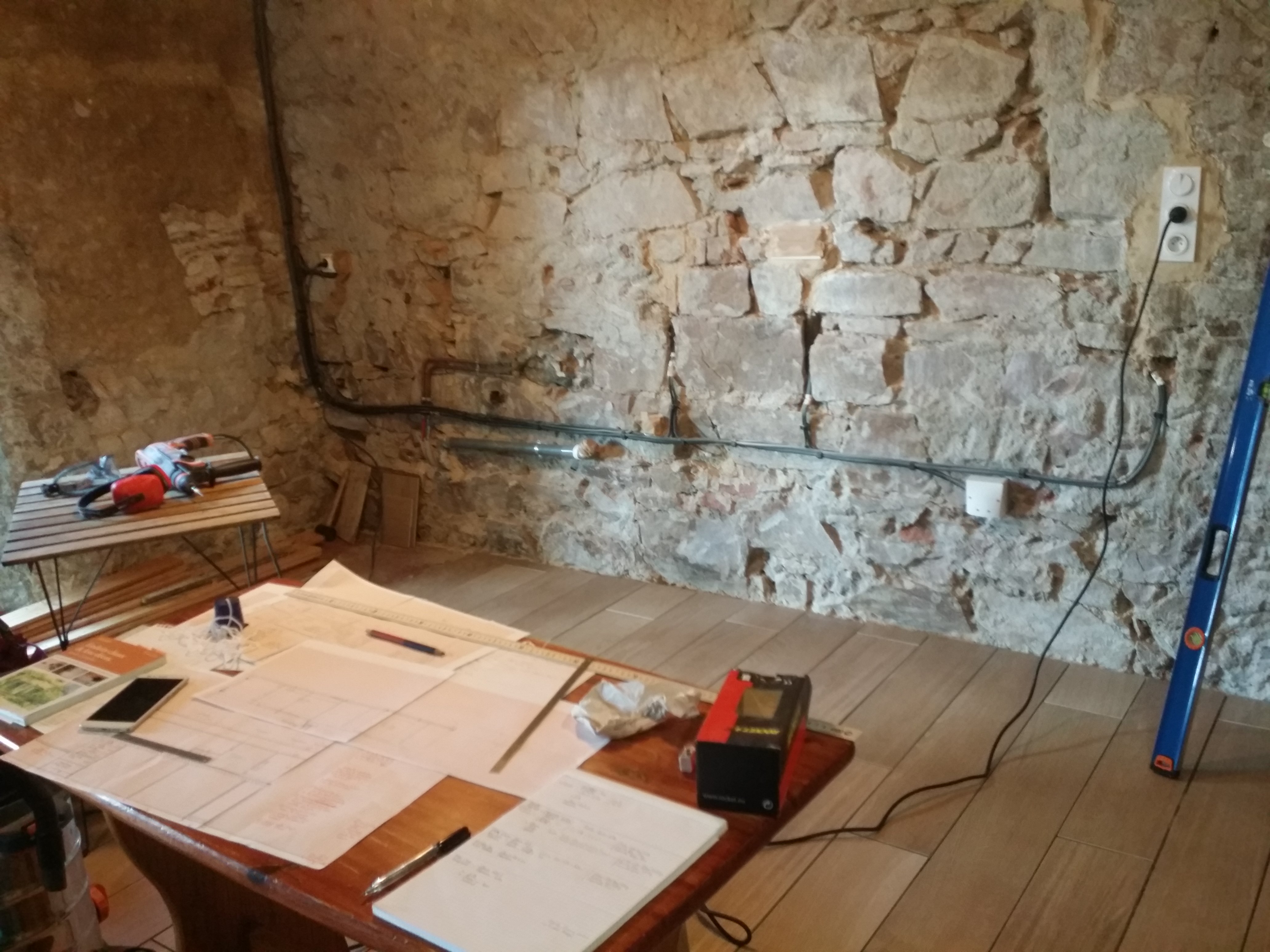 On a donc débuté la phase 3 "enduits et meuble de cuisine" par une petite vérification des plans ; ce qui a permis d'adapter tout ça aux murs pas droit, au sol pas droit, et aux pierres très inégalement larges (oui, et pas droites bien entendu).