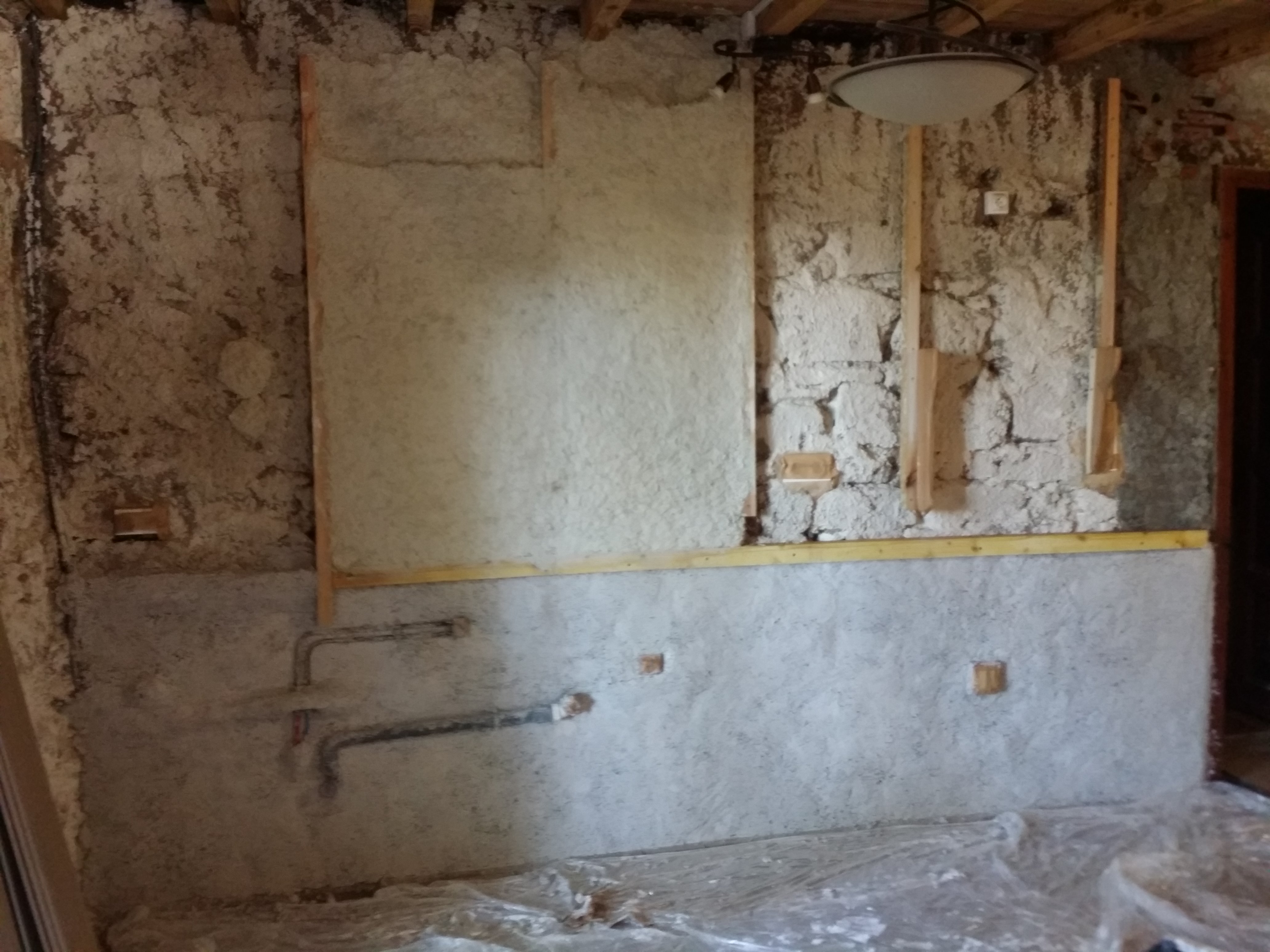 Ben oui parce que sur ce mur en pierre, on veut installer notre cuisine, donc des étagères et un plan de travail, et donc c'est bien de savoir où on perce : si on enduit d'abord, on ne saura plus si on perce dans une pierre ou dans les joints (qui ne tiendront pas la charge), ou encore une pierre trop petite ou trop au bord qui cassera...