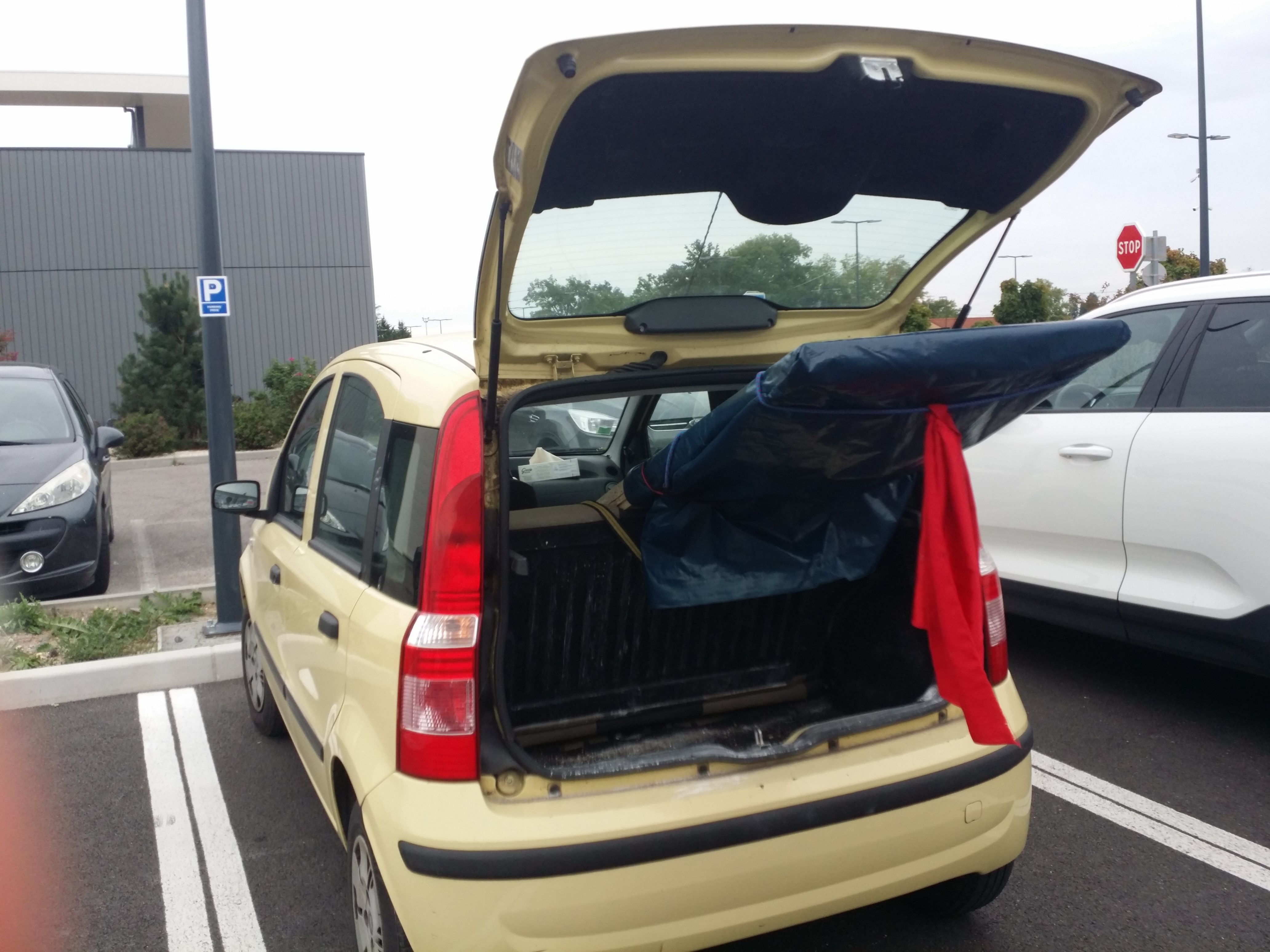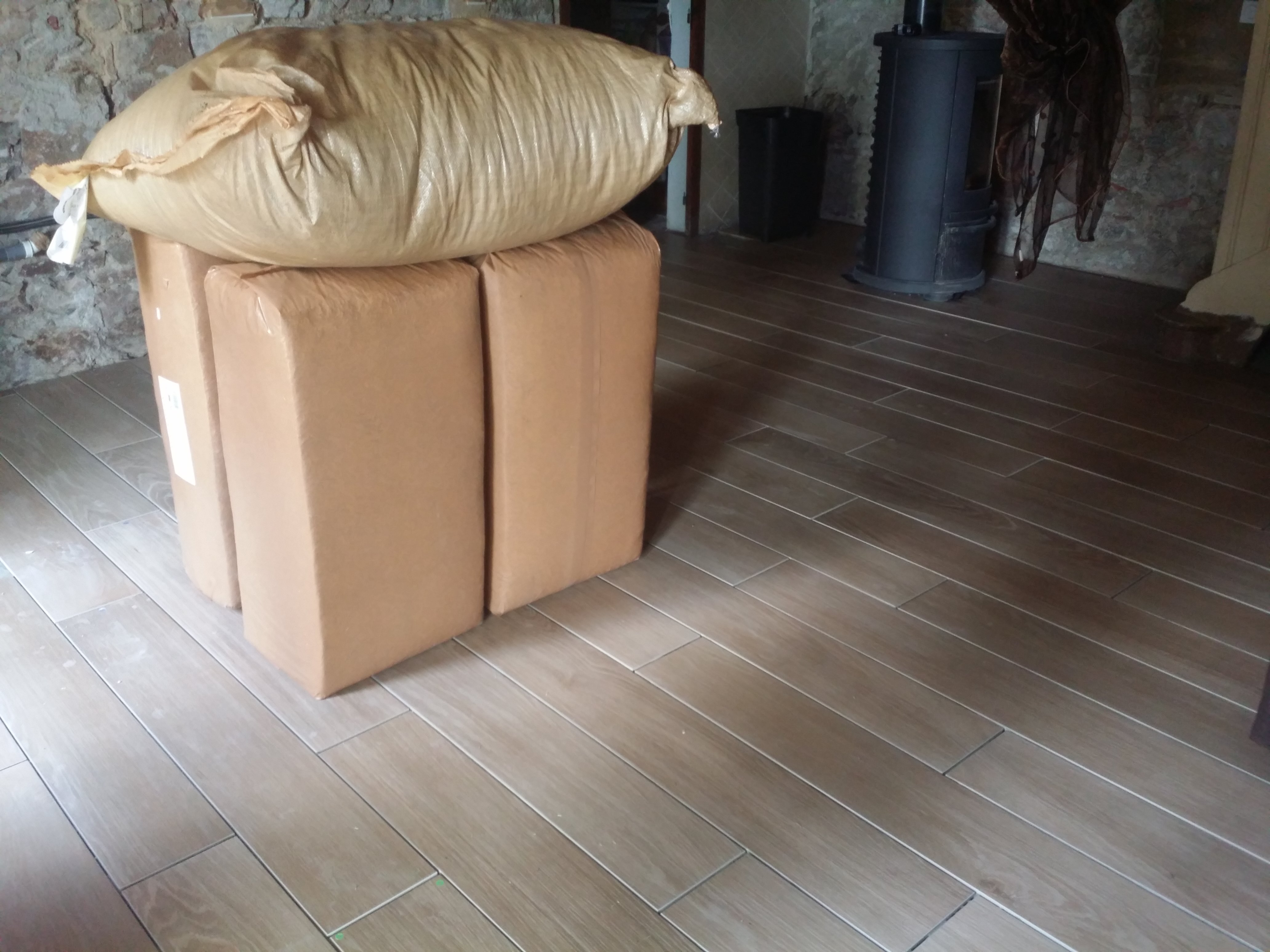 Pour l'étape suivante, on a eu la chance de finalement profiter d'un malheur initial : notre commande de deux GRANDES plaques de carrelage (oui seulement deux, parce que c'est cher ces machins) étant arrivée, heu...