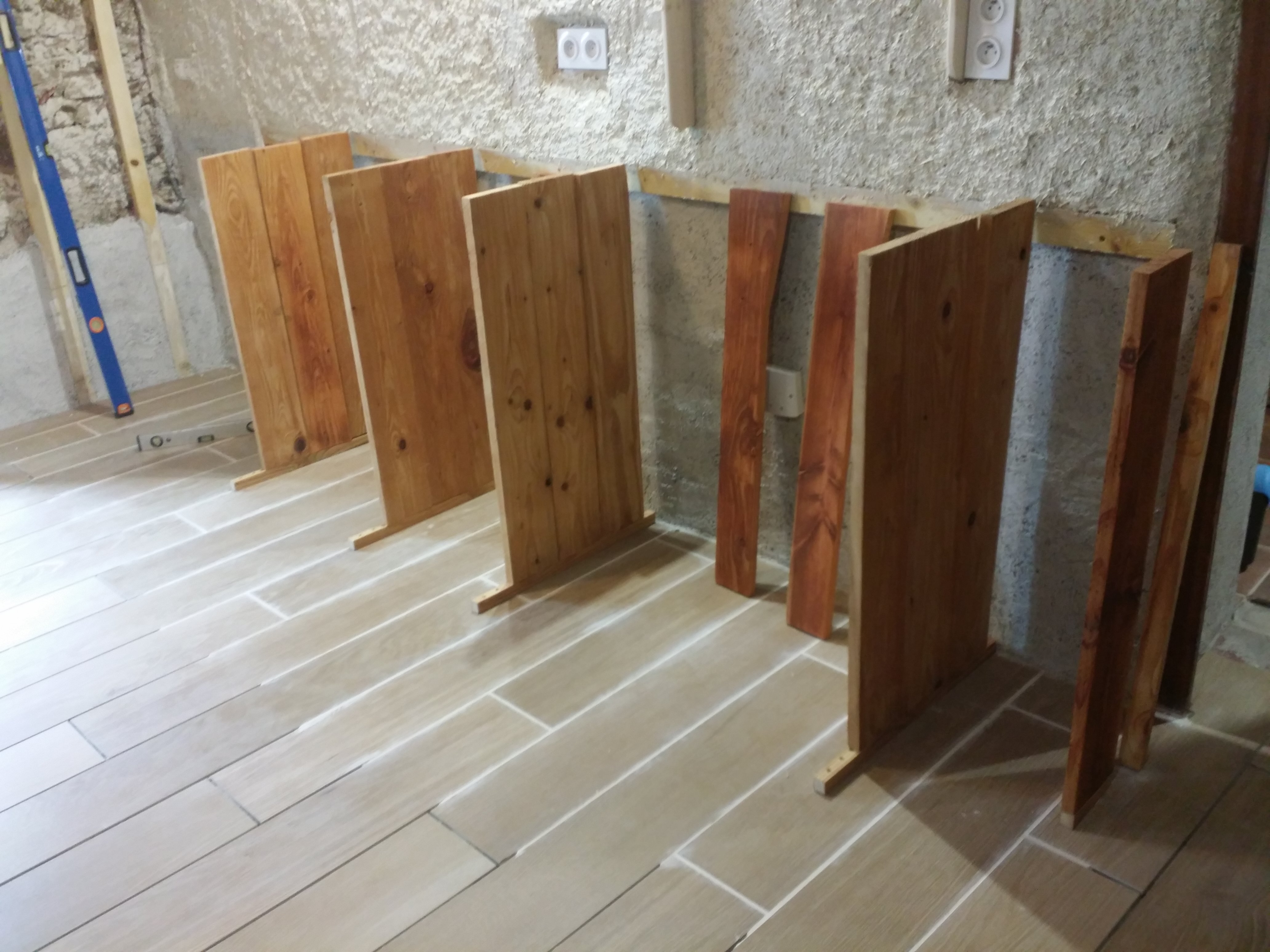 Bon et puis bien sûr, comme on utilise des planches de récup (les étagères du local RAJR sont réincarnées sous notre plan de travail !), il a fallu beaucoup de tri, de coupe, de nombreuses heures de ponçage, huilage, séchage... (Et re-re-réadaptation des plans bien entendu).