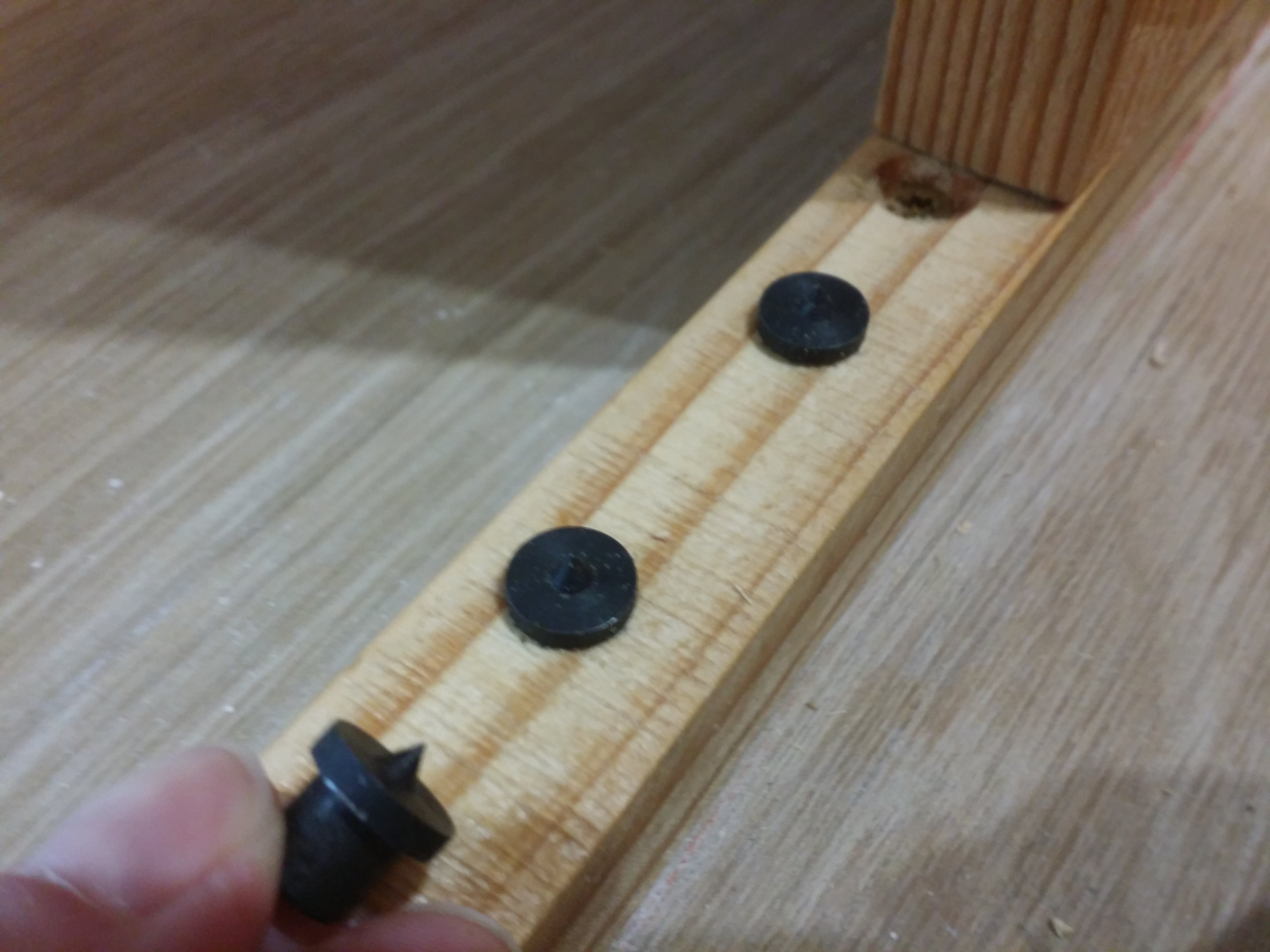 On a aussi fait connaissance avec la consommation industrielle de tourillons en bois, et la découverte de ces merveilleux outils que sont les centreurs-pointeurs-personne-les-nomme-pareil, mais c'est MAGIQUEMENT la réponse à mes "screugneugneu faudrait un truc à ficher dans le trou pour marquer l'emplacement du trou d'en face" ! Je les aime d'amour. Ouioui.