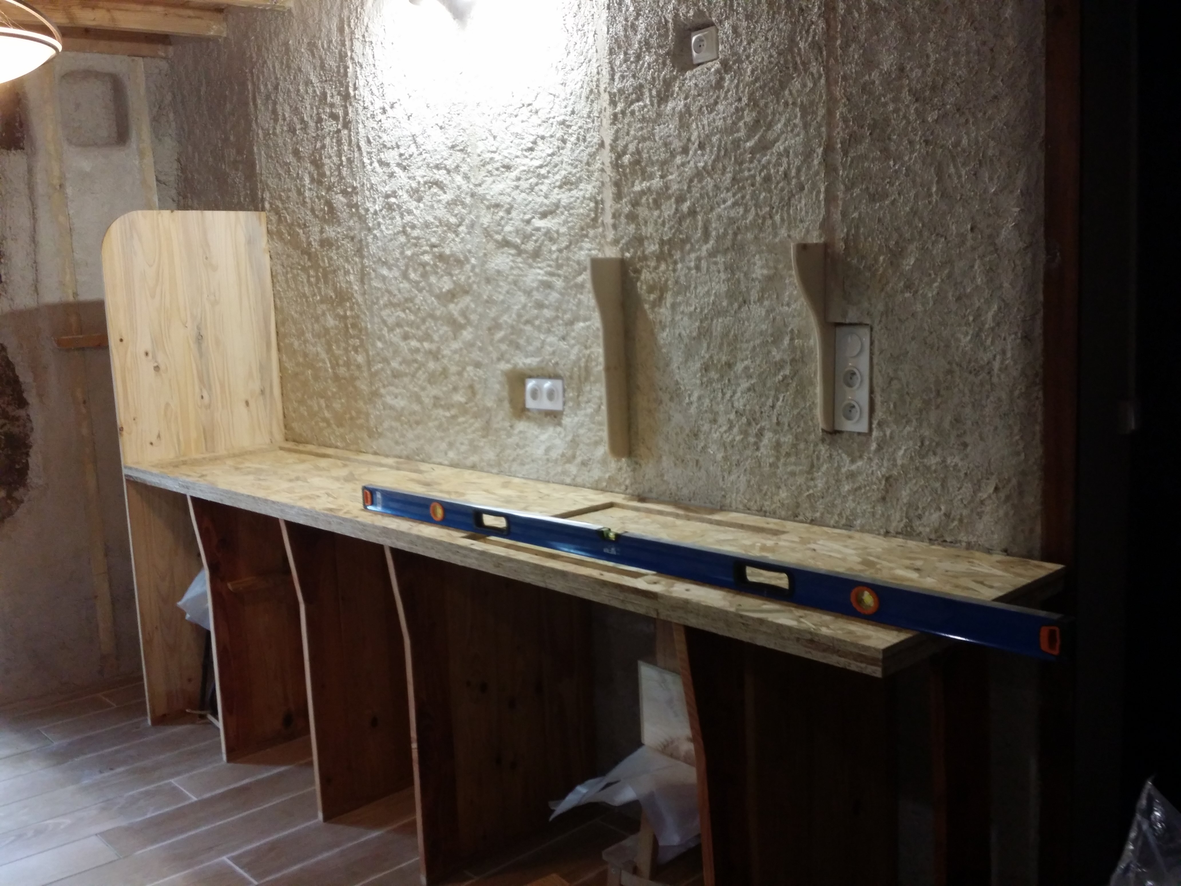 Mais ça monte petit à petit, on pense bien à prévoir les petits détails qu'on ne pourra plus faire par la suite (comme les petits bouts à la verticale pour protéger la zone gaz, là) ; le plan de travail même est fait de 3 couches d'OSB collées et vissées (COS-TAUUUUD), on sent qu'on pourra monter dessus sans que ça bouge :D