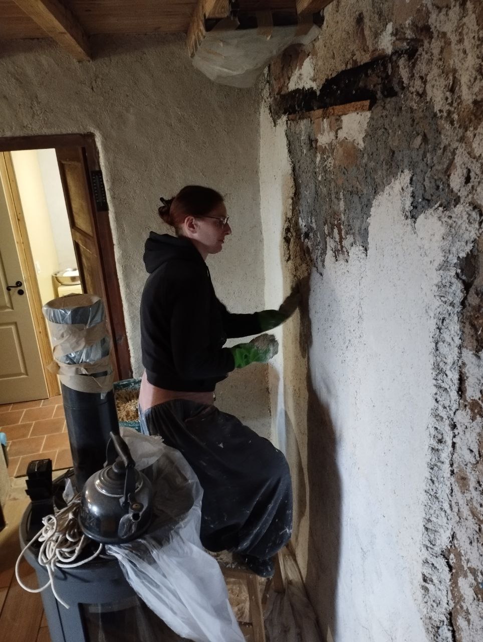 Niveau enduits, on est pour cette pièce sur une base chaux aérienne (pour gérer l'humidité au mieux) et sable de pierre ponce (là aussi pour gérer l'humidité au mieux), avec en plus du chanvre pour le confort thermique (les fameux enduits "chaux chanvre" dont on entend souvent parler, qui apportent une légère isolation, restent respirants pour les murs anciens, et apportent un confort au niveau "sensation de paroi tiède").